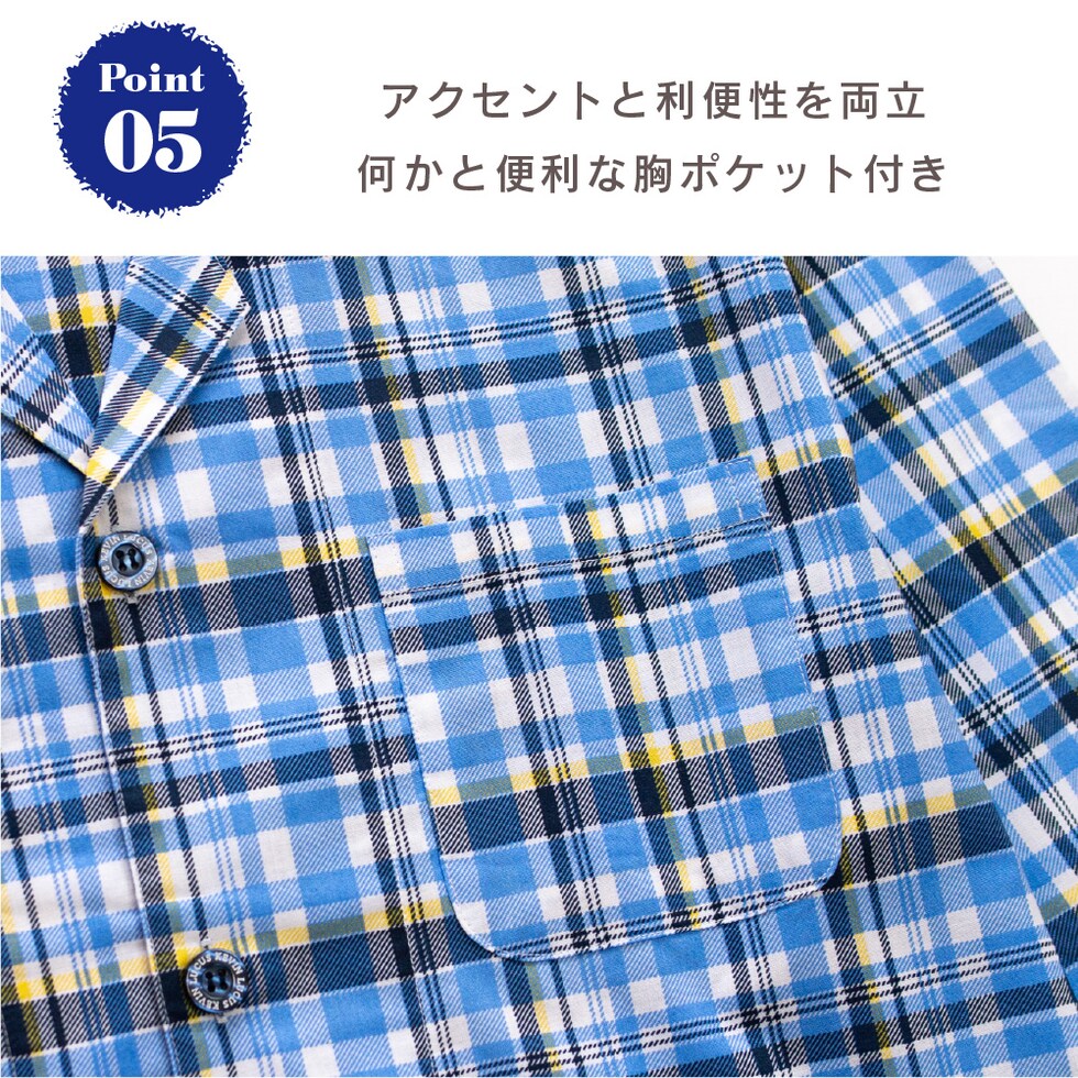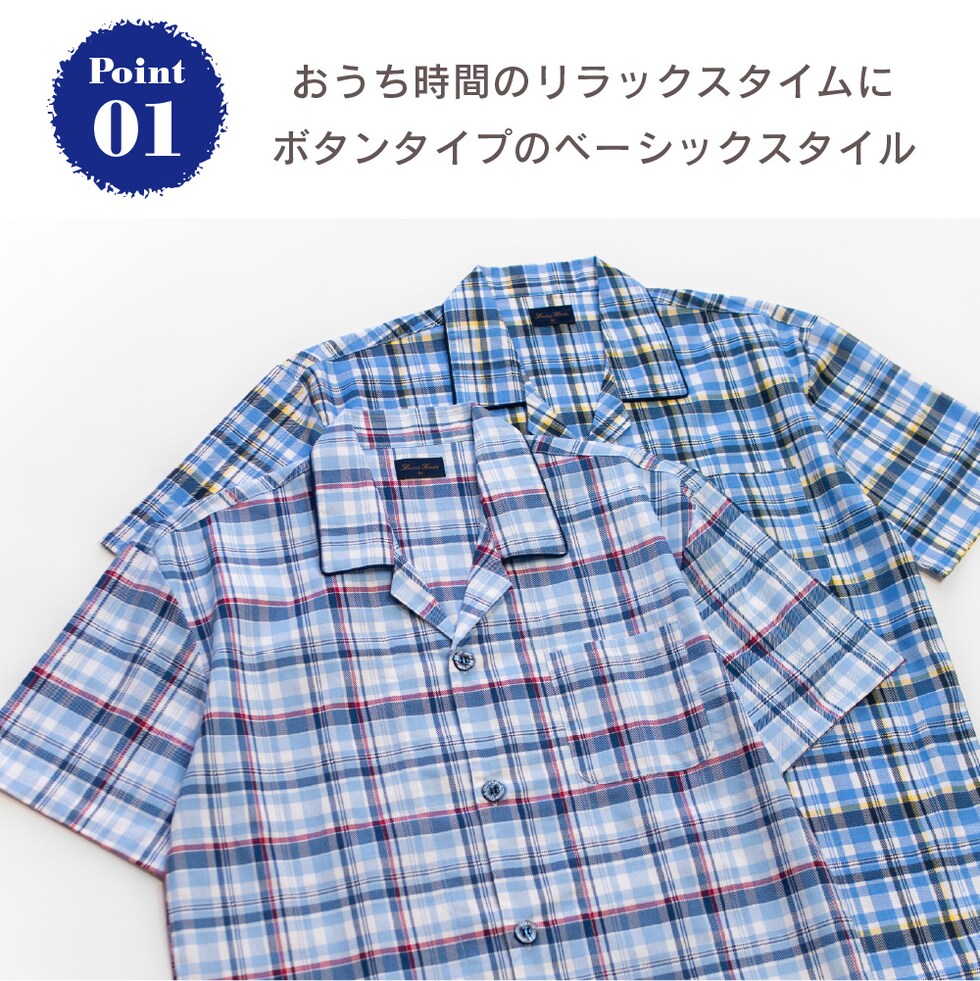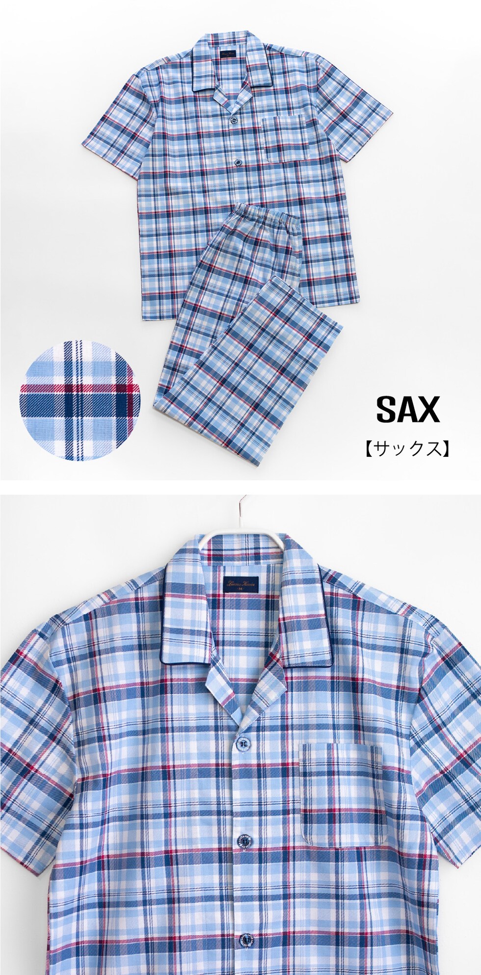 パジャマ メンズ 綿100% 半袖 夏向け 前開き チェック柄 薄手のシャツ ブルー サックス M L LL おそろい プレゼント 父の日