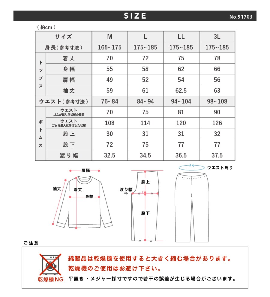 『 綿製品 』は乾燥機を使用すると、大きく縮む場合がありますので、 乾燥機のご使用はお避け下さい。 |