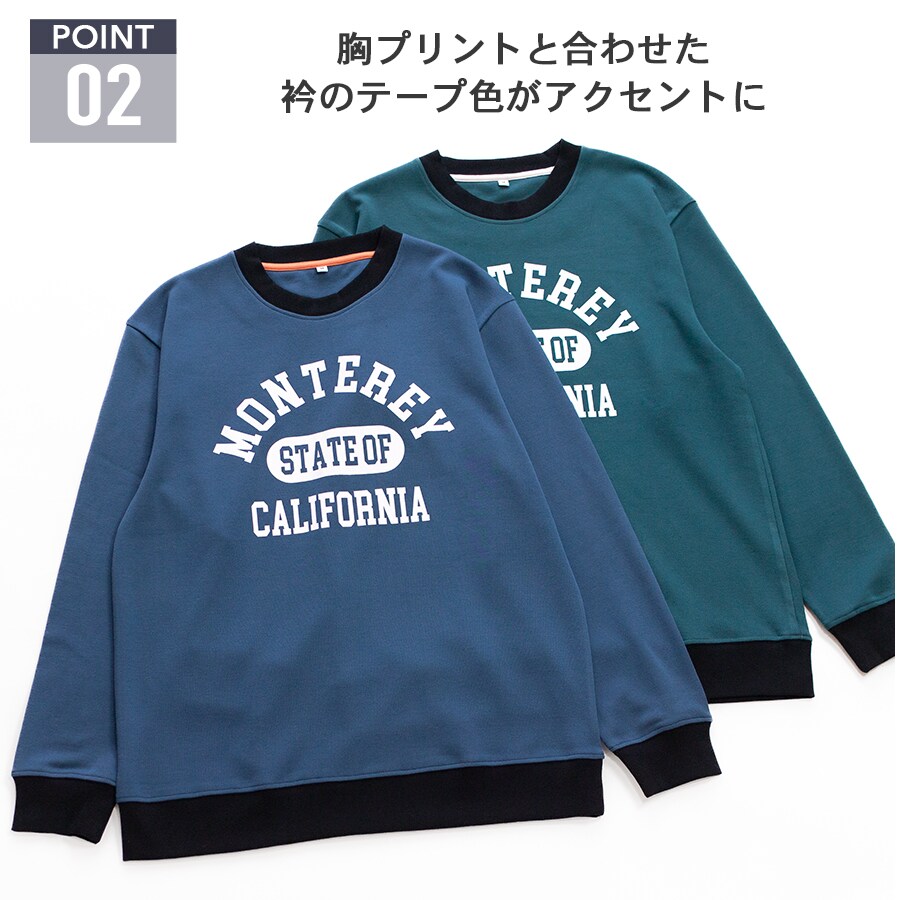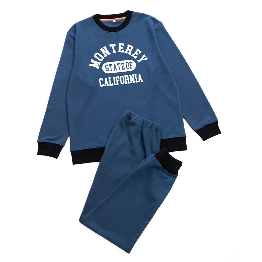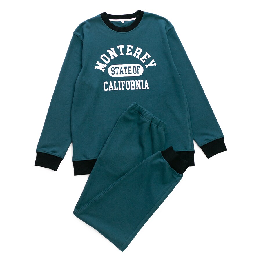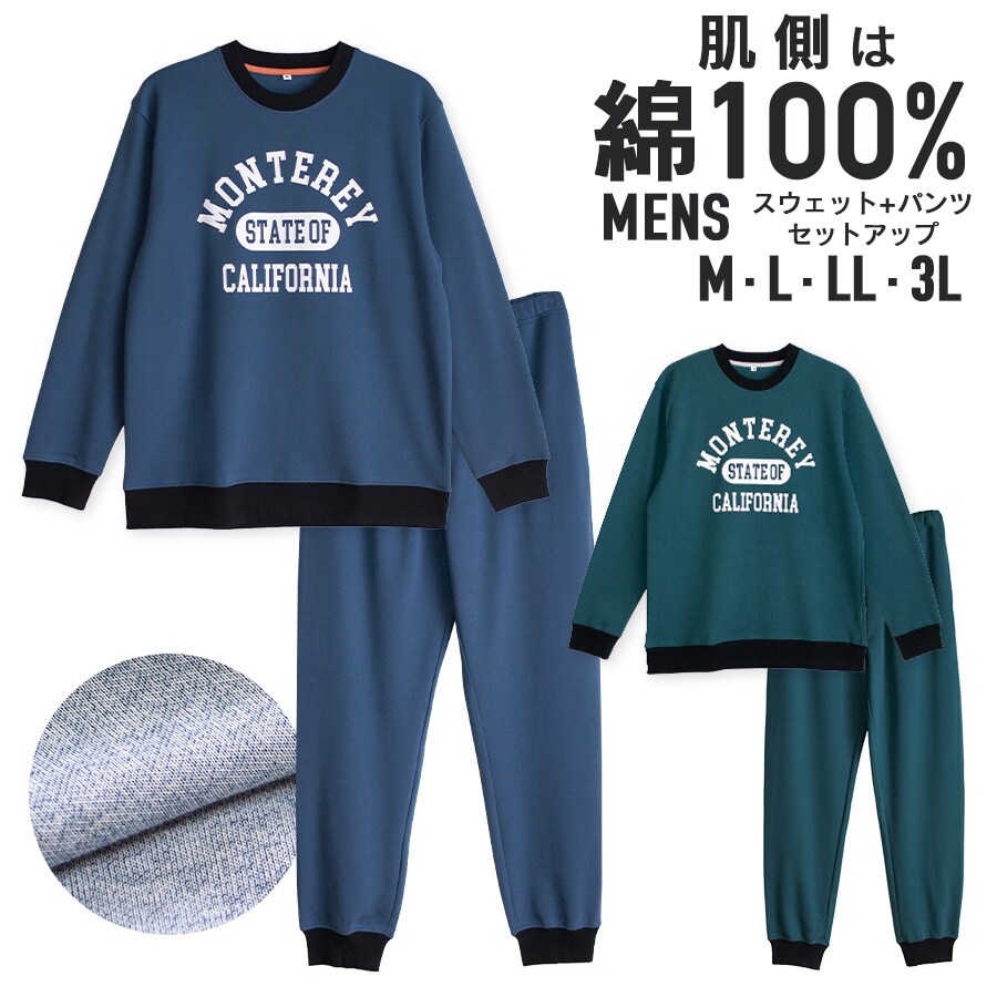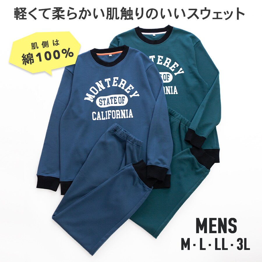 パジャマ キッズ メンズ 内側が綿100% 長袖 春 秋向き スウェット上下 リブ仕様 カレッジプリント ブルー ダークグリーン M L LL 3L 親子 おそろい