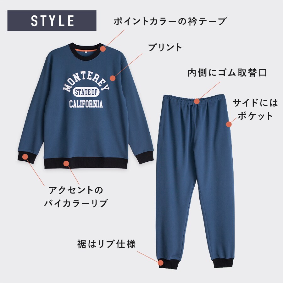 やわらかくて軽く、適度な伸縮性と保温性があります。 おすすめ着用時期は、春・秋です。 リブ部分の色を変えてアクセントにしてさらに胸にカレッジロゴプリントを施しました。 滑らかな肌触りのスウェットパジャマです。 袖口とパンツの裾口はリブなので上にずりあがらず少しサイズが大きめだったとしても大丈夫です。 プリント違い、同素材のキッズサイズもございます。 |