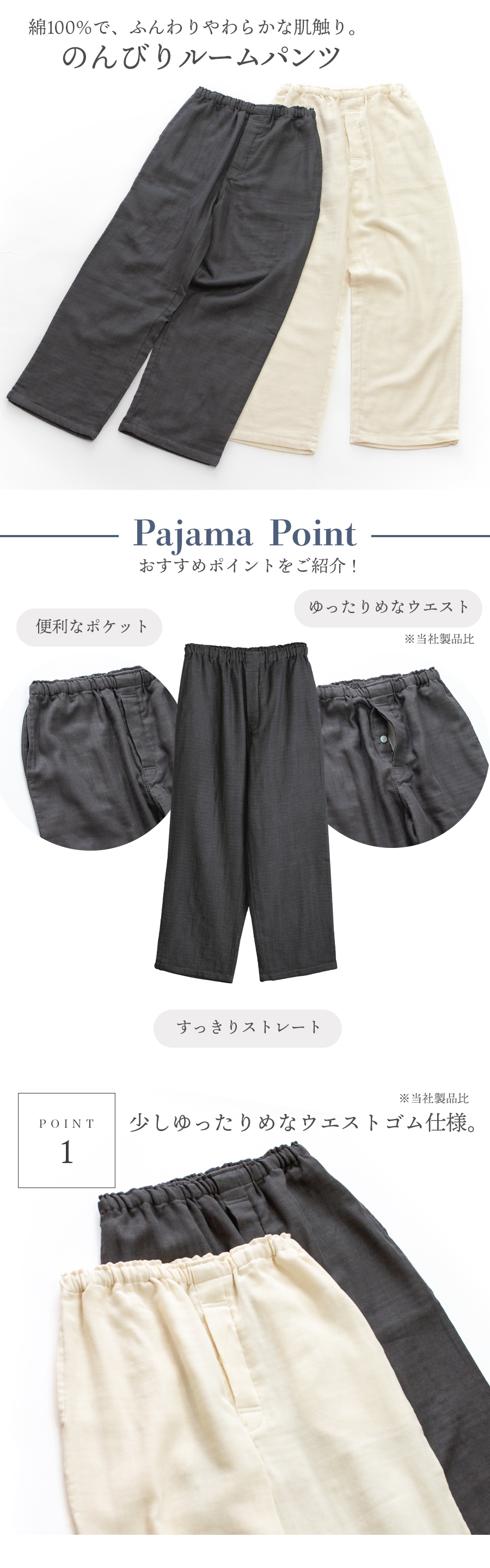 商品説明 吸水性がよい綿100%のガーゼを3枚重ねて、1枚の生地にふっくらと仕上げたトリプルガーゼの単品ルームパンツです。