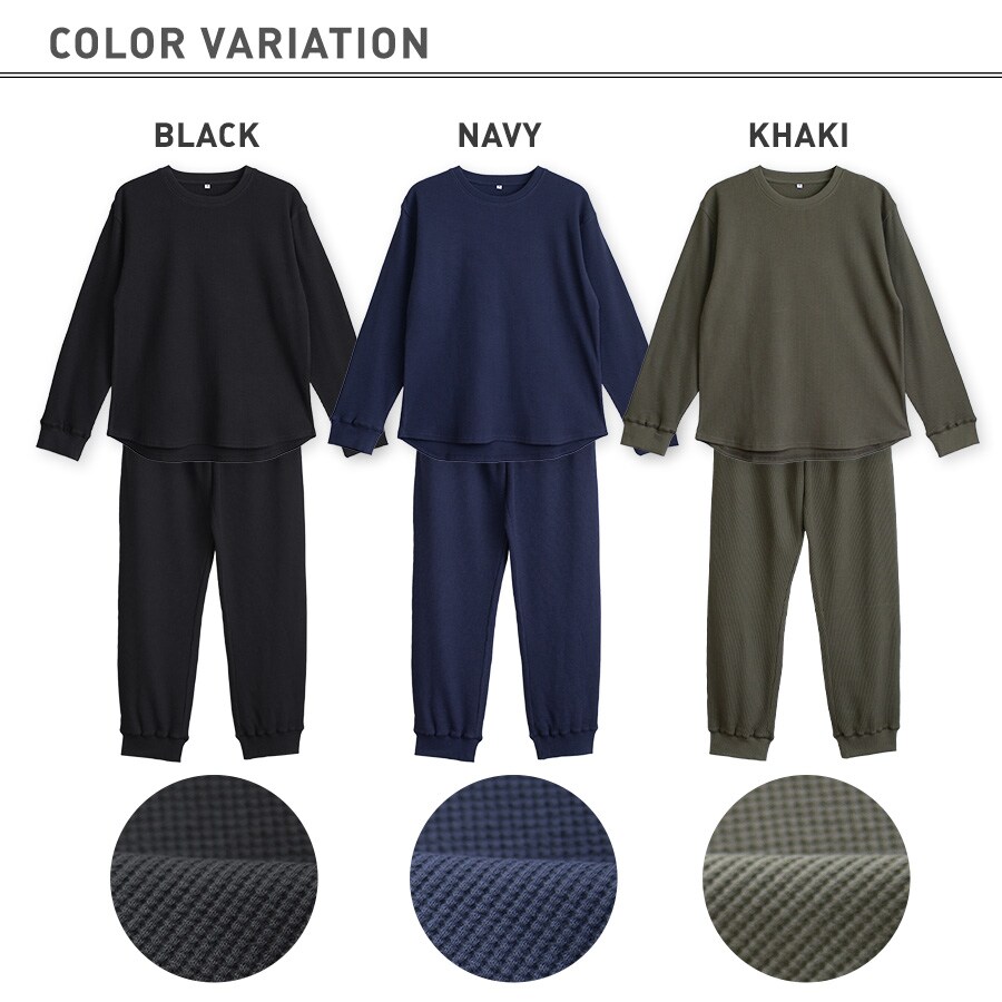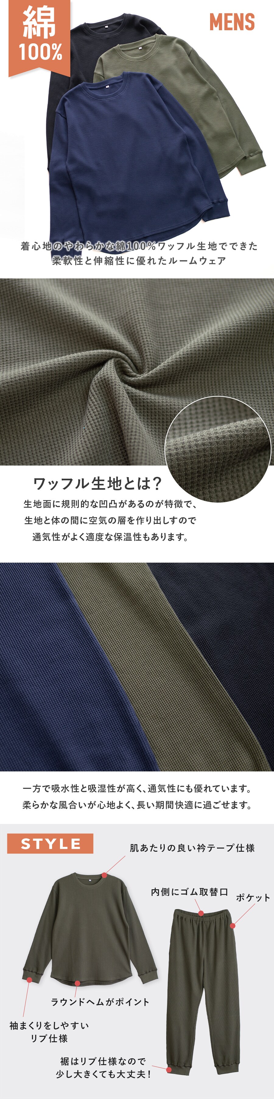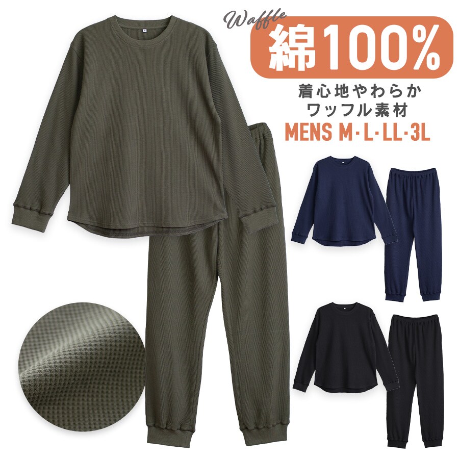 パジャマ メンズ 綿100% ワッフル 長袖 春 秋 カットソー 上下 リブ仕様 無地 ネイビー ブラック カーキ M L LL 3L ハニカム サーマル 親子 おそろい リンクコーデ ギフト プレゼント 父の日 51w21