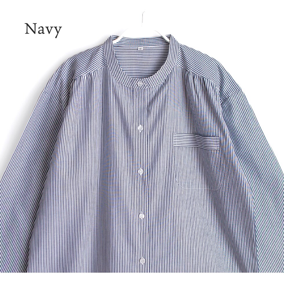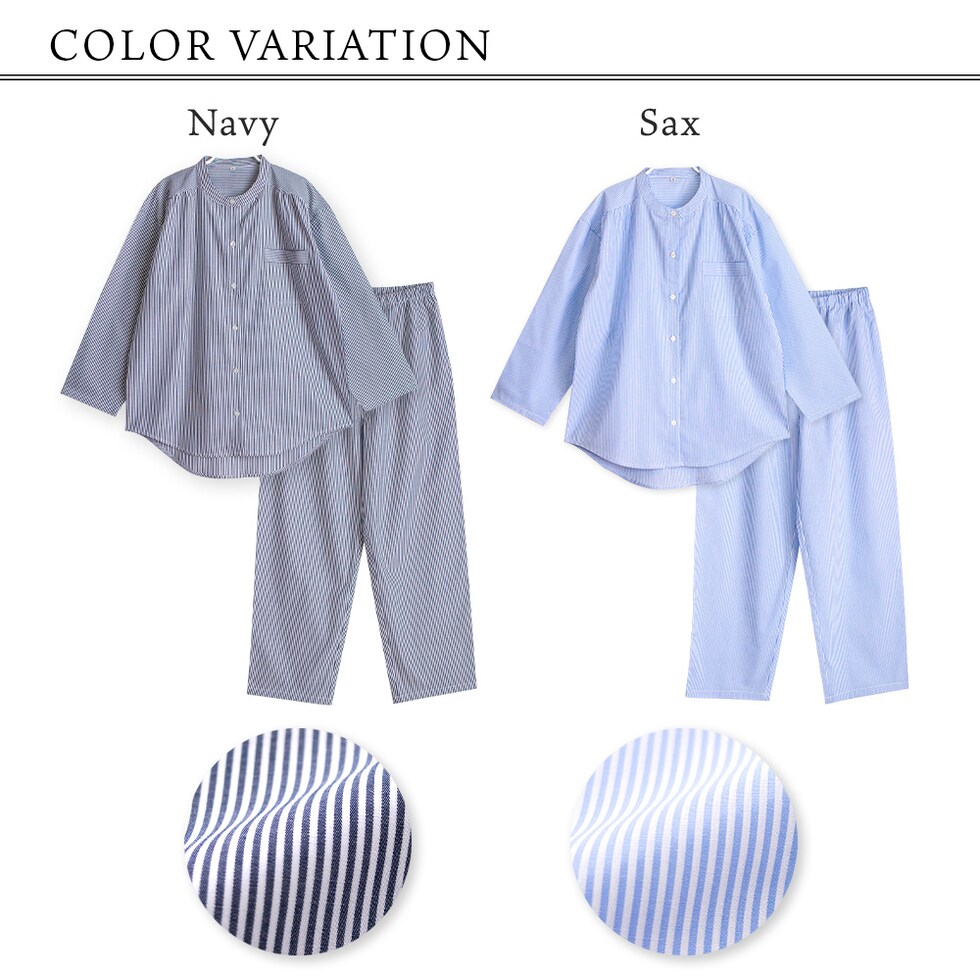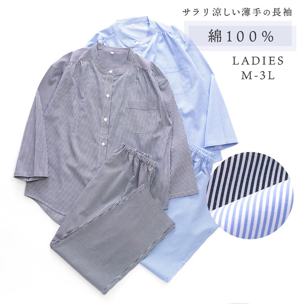 パジャマ レディース 綿100% 長袖 春 夏 前開き シャツ 細ストライプ バンドカラー 前開き シャツ ネイビー サックス M L LL 3L 先染め おそろい プレゼント 母の日