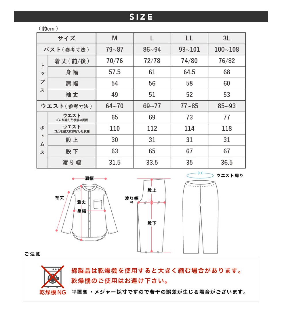 『 綿製品 』は乾燥機を使用すると、大きく縮む場合がありますので、 乾燥機のご使用はお避け下さい。 |