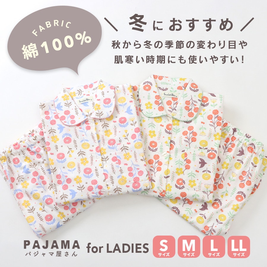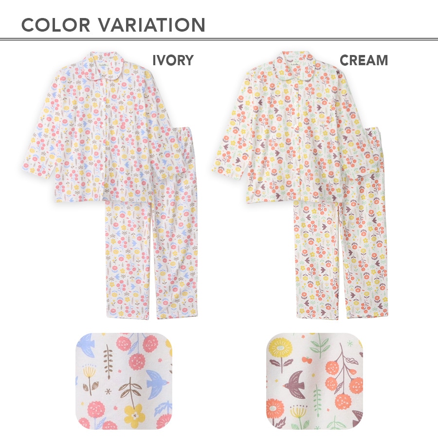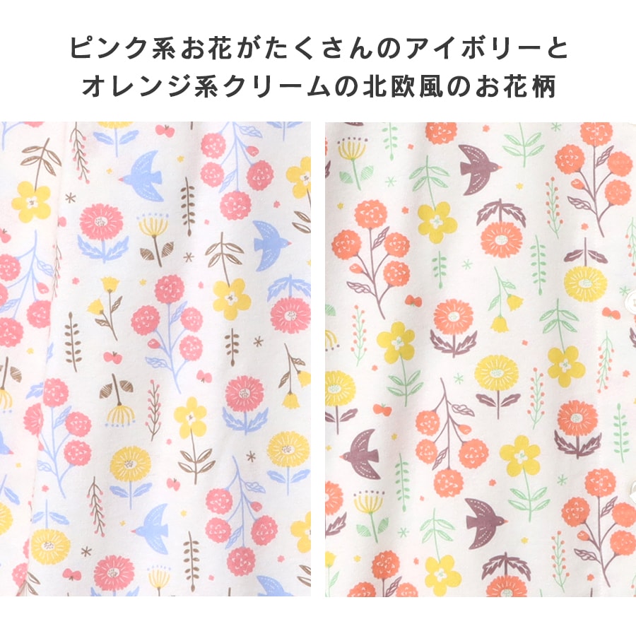 パジャマ レディース 綿100% 長袖 冬向き 前開き ネル起毛 前開き 北欧風のお花柄 アイボリー クリーム S M L LL 3L 4L 5L かわいい 親子 おそろい 61175