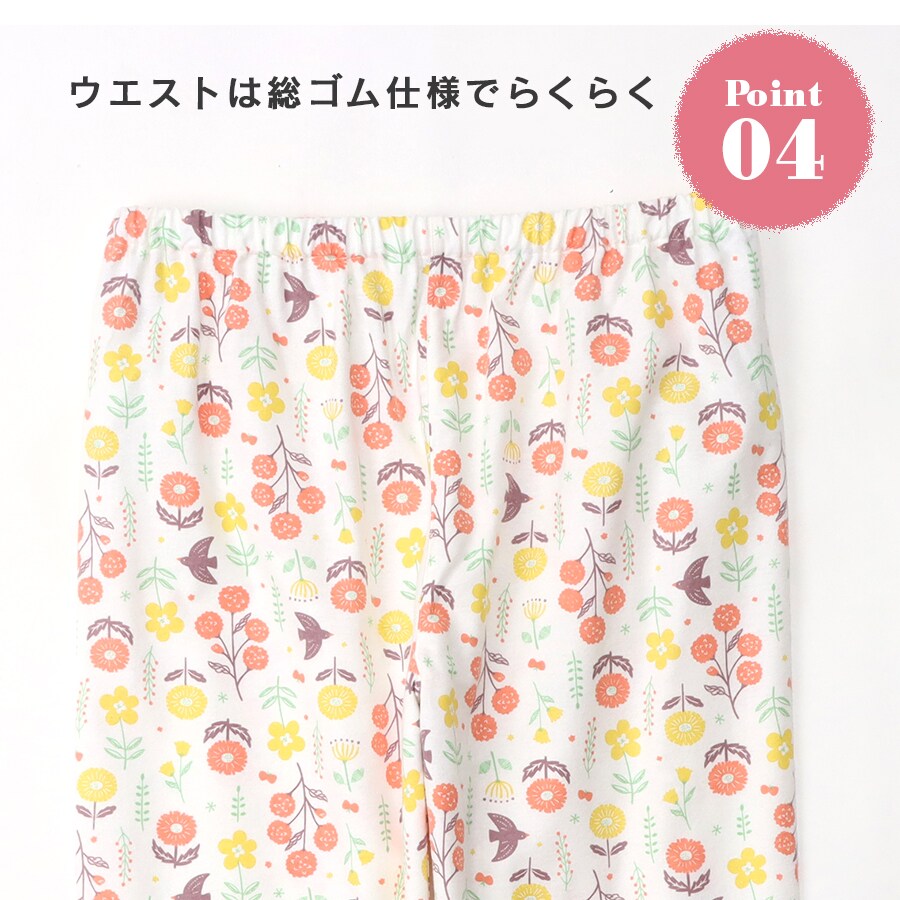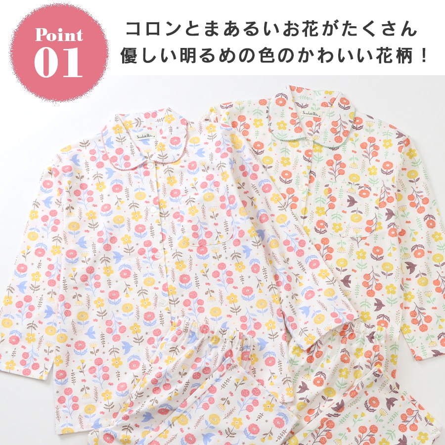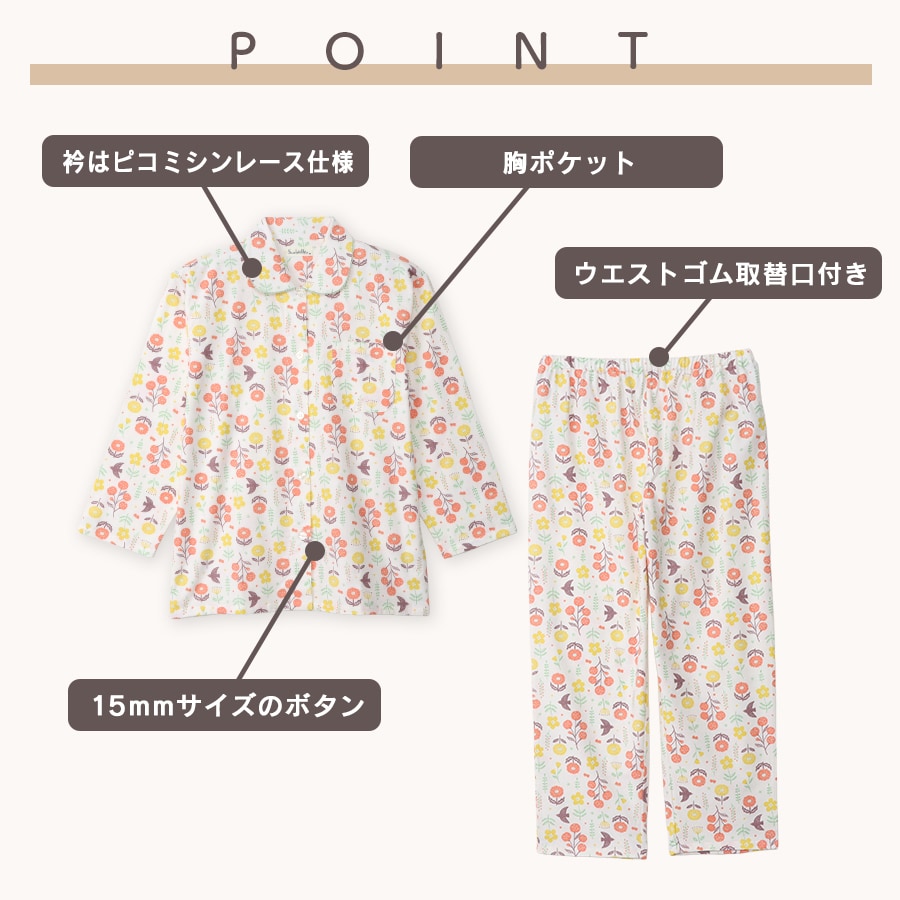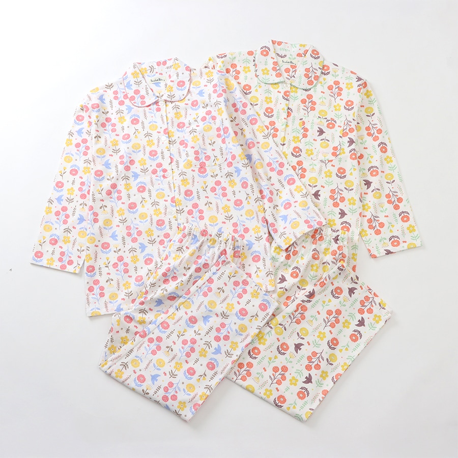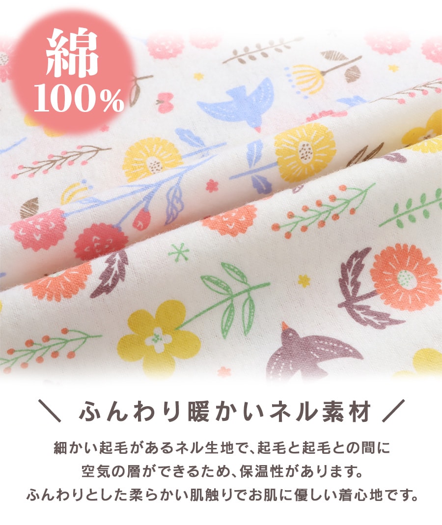 冬に丁度良い厚さの綿100% ネル起毛 ふんわりとした柔らかい肌触りで、お肌に優しい着心地です。 細かな起毛があるため保温性があります。 コロンとまあるいお花がたくさん優しい明るめの色のかわいい花柄!北欧風のお花柄のパジャマです。 キッズサイズもあるので、おそろいリンクコーデが楽しめます |