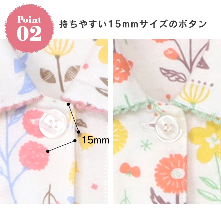 トップス仕様:長袖/丸衿/ピコミシンレース仕様/胸ポケット パンツ仕様 :長パンツ/ウエスト総ゴム/ゴム取替口 |