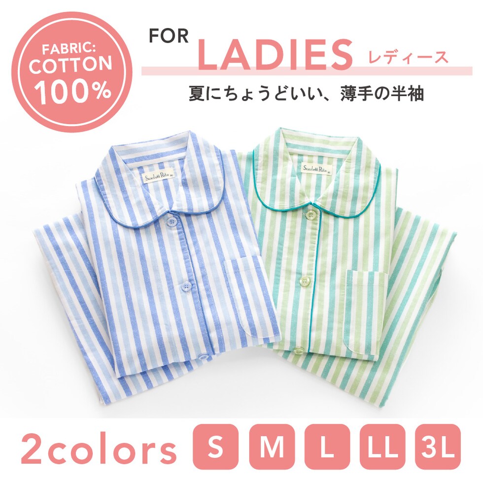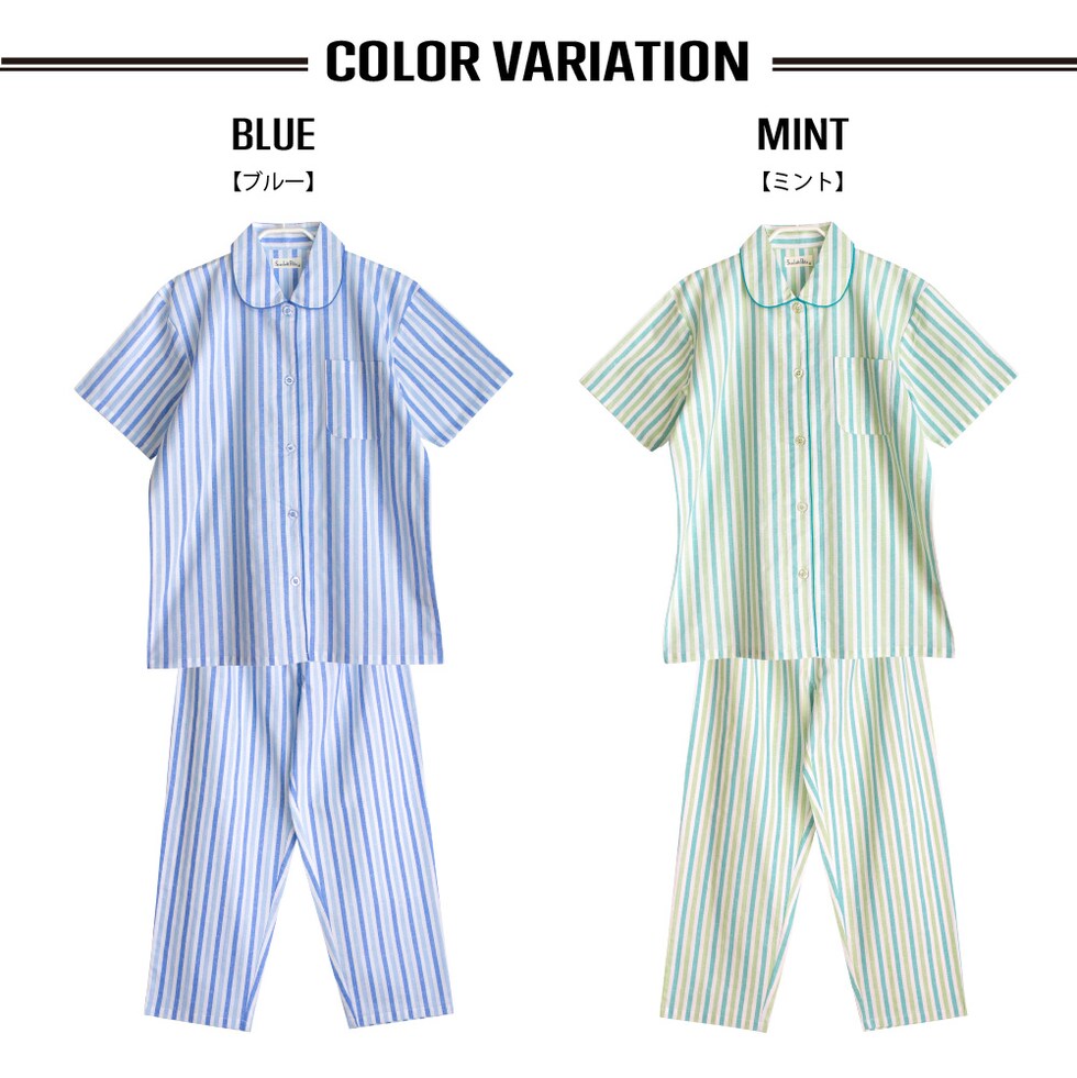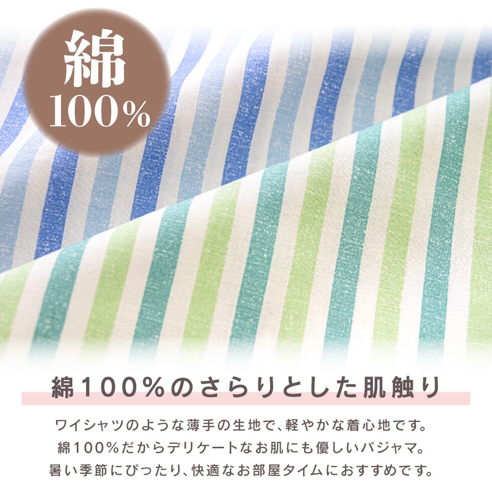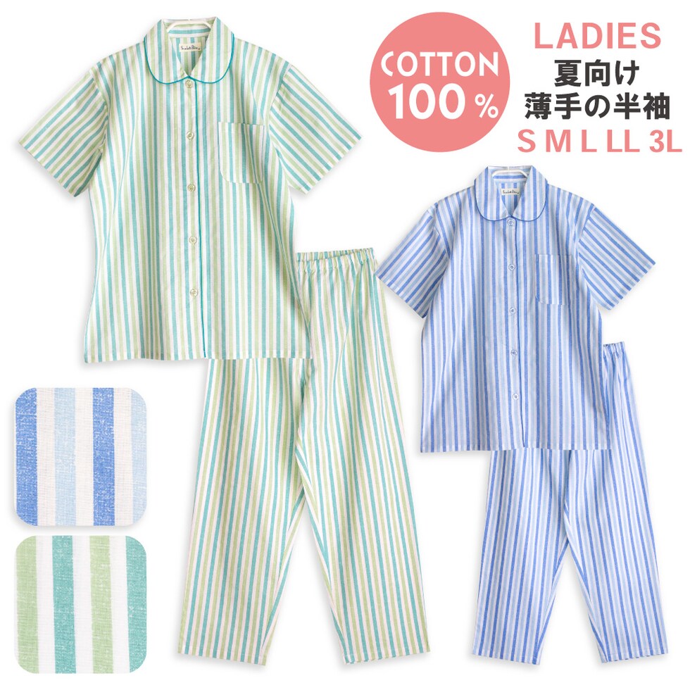 パジャマ レディース 綿100% 半袖 夏向け 前開き ストライプ柄 薄手のシャツ ブルー ミント S M L LL 3L おそろい プレゼント 母の日