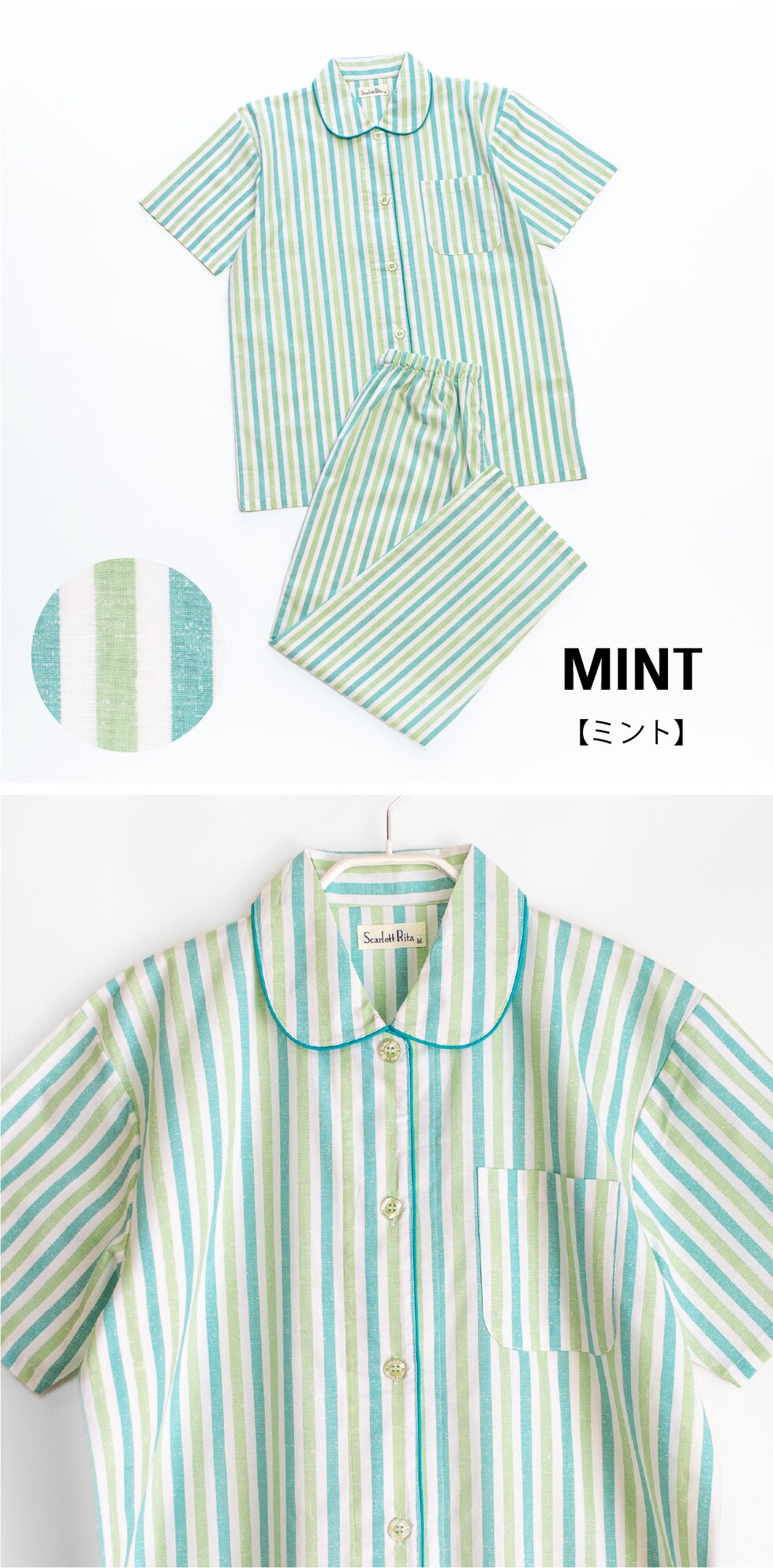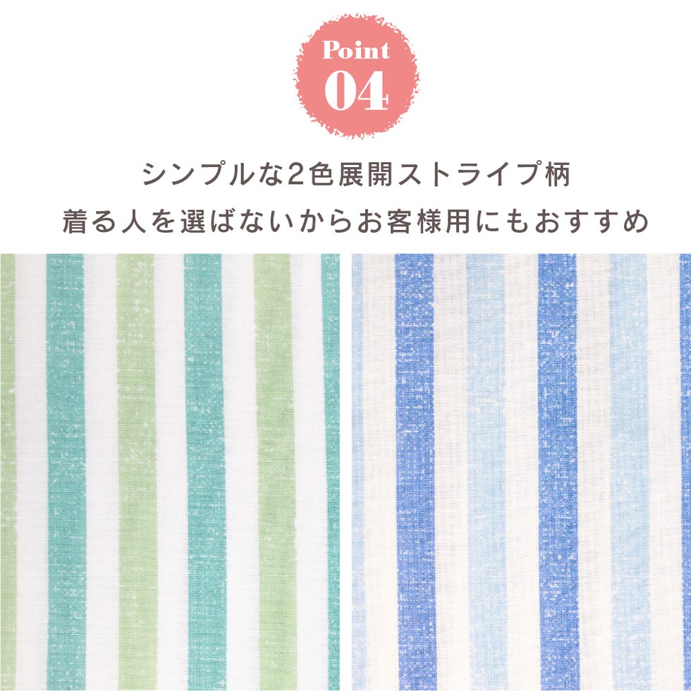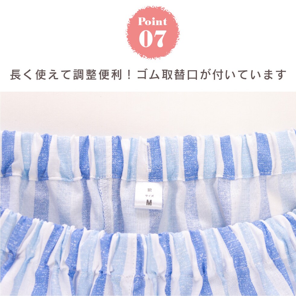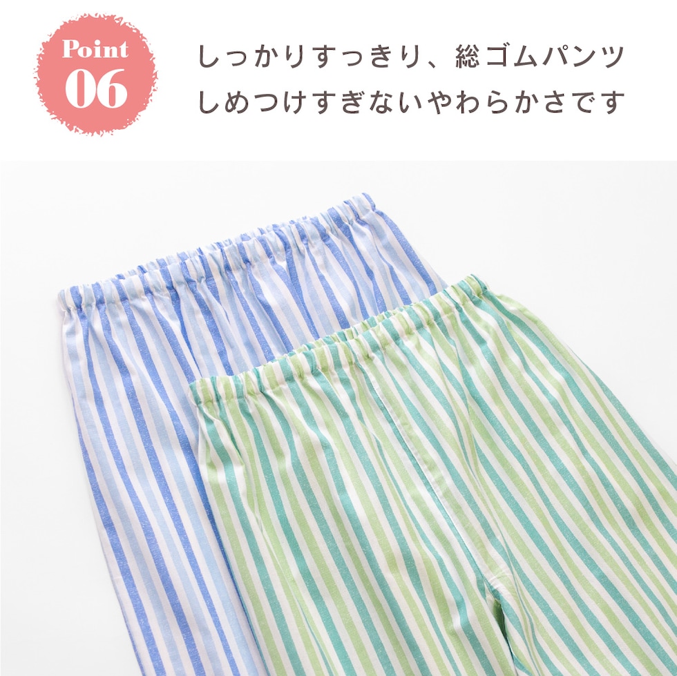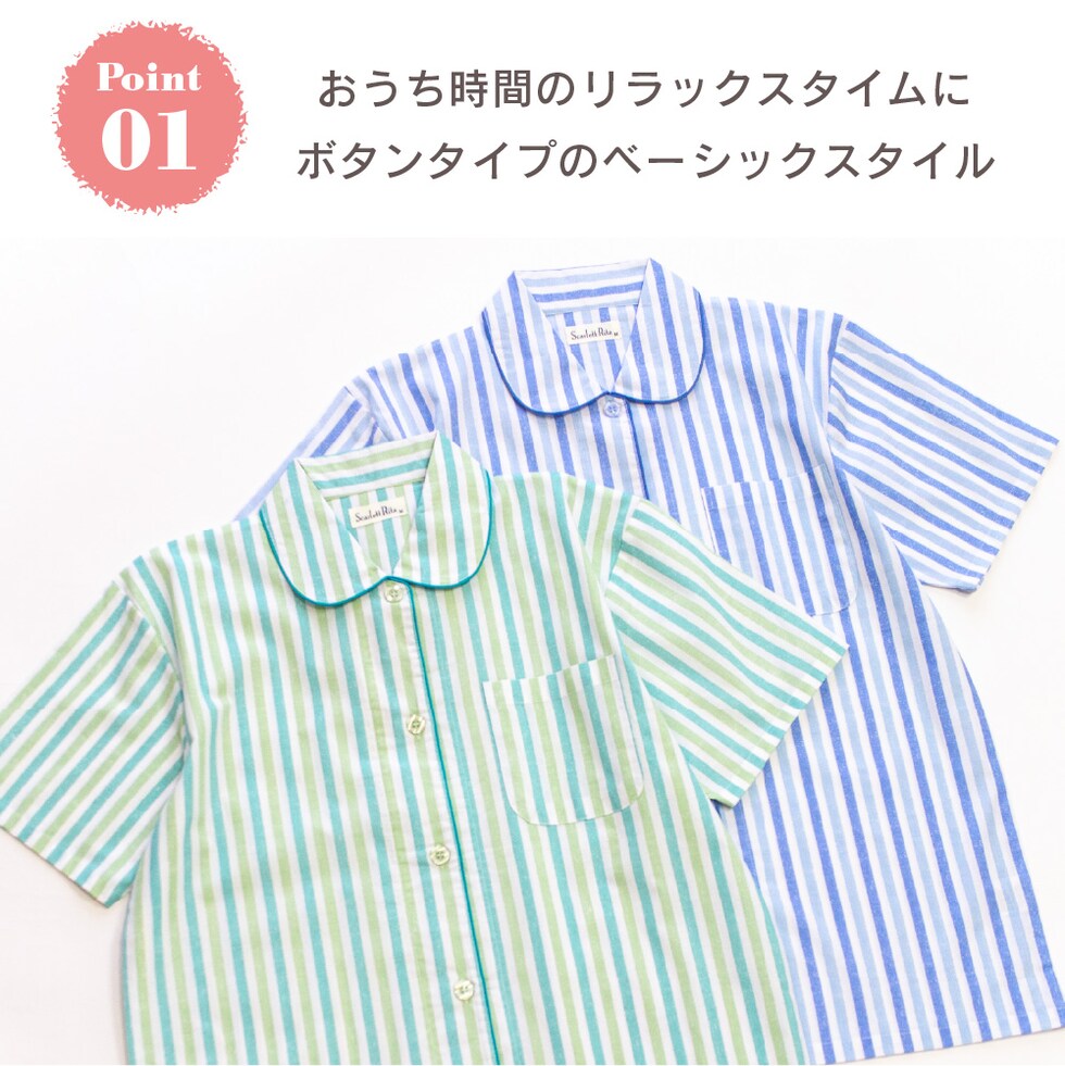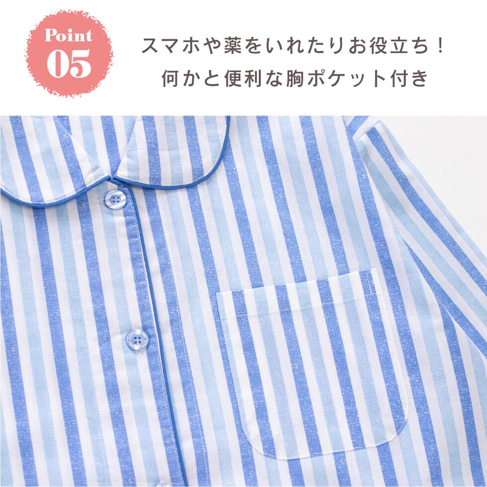 肌にやさしい綿100%がいいね ♪ 肌に直接触れるものだから、安心の天然素材でつくりました。 すっきりとした薄手の生地は軽く風通しもよく、 サラリとした肌触りが気持ちのいいパジャマです。 爽やかなプリントストライプ柄。 明るい気分になる涼しげなブルーとミントの2色です。 このパジャマは子供サイズや半袖販売中、おそろいリンクコーデが楽しめます。 ▼ 同柄半袖パジャマ ▼ |