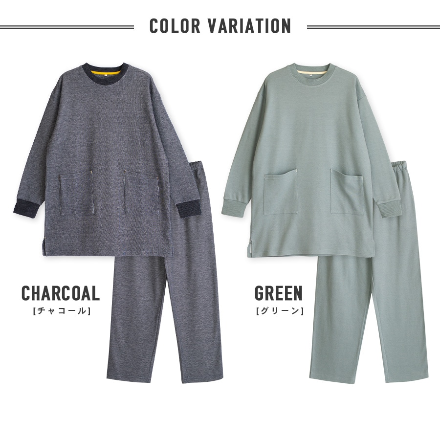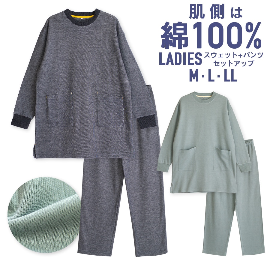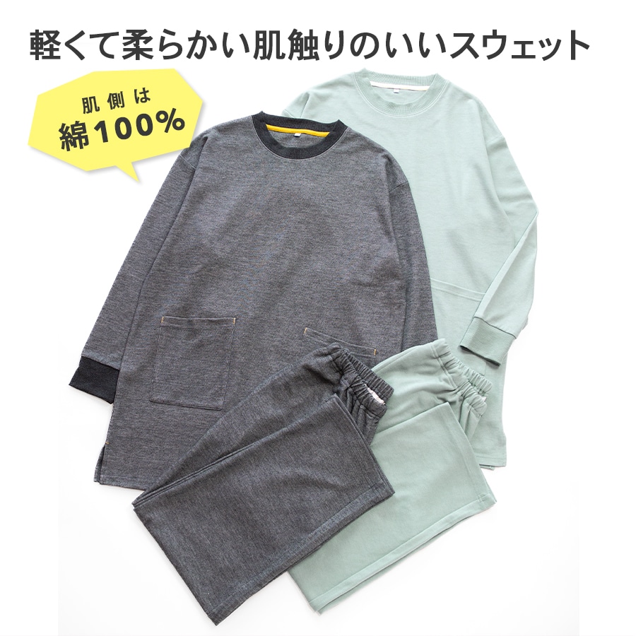 パジャマ レディース 内側が綿100% 長袖 春 秋向き スウェット上下 腰まですっぽり チュニック丈 無地 チャコール グリーン M L LL