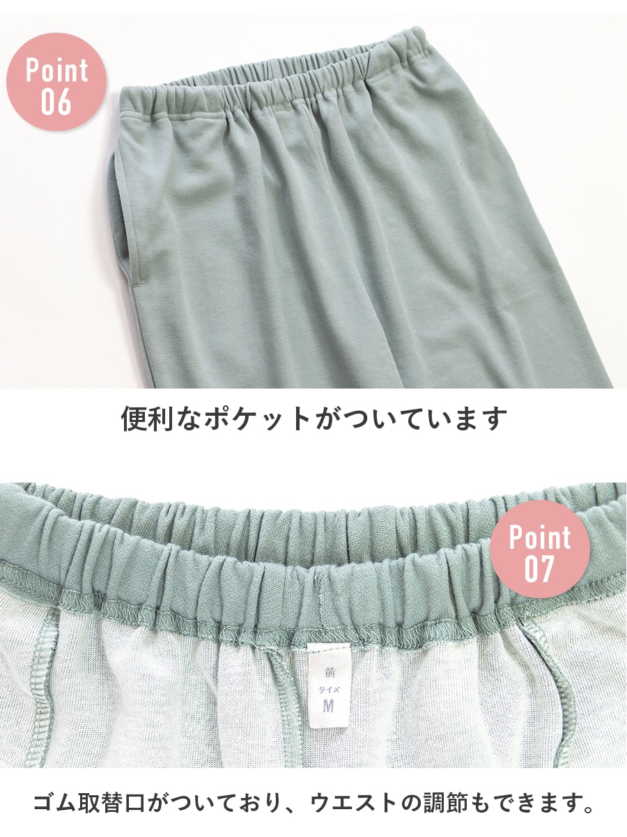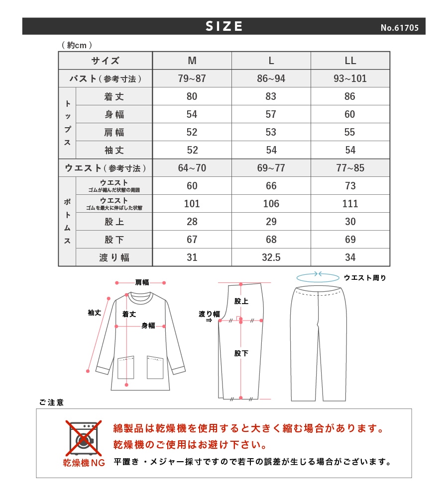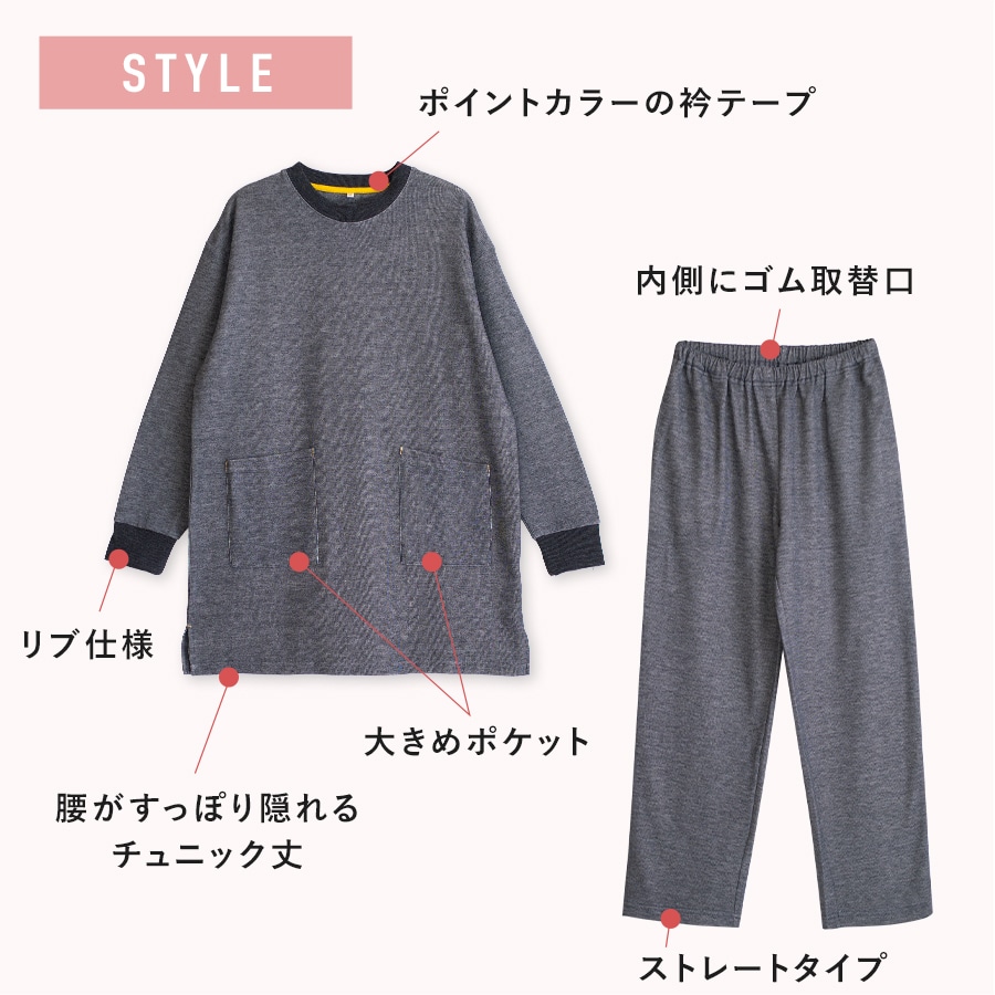 トップス仕様:長袖/無地/チュニック丈/大きめポケット パンツ仕様 :長パンツ/ウエスト総ゴム/両脇ポケット/ゴム取替口 |