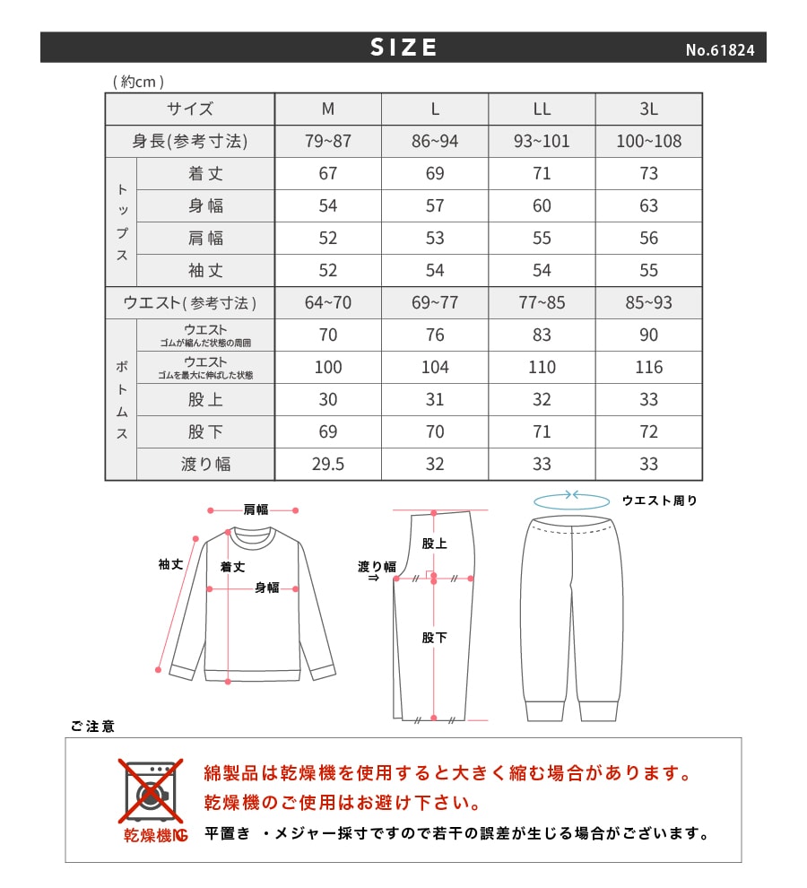 仕 様 トップス仕様:長袖/かぶり式/衿ぐりリブ/プリント/袖口リブ