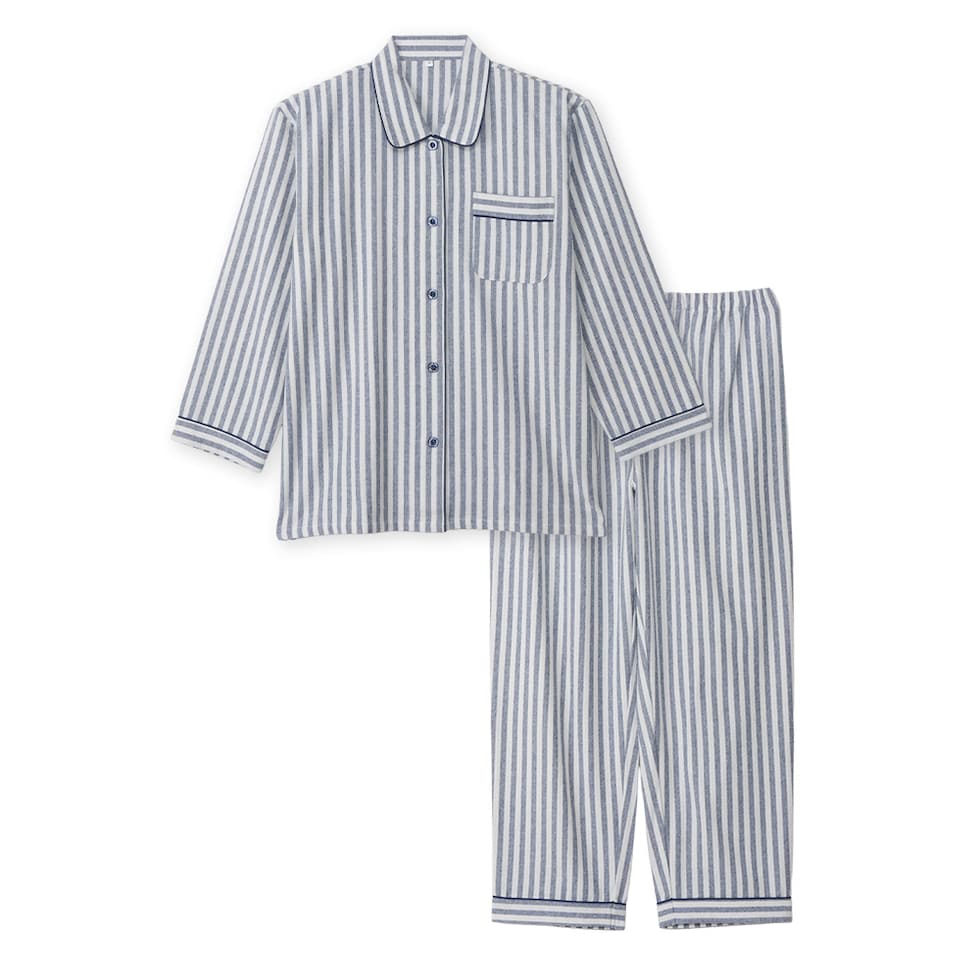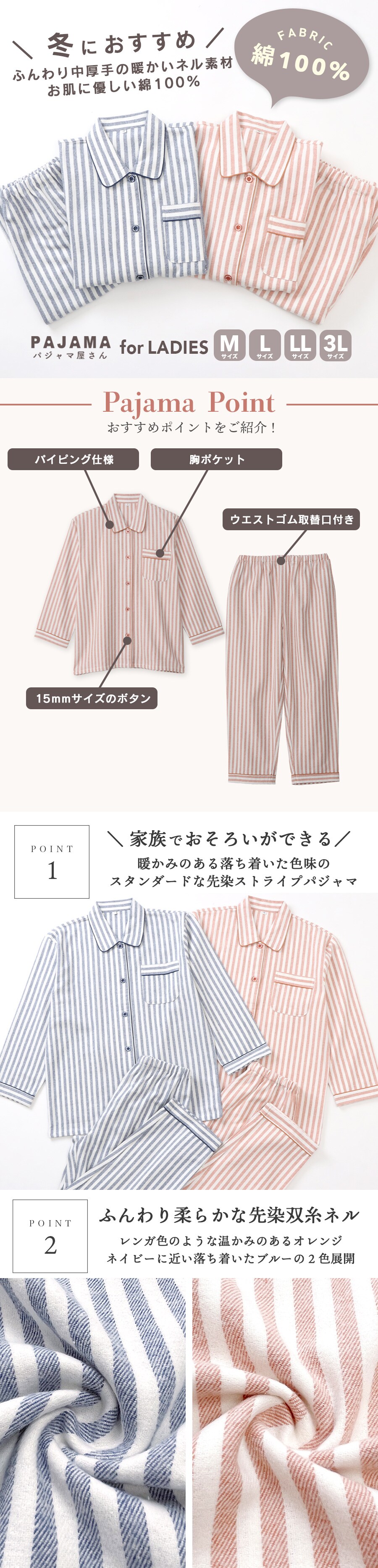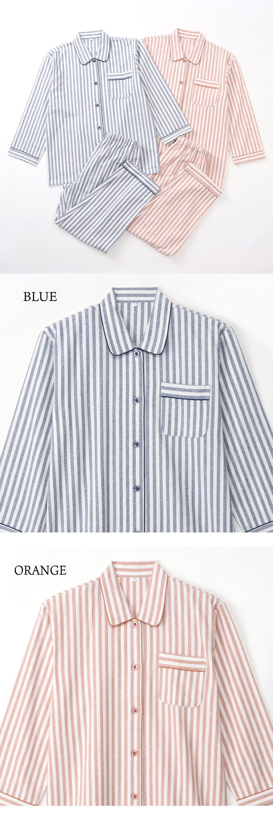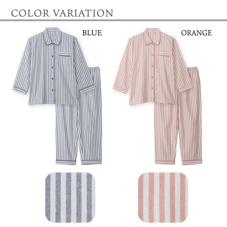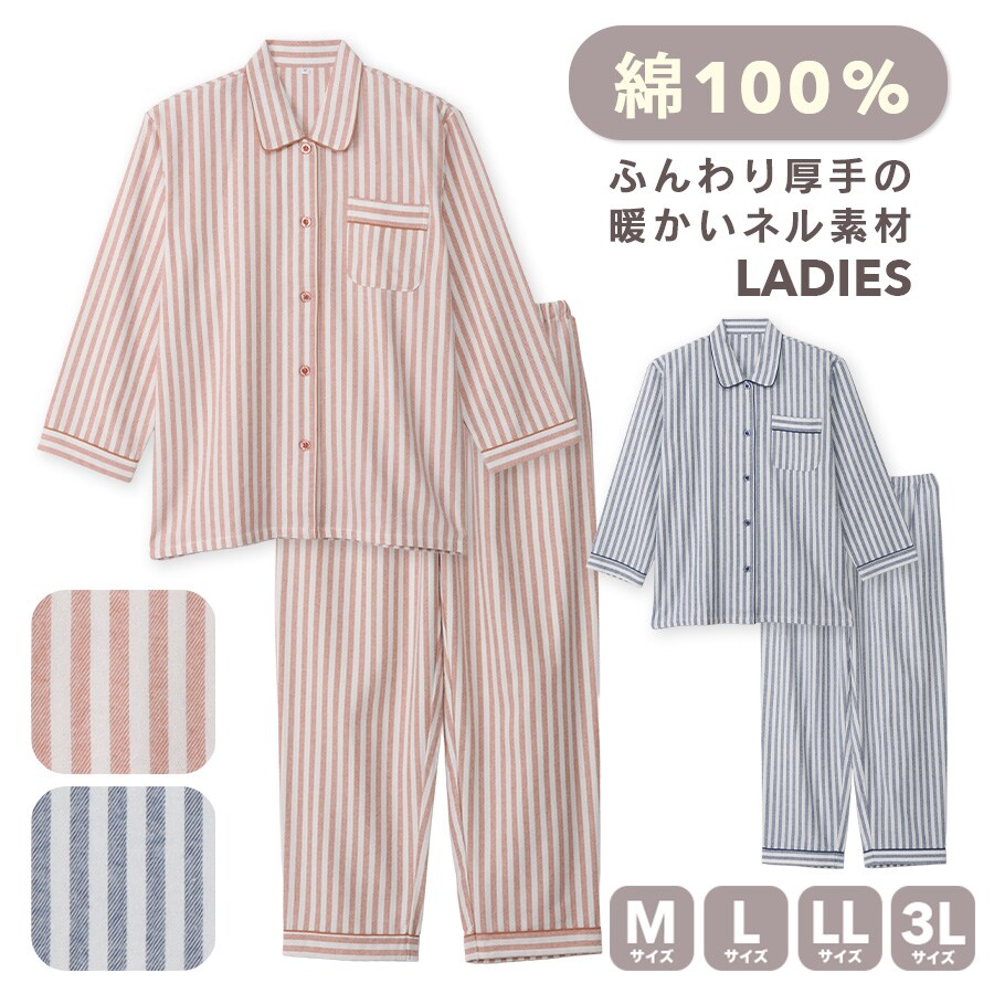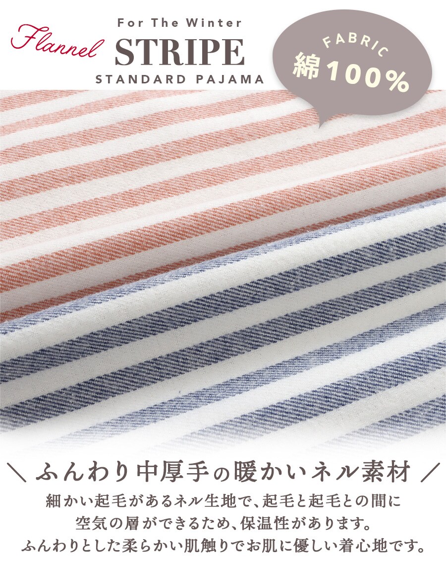 パジャマ レディース 綿100% 長袖 秋 冬 前開き 中厚手のネル起毛 先染め ストライプ柄 ブルー オレンジ M L LL 3L 親子 おそろい リンクコーデ 家族 ギフト プレゼント 敬老の日 母の日 61988
