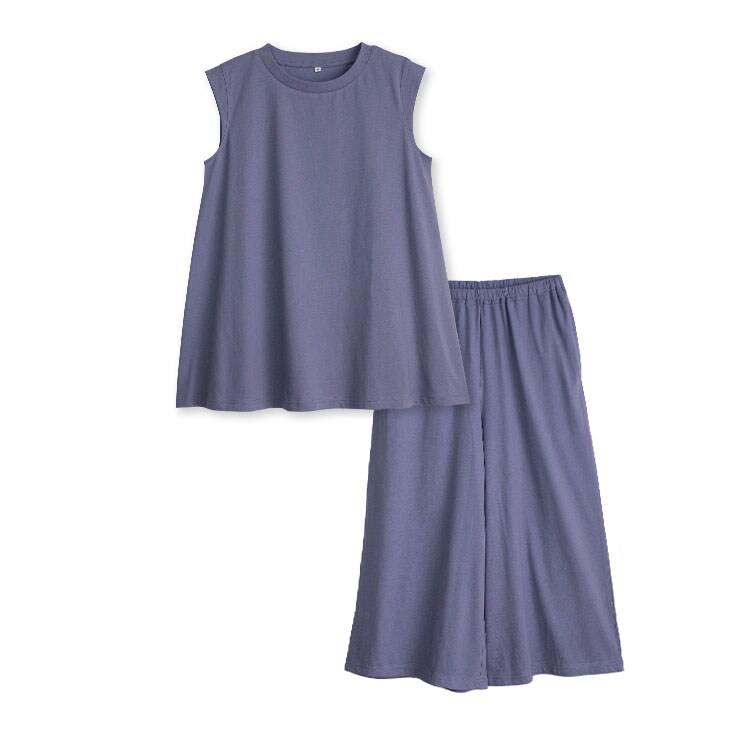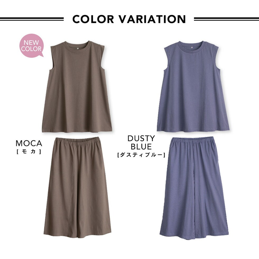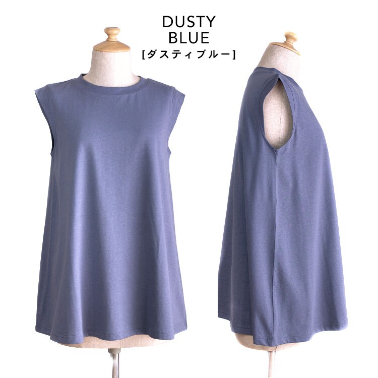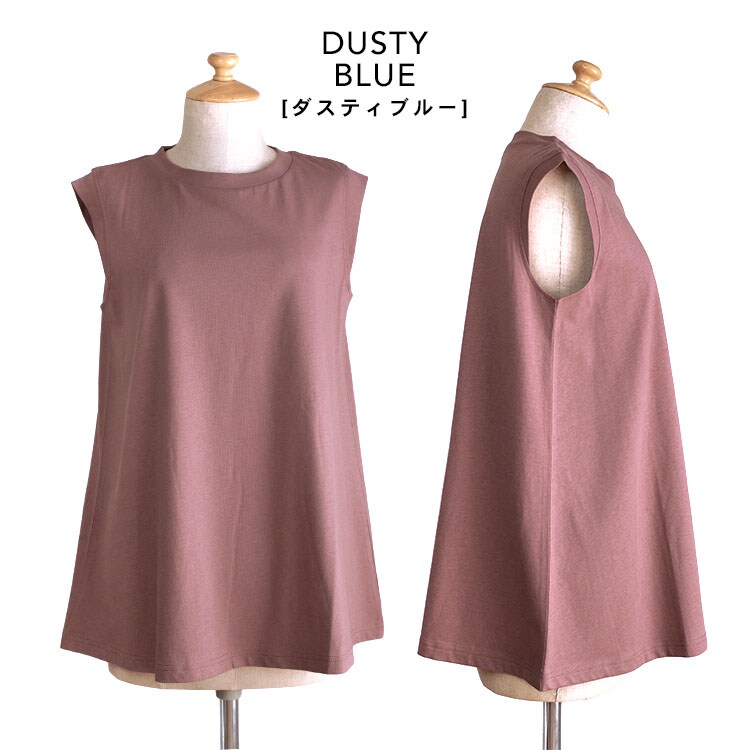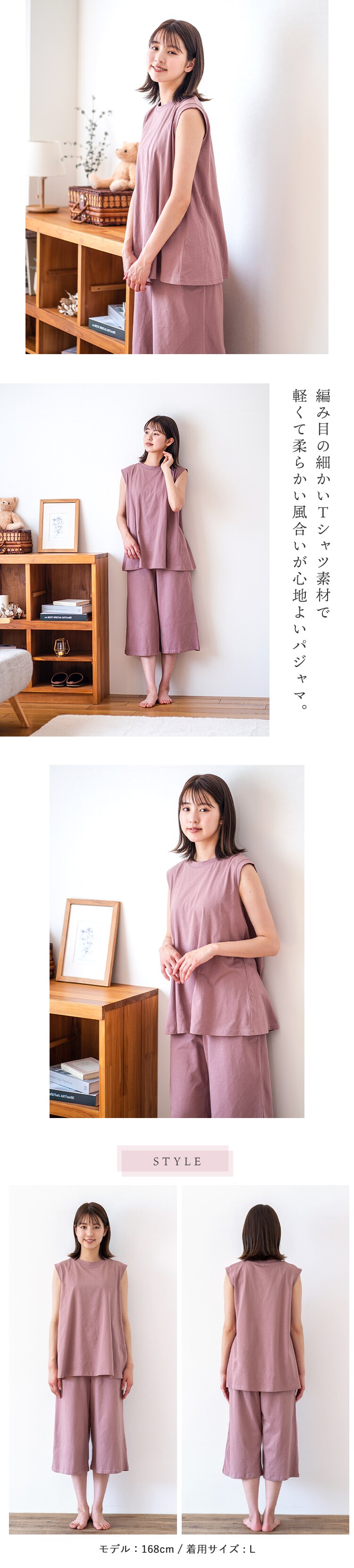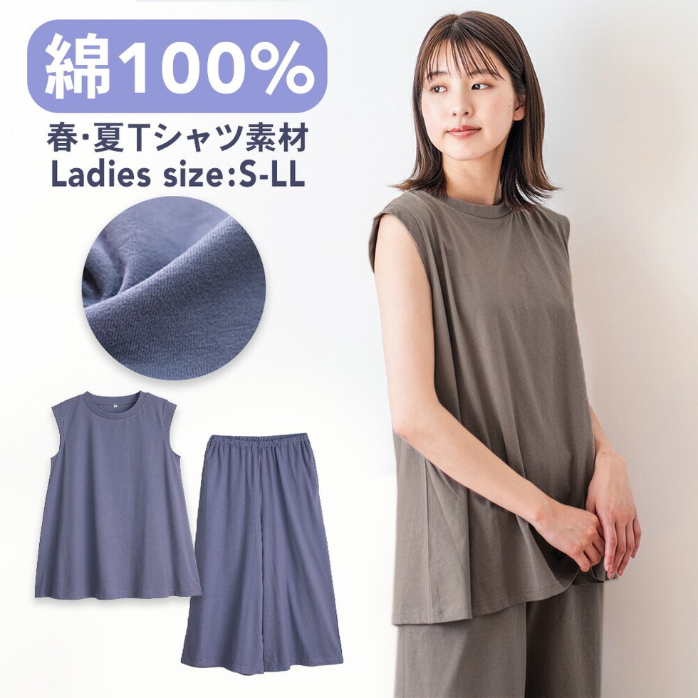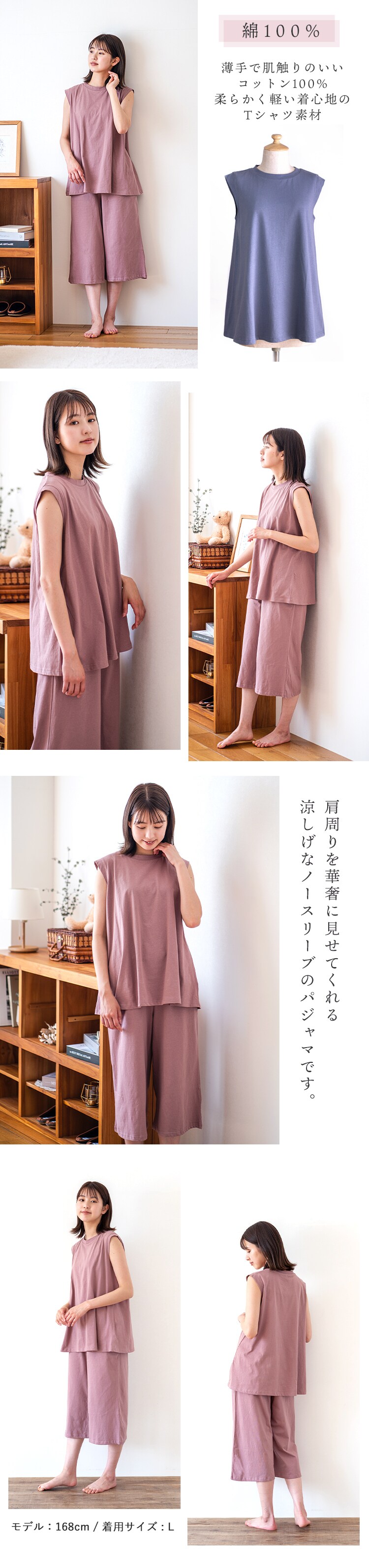 パジャマ レディース 綿100% ノースリーブ 春 夏 柔らかく軽い薄手の快適Tシャツ素材 ダスティブルー モーヴピンク S M L LL 部屋着 ルームウェア 半袖