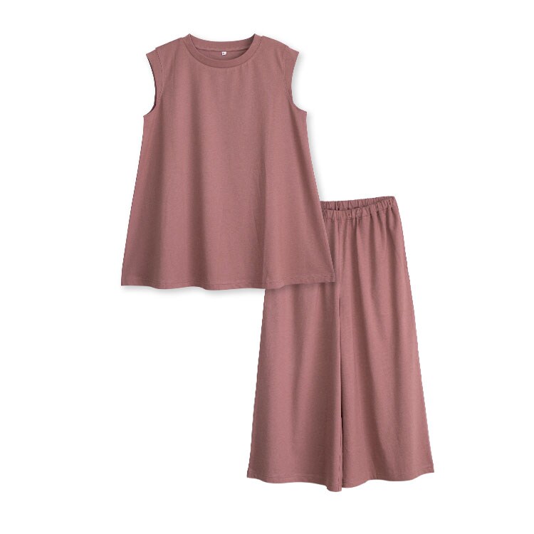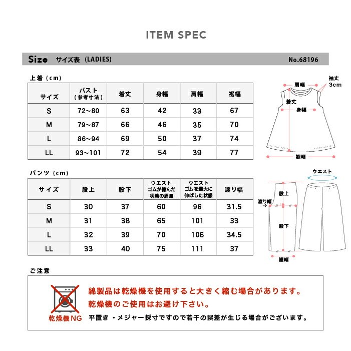 トップス仕様:ノースリーブ/ゆったりしたシルエット/サイドにスリット パンツ仕様 :足首くらい長さのワイドパンツ/ゴム取替口/脇ポケット |