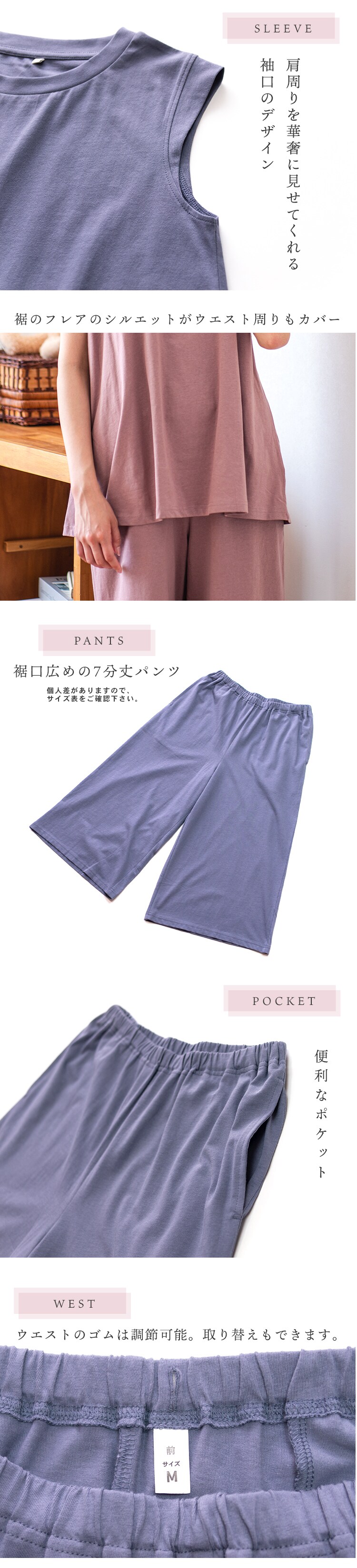 肌にやさしい綿100%がいいね ♪ 肌に直接触れるものだから、安心の天然素材でつくりました。 肩周りを華奢に見せてくれる袖口のデザインが素敵な、涼しげなノースリーブのパジャマです。 裾のフレアのシルエットがウエスト周りもカバー パンツは、7分丈のガウチョパンツ(※個人差があります) ウエストはゴム仕様なので楽チン! |