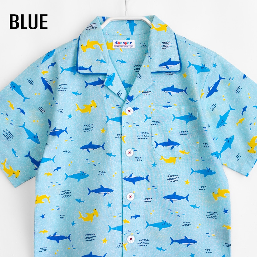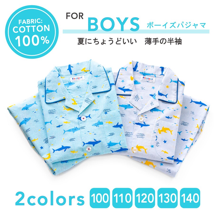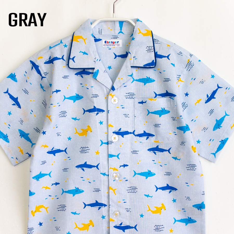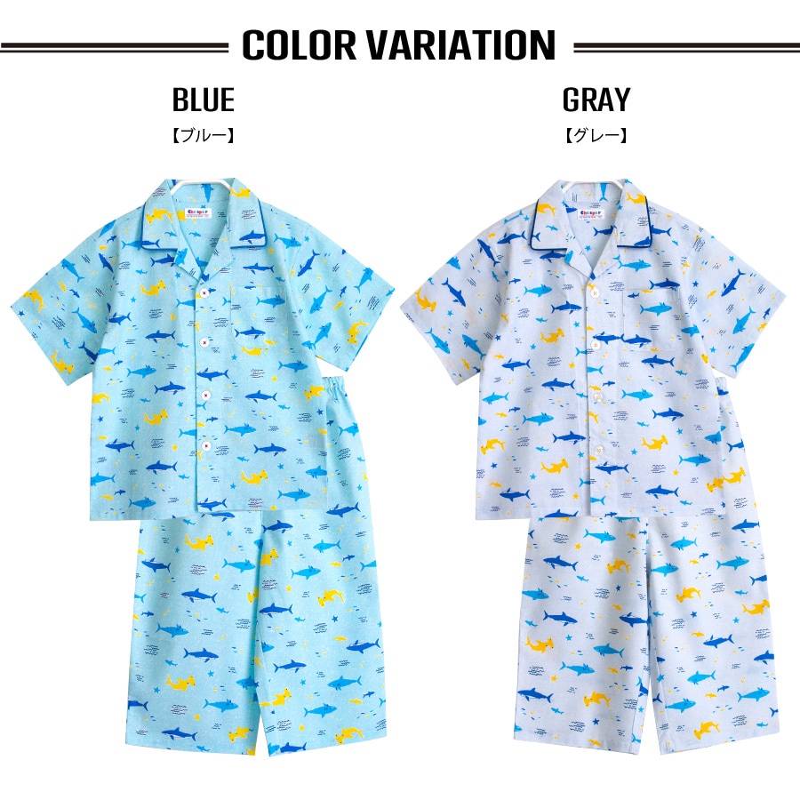 パジャマ キッズ 男の子 綿100% 半袖 夏 前開き 水族館のようなサメ柄 シャーク柄 ブルー グレー 100 110 120 130 140 子供 ジュニア ガールズ かわいい メール便なら 送料無料