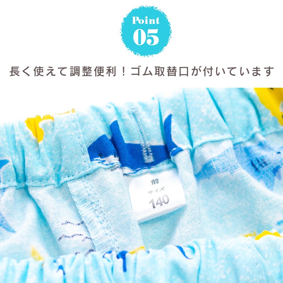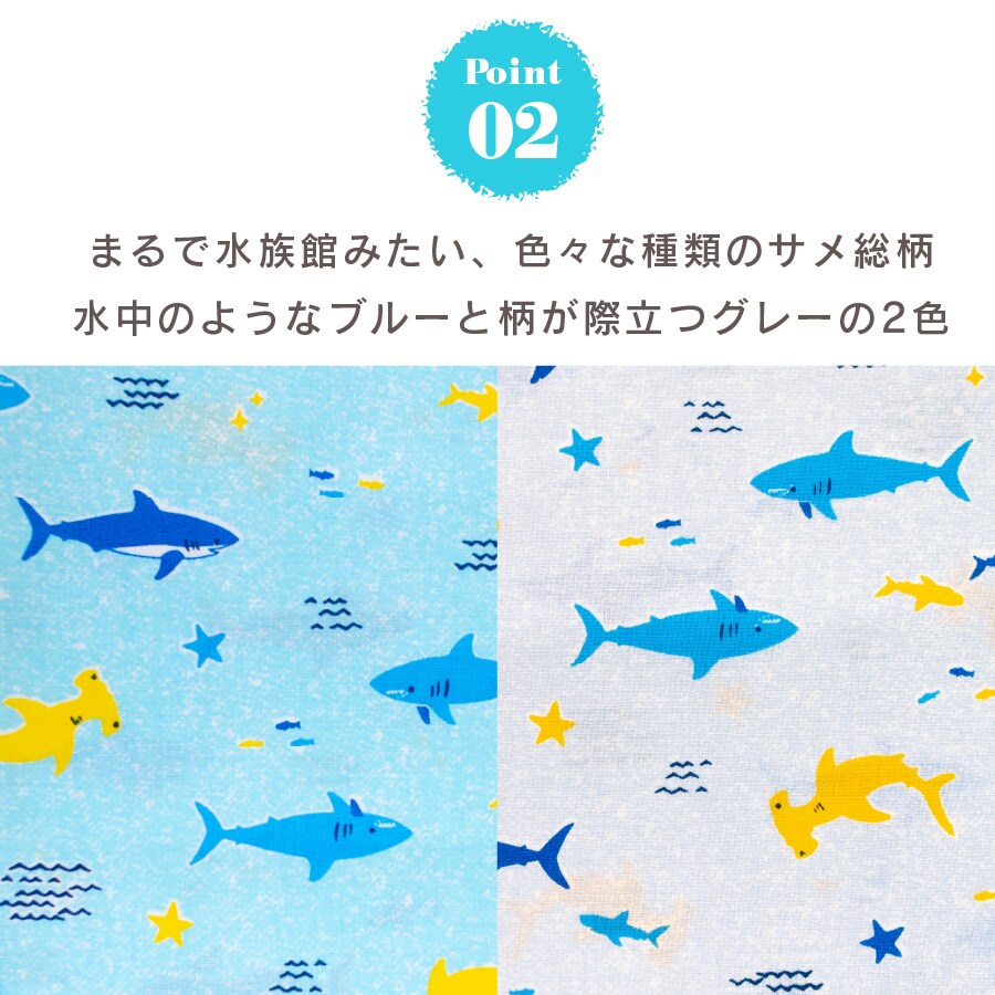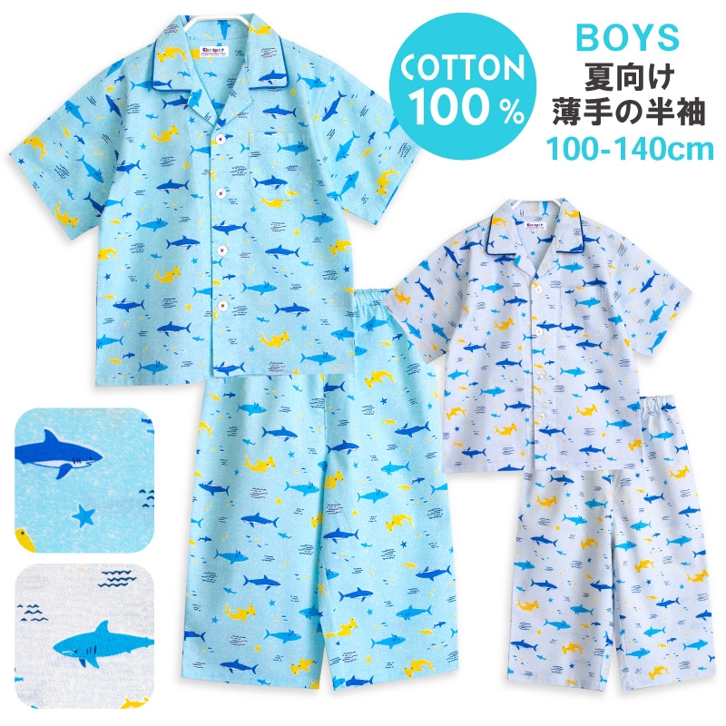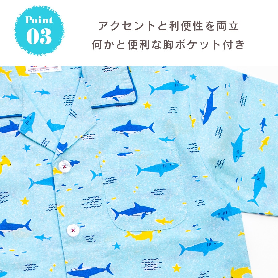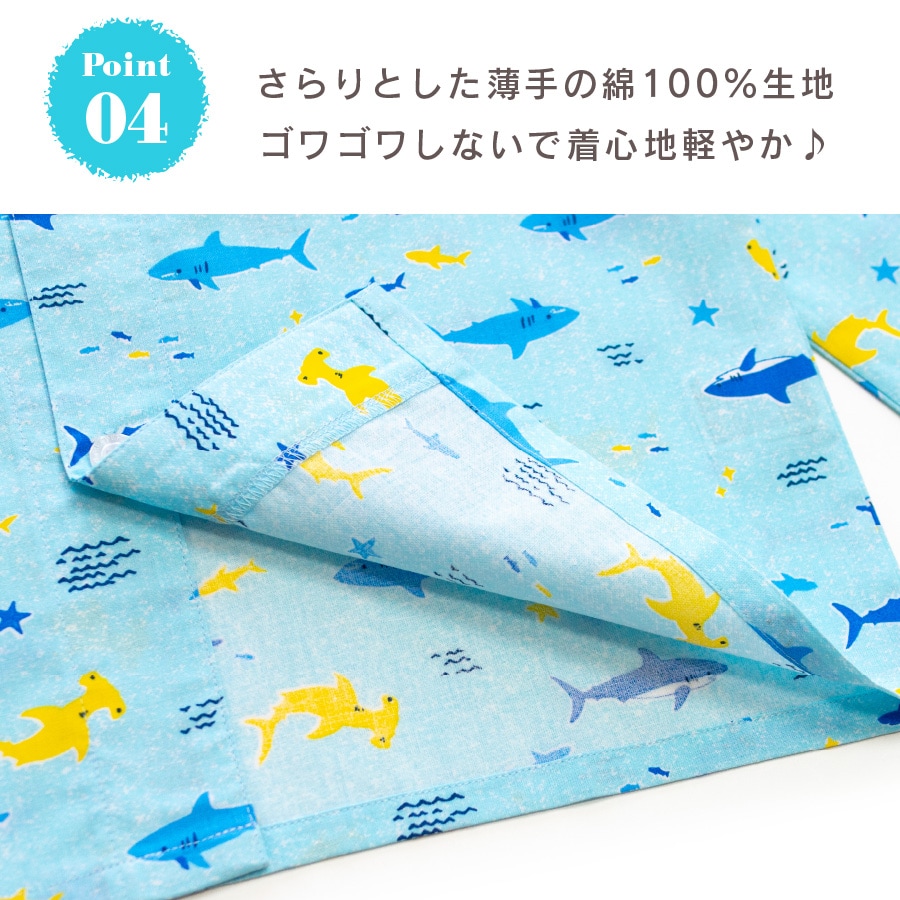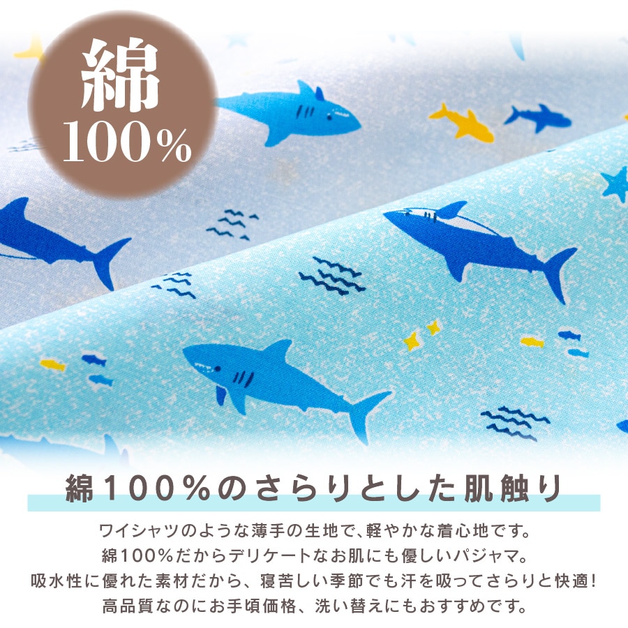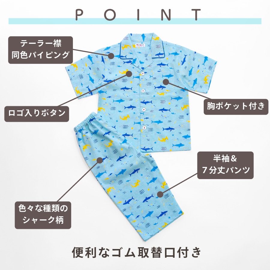 肌にやさしい綿100%がいいね ♪ 肌に直接触れるものだから、安心の天然素材でつくりました。 すっきりとした薄手の生地は軽く風通しもよく、 サラリとした肌触りが気持ちのいいパジャマです。 サメがいっぱい、まるで水族館みたい! 水中のようなブルーと、柄が際立つグレーの2色。 このパジャマは同柄の長袖も販売しており、おそろいリンクコーデが楽しめます。 ▼ 同柄長袖パジャマ ▼ |