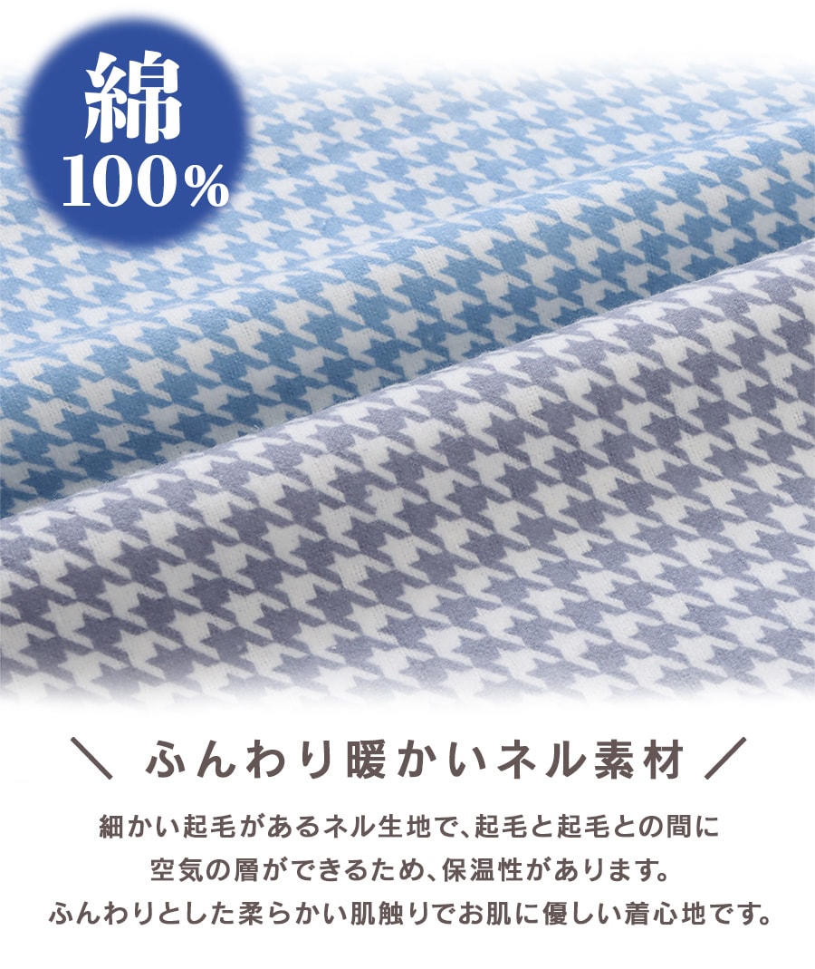冬に丁度良い厚さの綿100% ネル起毛 ふんわりとした柔らかい肌触りで、お肌に優しい着心地です。 細かな起毛があるため保温性があります。 ふんわり優しい雰囲気で優しい色味の千鳥格子が素敵なパジャマです。 メンズサイズもあるので、おそろいリンクコーデが楽しめます |