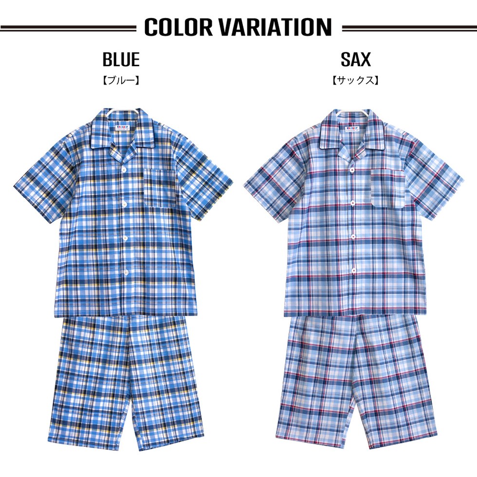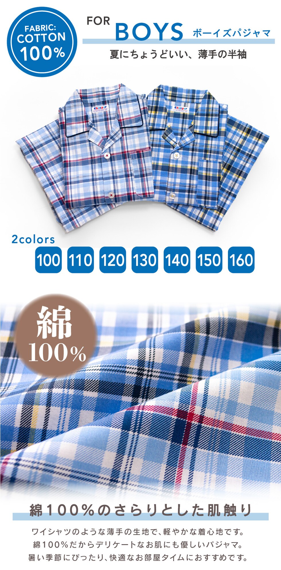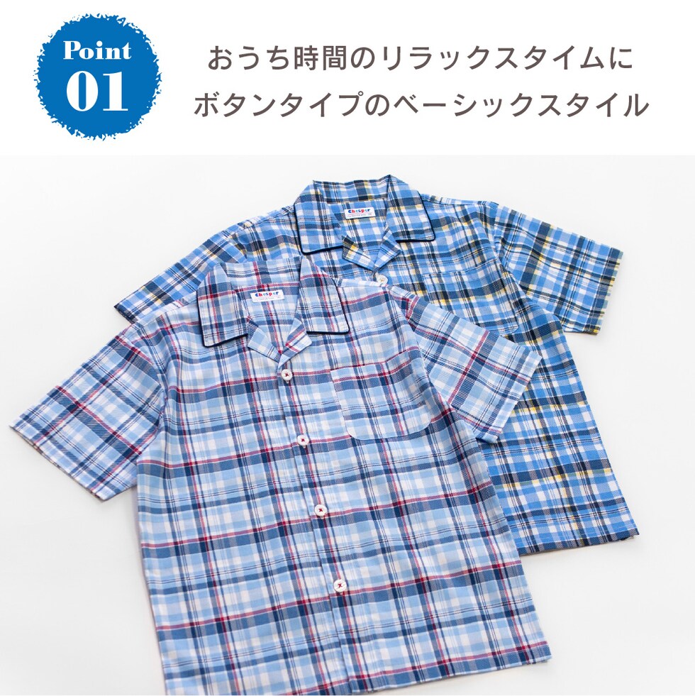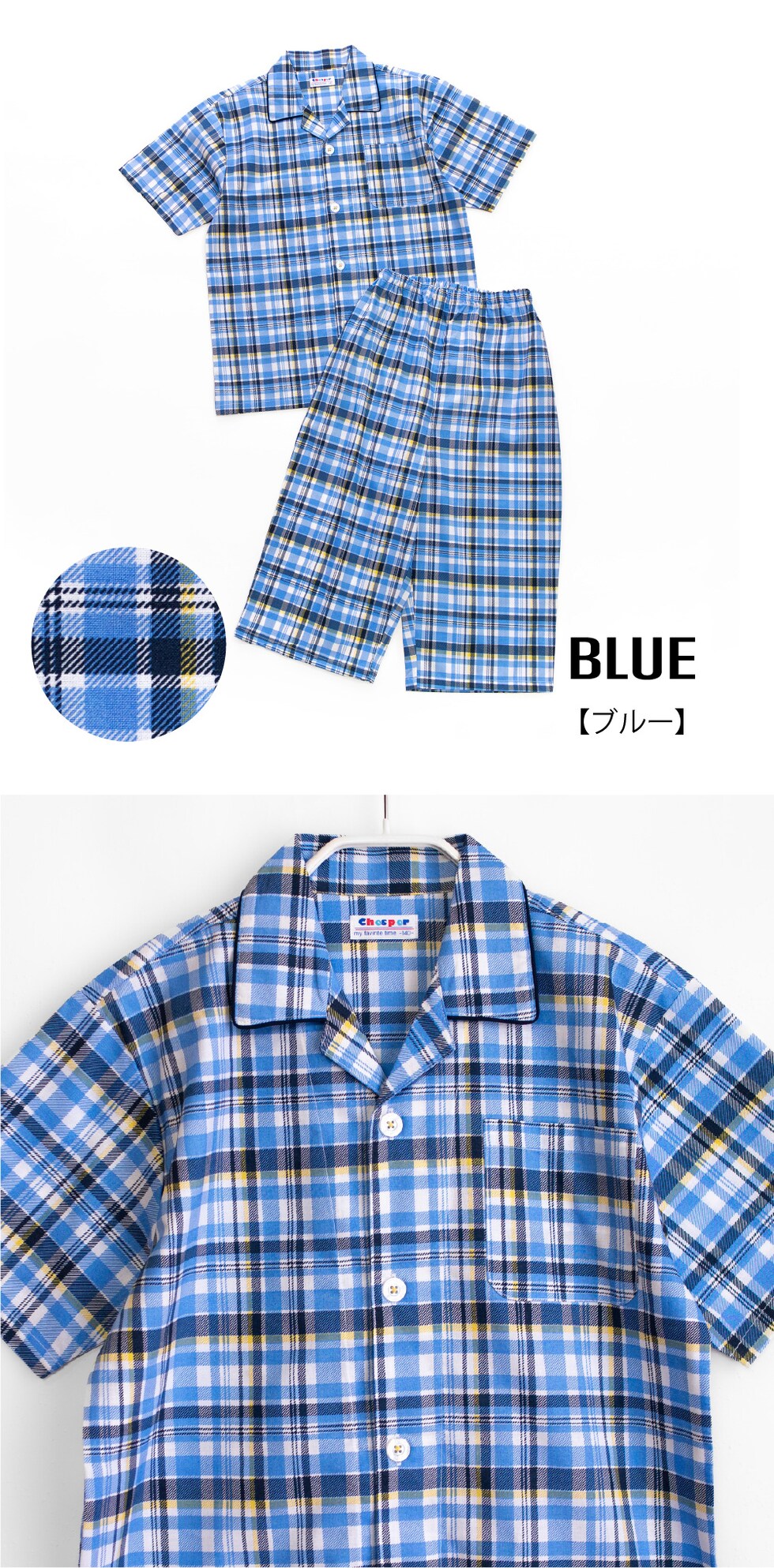 パジャマ キッズ 男の子 綿100% 半袖 夏向け 前開き チェック柄 薄手のシャツ ブルー サックス 100 110 120 130 140 150 160 子供 ジュニア ボーイズ おそろい メール便なら 送料無料