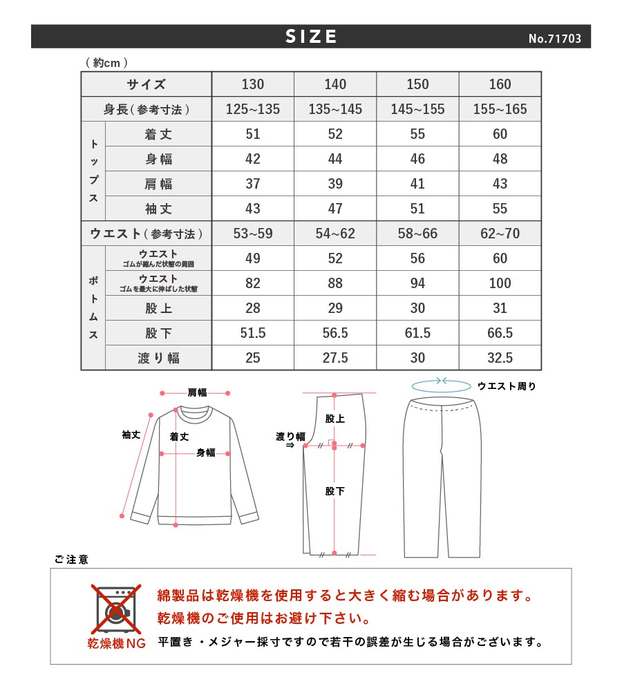 トップス仕様:長袖/かぶり式/衿ぐりリブ/袖口リブ/プリント パンツ仕様 :長パンツ/裾口リブ/ウエスト総ゴム/ゴム取替口 |