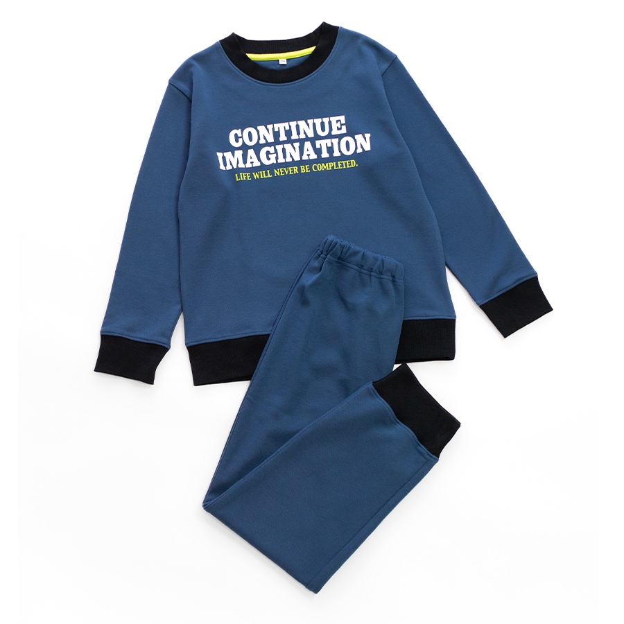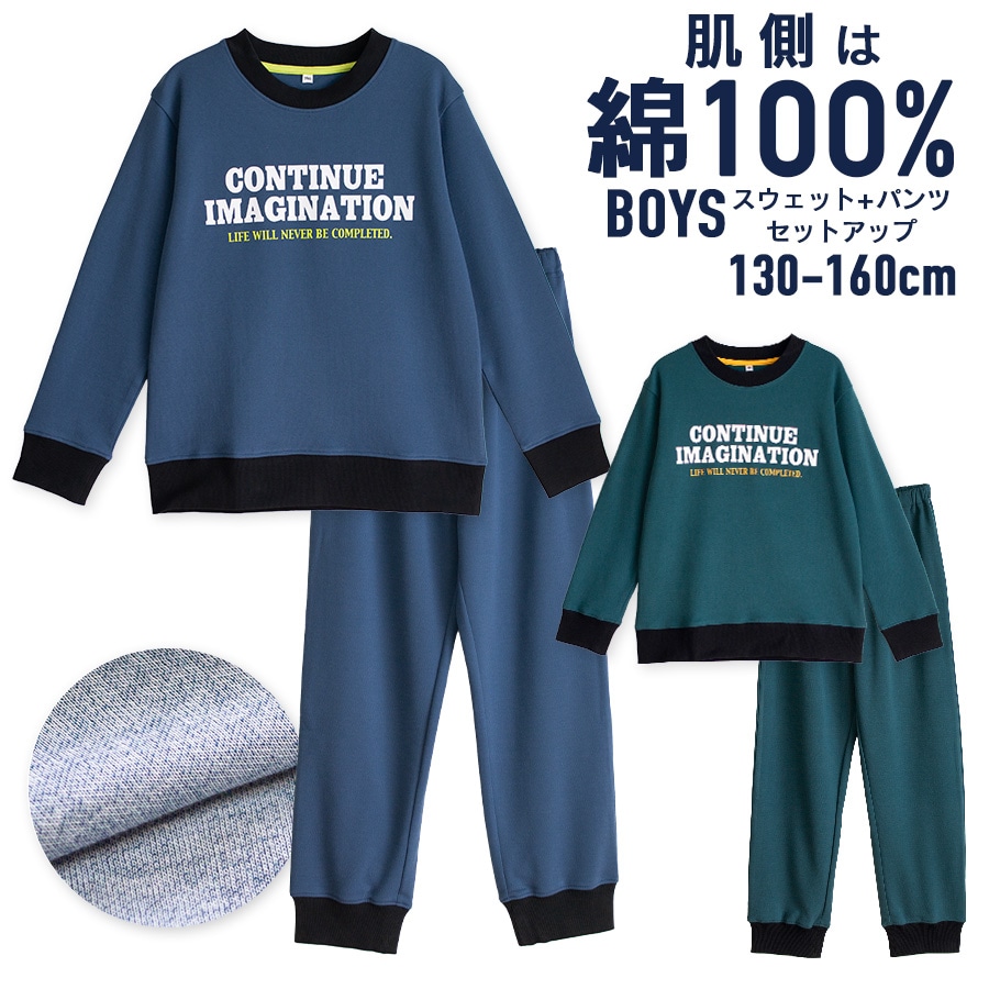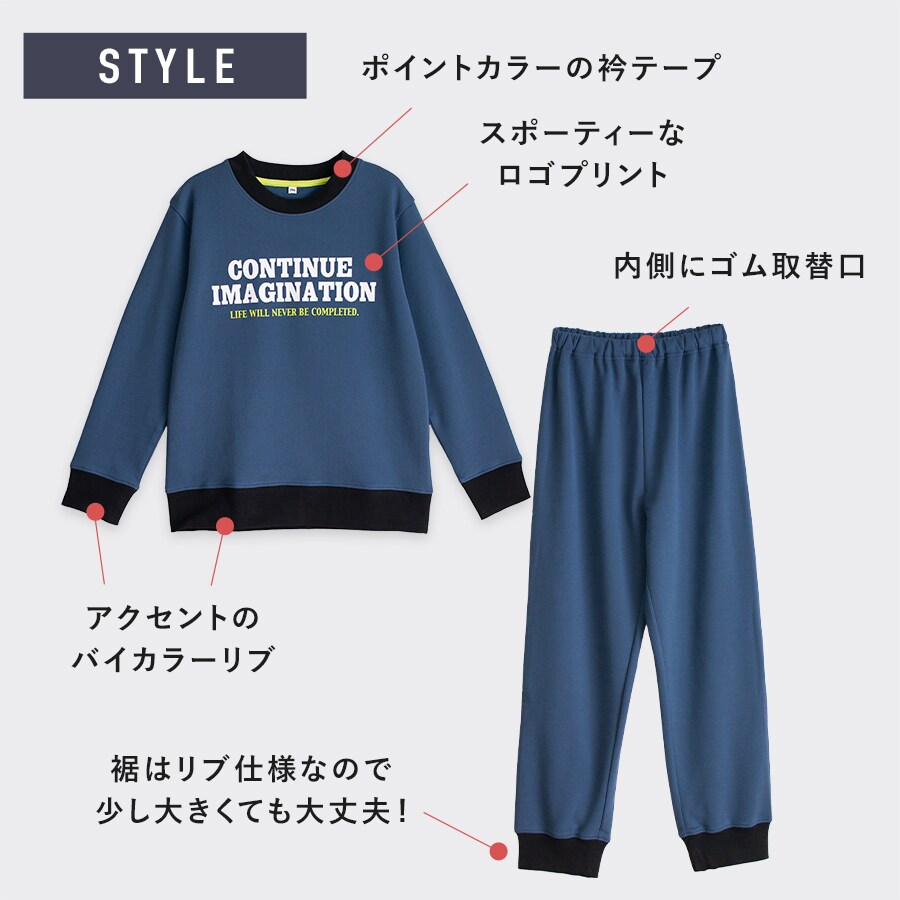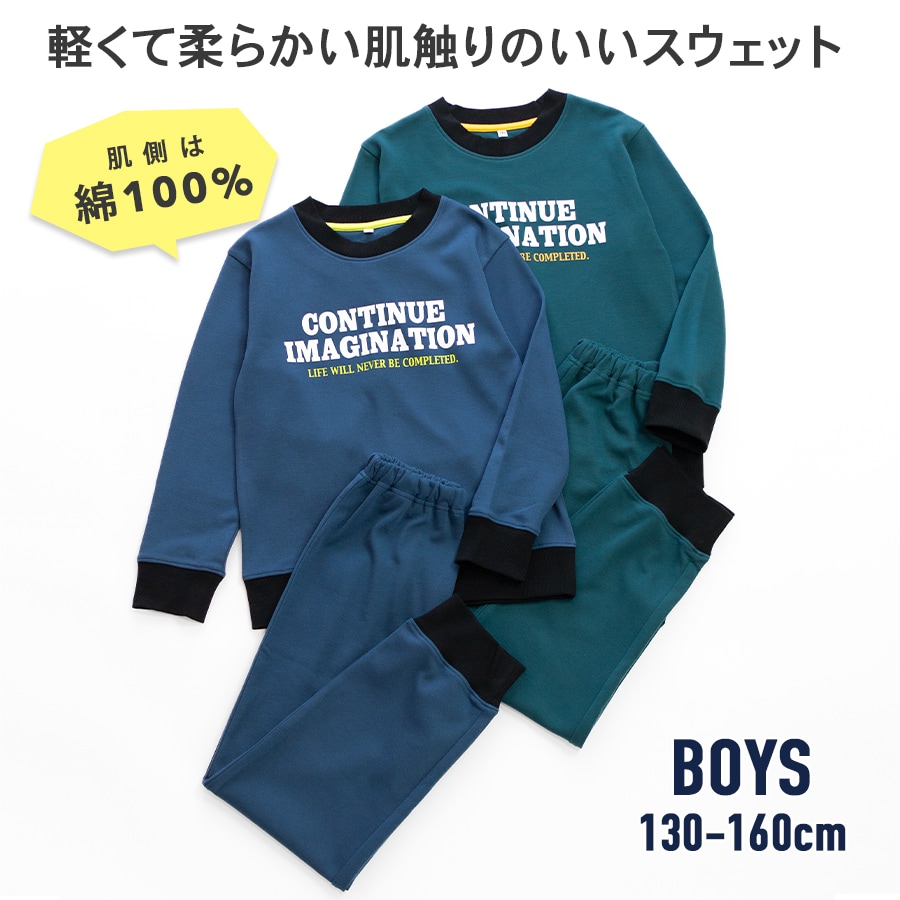 パジャマ キッズ 男の子 内側が綿100% 長袖 春 秋向き スウェット上下 リブ仕様 ロゴプリント ブルー ダークグリーン 130 140 150 160 子供 ボーイズ ジュニア 親子 おそろい