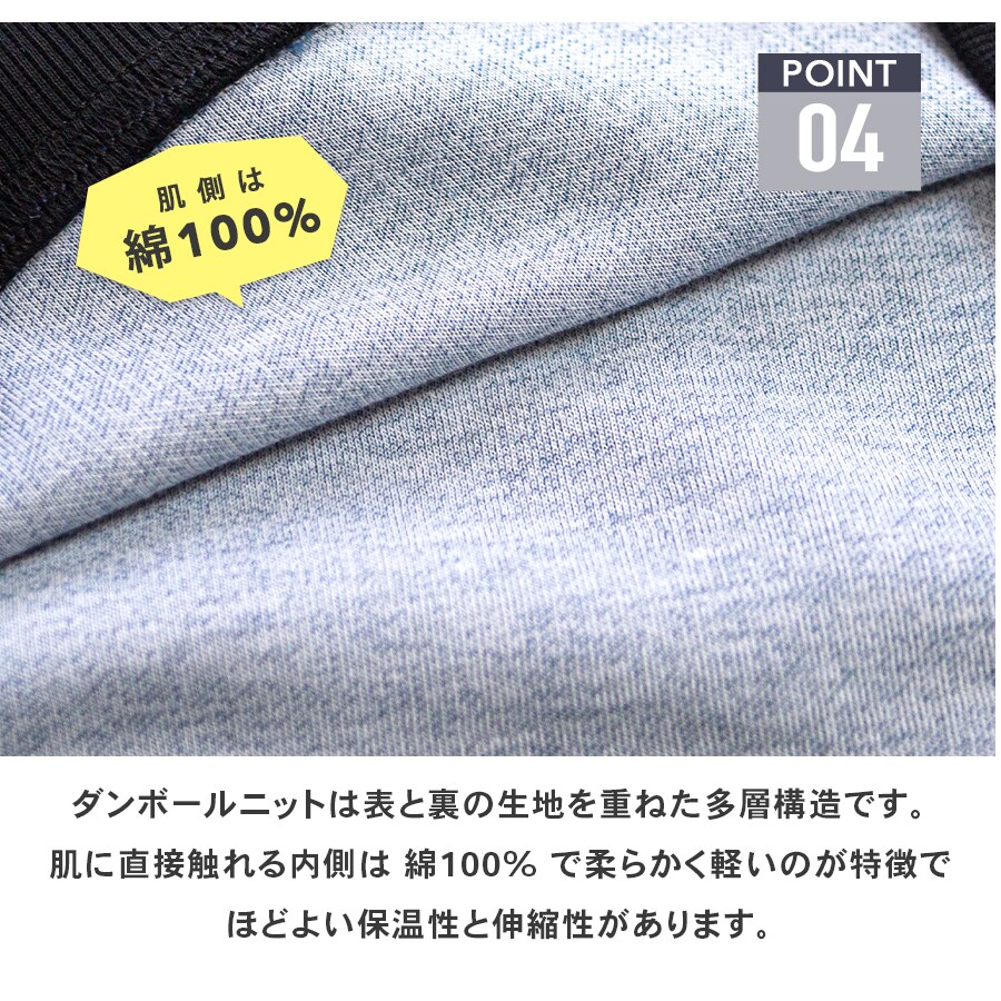 表側:ポリエステル100% 裏側:綿100% リブ:ポリエステル95%/ポリウレタン5% |