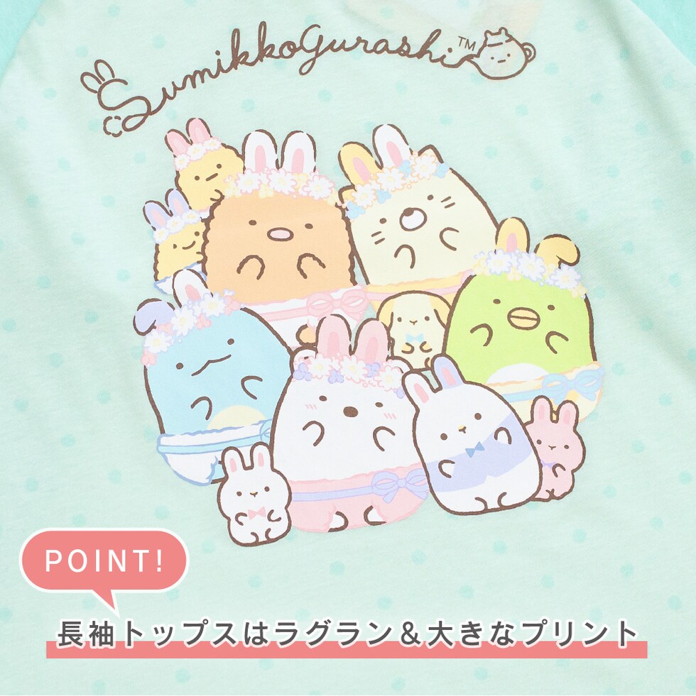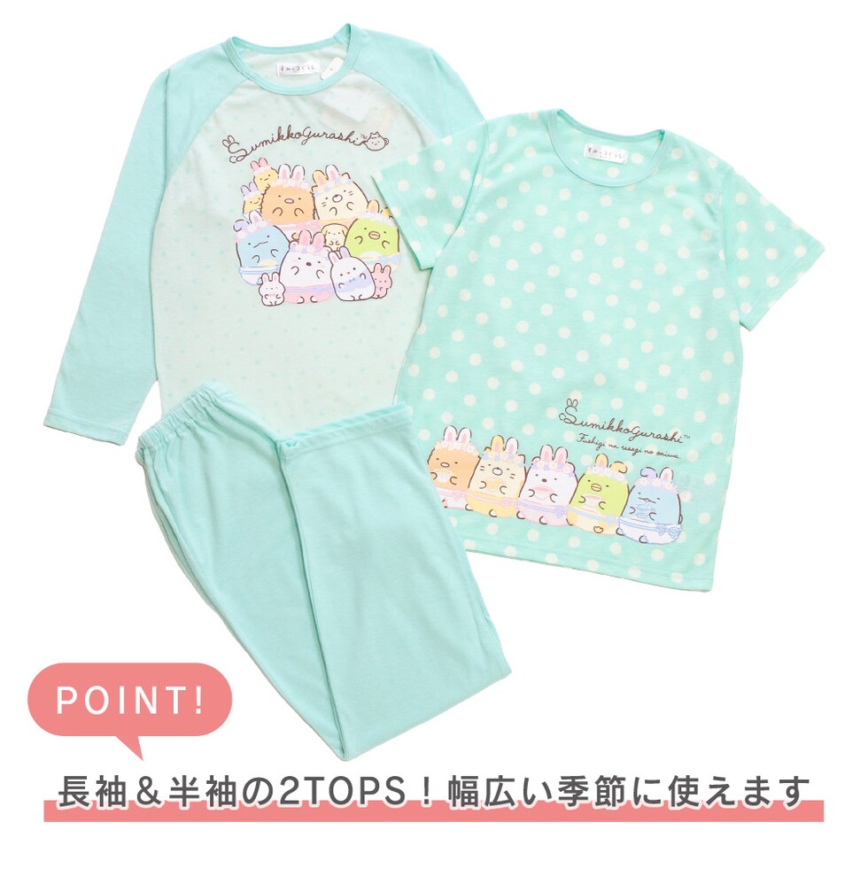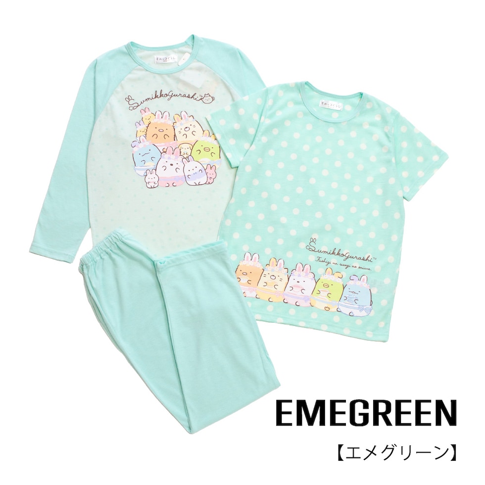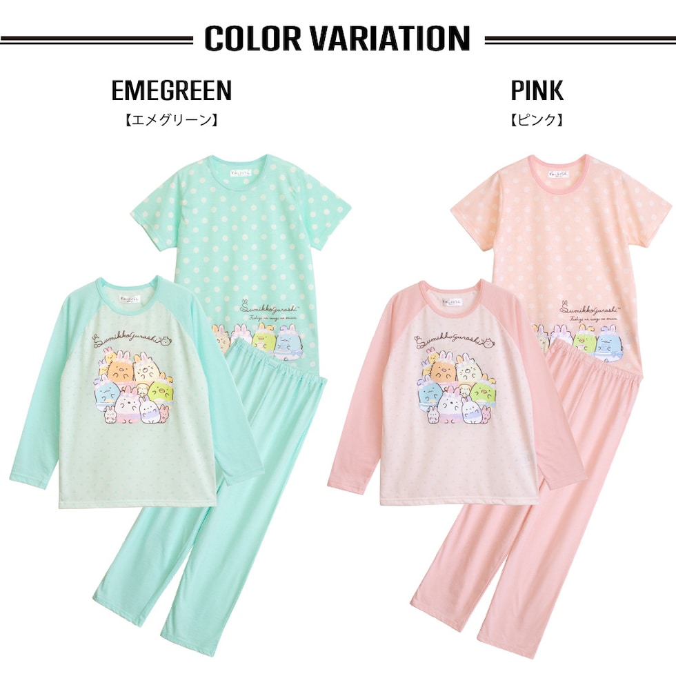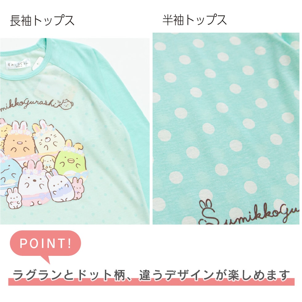 すみっコぐらし 2TOPS パジャマ キッズルームウェア 女の子 長袖 半袖 2枚セット 春 夏 秋 Tシャツ素材 エメグリーン ピンク 100 110 120 130 140 150 160 子供 ガールズ ジュニア しろくま とかげ ねこ ぺんぎん? とんかつ