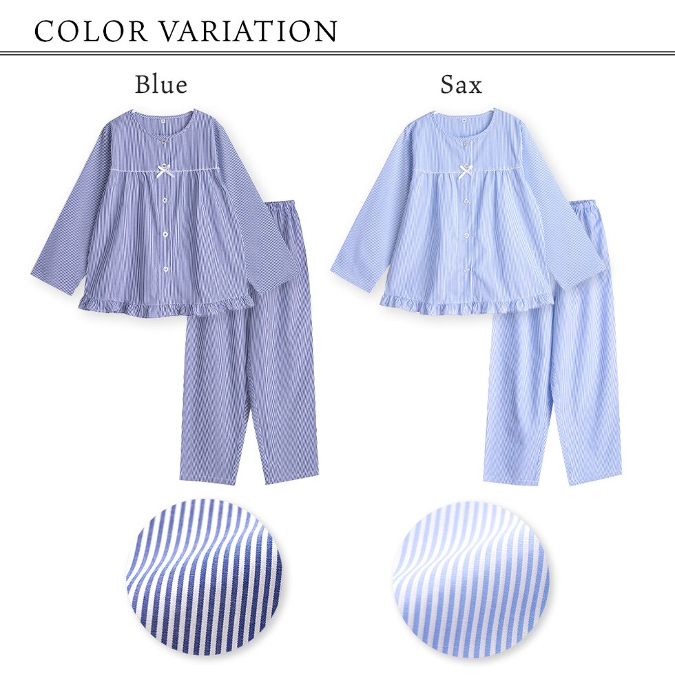 爽やかなブルー系パジャマが今の気分!! コットン100%で肌に優しく、さらりとした肌触りですっきりとした爽やかなパジャマです。 シンプルで爽やかな細いストライプのパジャマ! 胸元の切り替えでふんわりとしたデザインに。 裾にはフリルがついた甘すぎないガーリーなパジャマです。 同柄のメンズサイズやレディースサイズ、半袖もあるのでおそろいリンクコーデを楽しむのオススメです! 《同柄長袖・おそろいパジャマ》 |