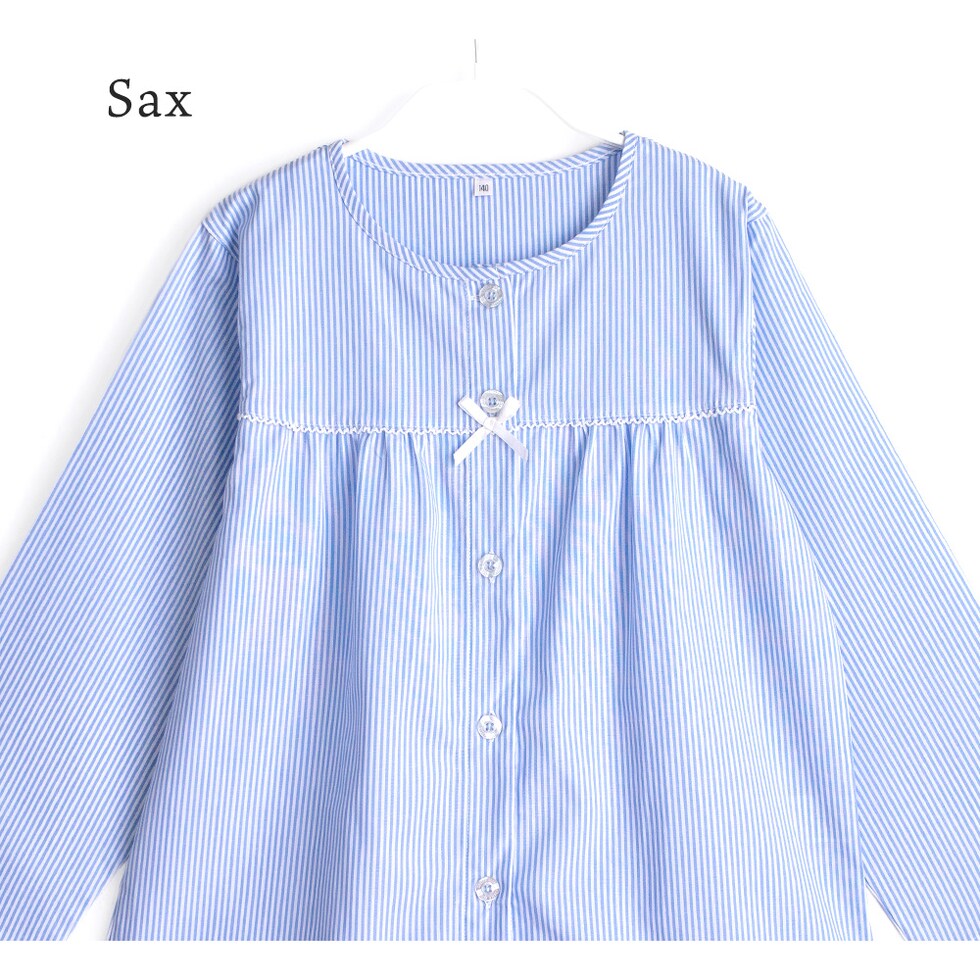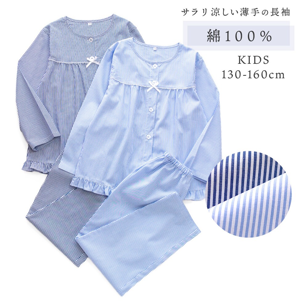 パジャマ キッズ 女の子 綿100% 長袖 春 夏 前開き 衿なしシャツ 裾フリル 細ストライプ ネイビーブルー 130 140 150 160 先染め 子供 ガールズ ジュニア かわいい おそろい メール便なら 送料無料