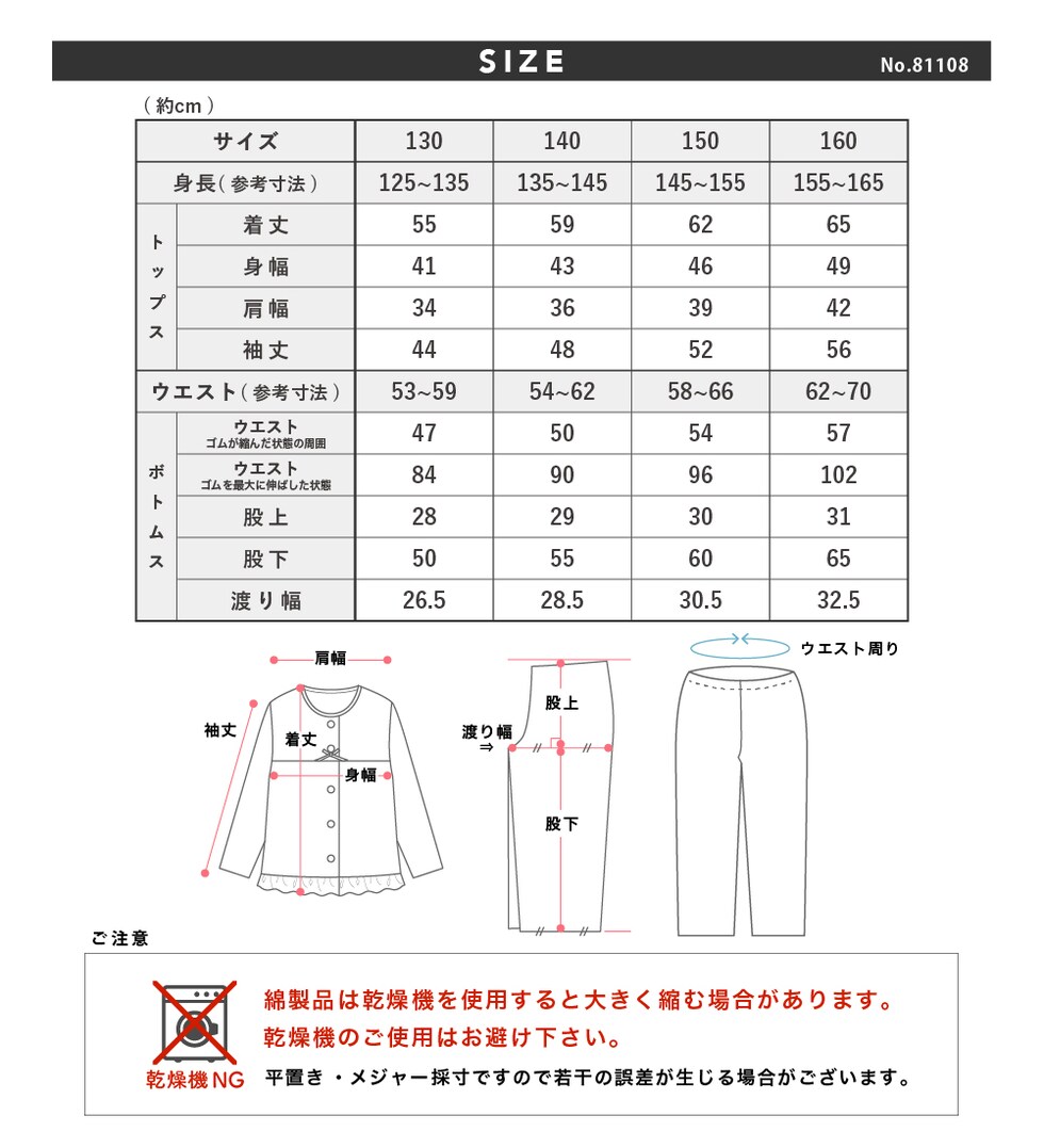 トップス仕様:長袖/衿なしクルーネック/前開きシャツ/胸切替ギャザーピコミシン仕様/裾フリル パンツ仕様 :長パンツ/ウエスト総ゴム/ゴム取替口 |