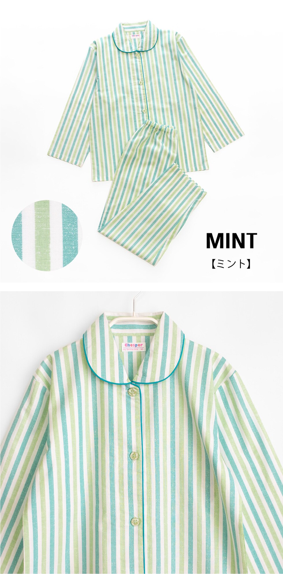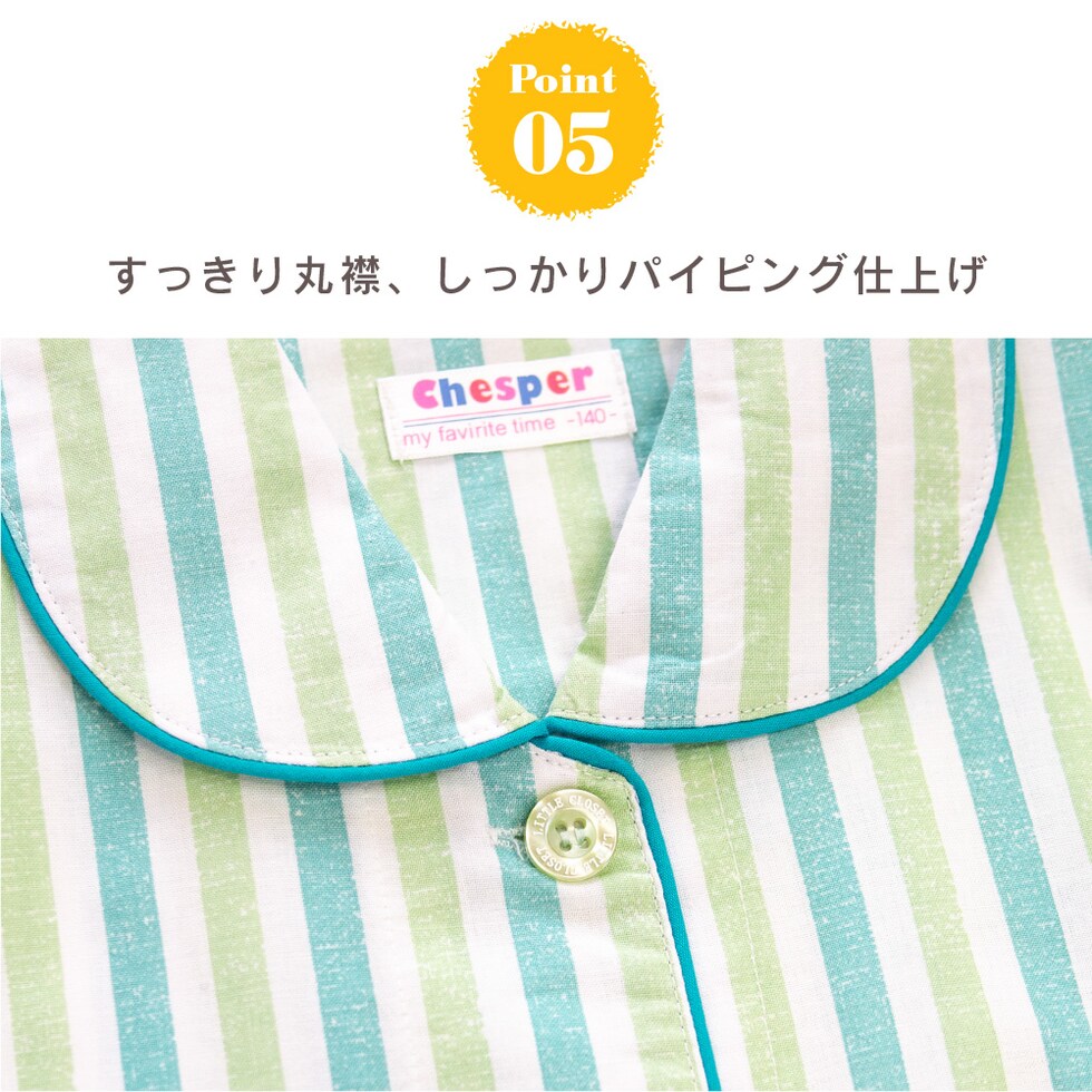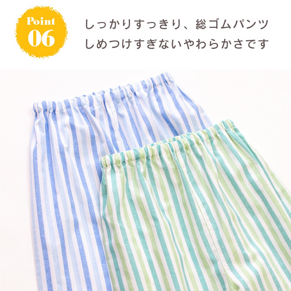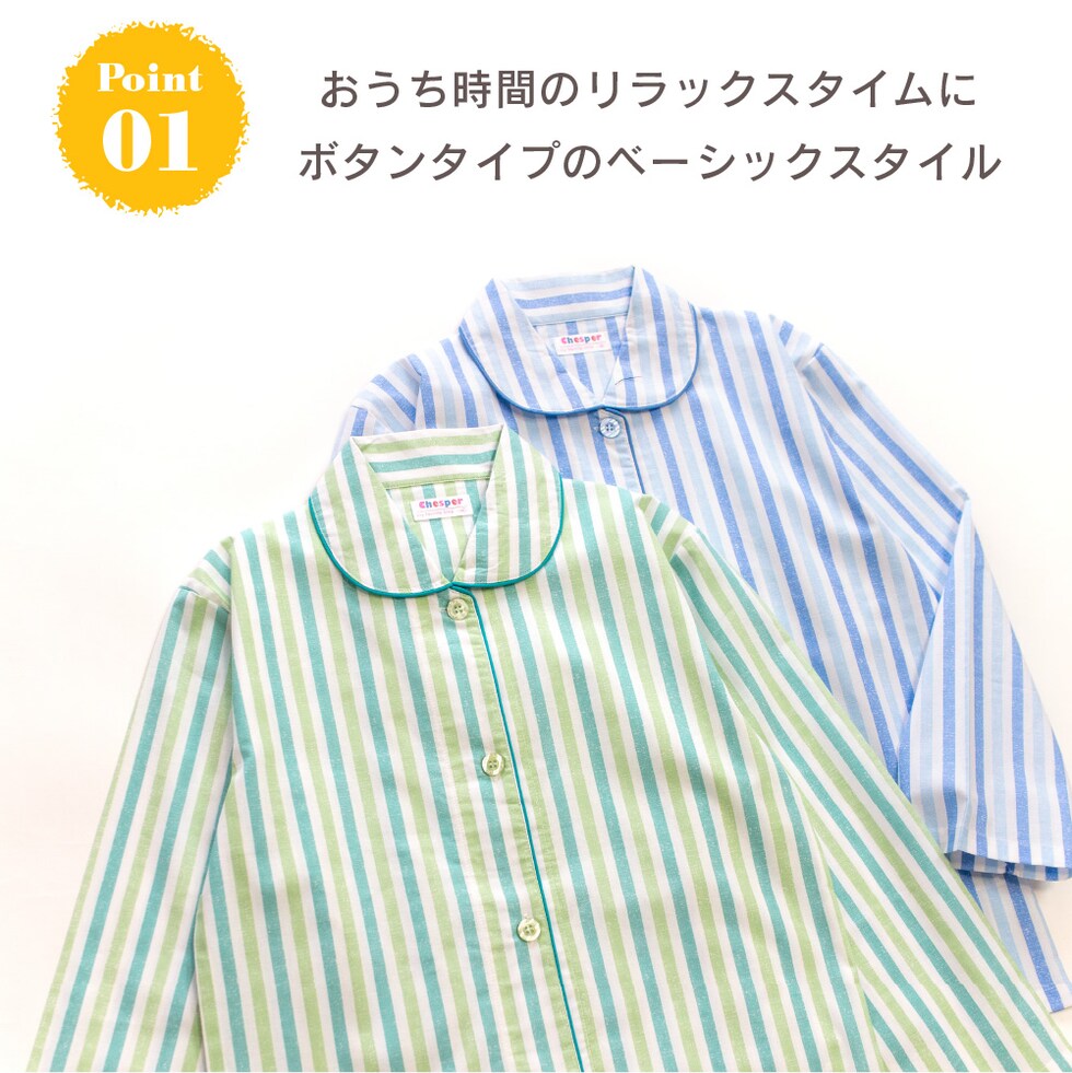 肌にやさしい綿100%がいいね ♪ 肌に直接触れるものだから、安心の天然素材でつくりました。 すっきりとした薄手の生地は軽く風通しもよく、 サラリとした肌触りが気持ちのいいパジャマです。 爽やかなプリントストライプ柄。 明るい気分になる涼しげなブルーとミントの2色です。 このパジャマは大人サイズや半袖も販売中、おそろいリンクコーデが楽しめます。 ▼ 同柄長袖パジャマ ▼ |
