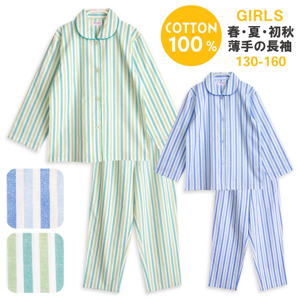 パジャマ キッズ 女の子 綿100% 長袖 春 夏 初秋 前開き ストライプ柄 薄手のシャツ ブルー ミント 100 110 120 130 140 150 160 子供 ジュニア ガールズ かわいい おそろい メール便なら 送料無料