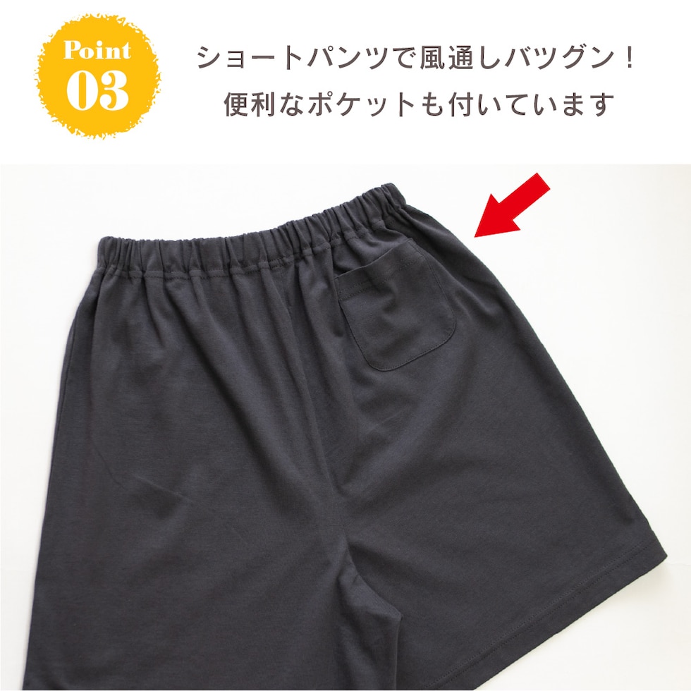 トップス仕様:半袖/前見頃プリント/襟カラーテープ パンツ仕様 :ショートパンツ/後ろポケット/ウエスト総ゴム/ゴム取替口 |