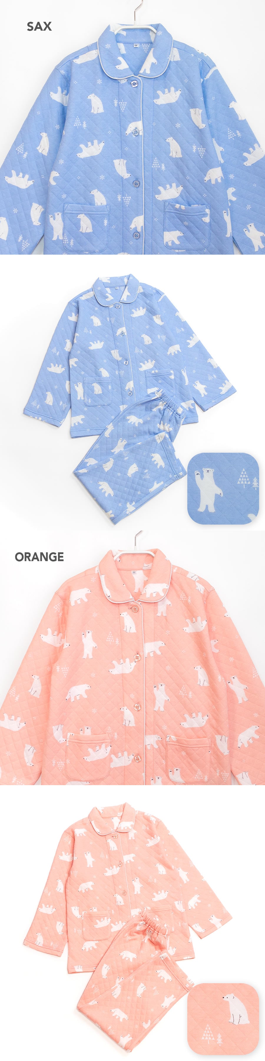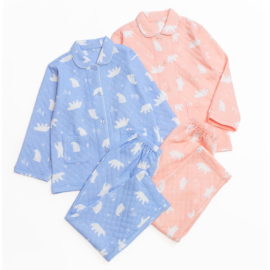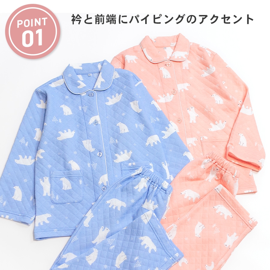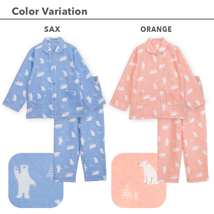 パジャマ キッズ 女の子 内側が綿100% 長袖 冬 ふんわり柔らかなニットキルト 前開き ボタン シャツ シロクマ柄 サックス オレンジ 120 130 140 150 160 子供 ガールズ ジュニア 親子 おそろい リンクコーデ 81245