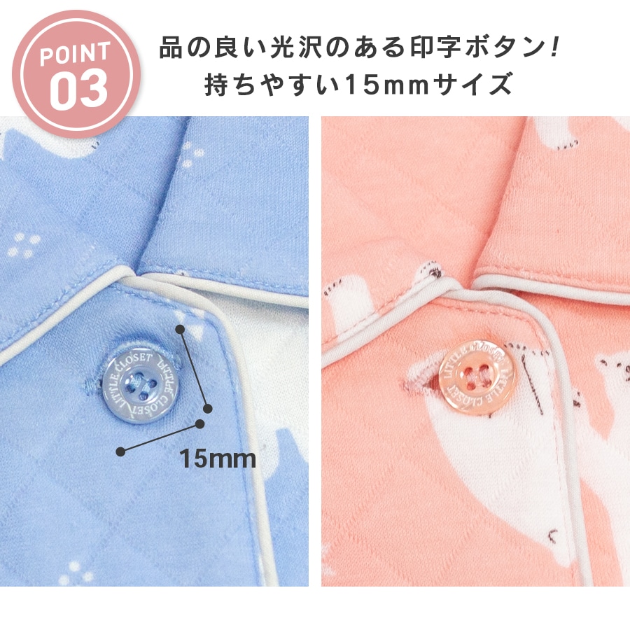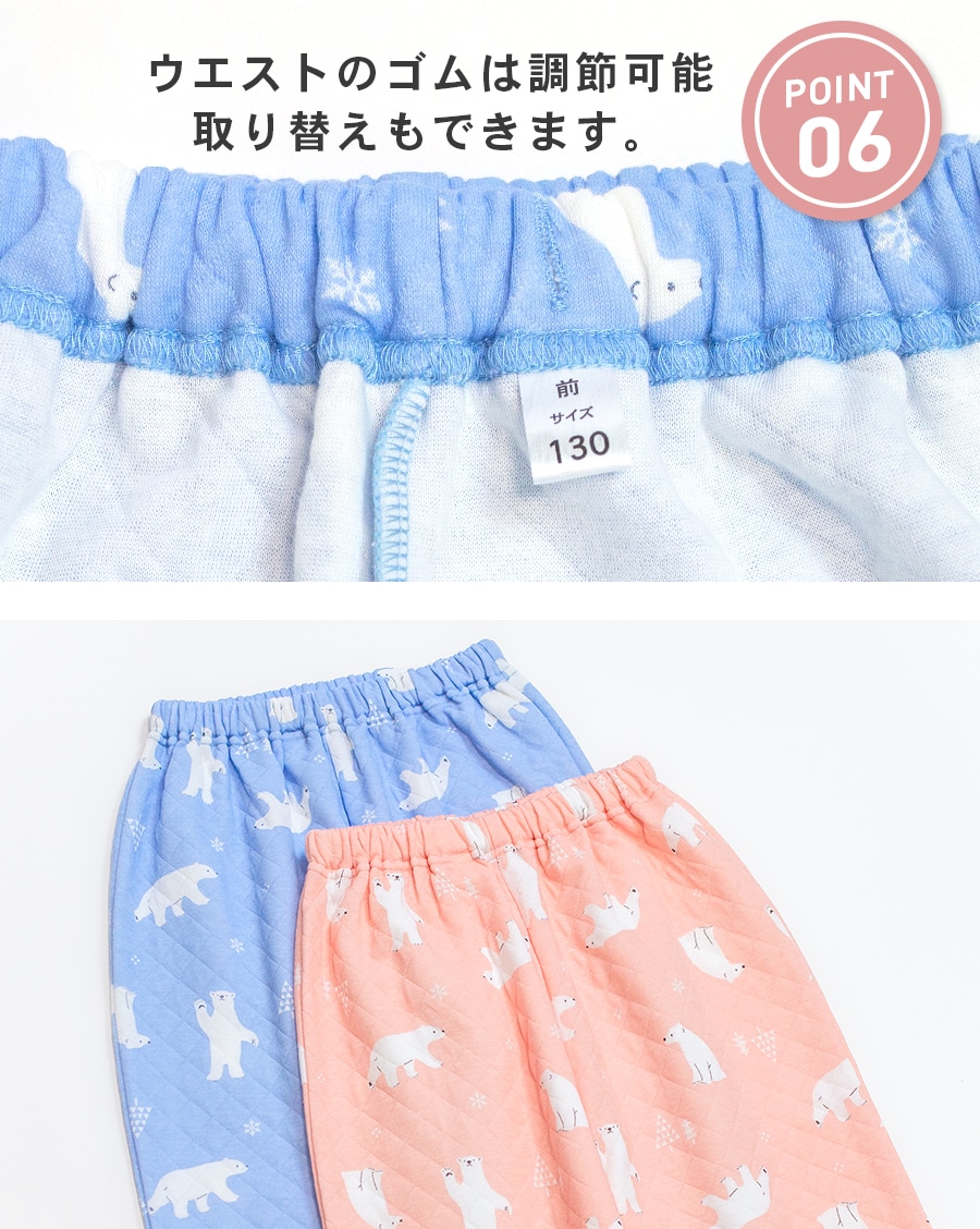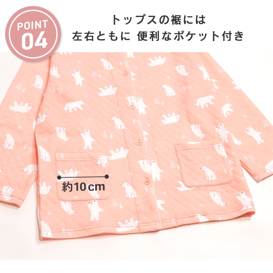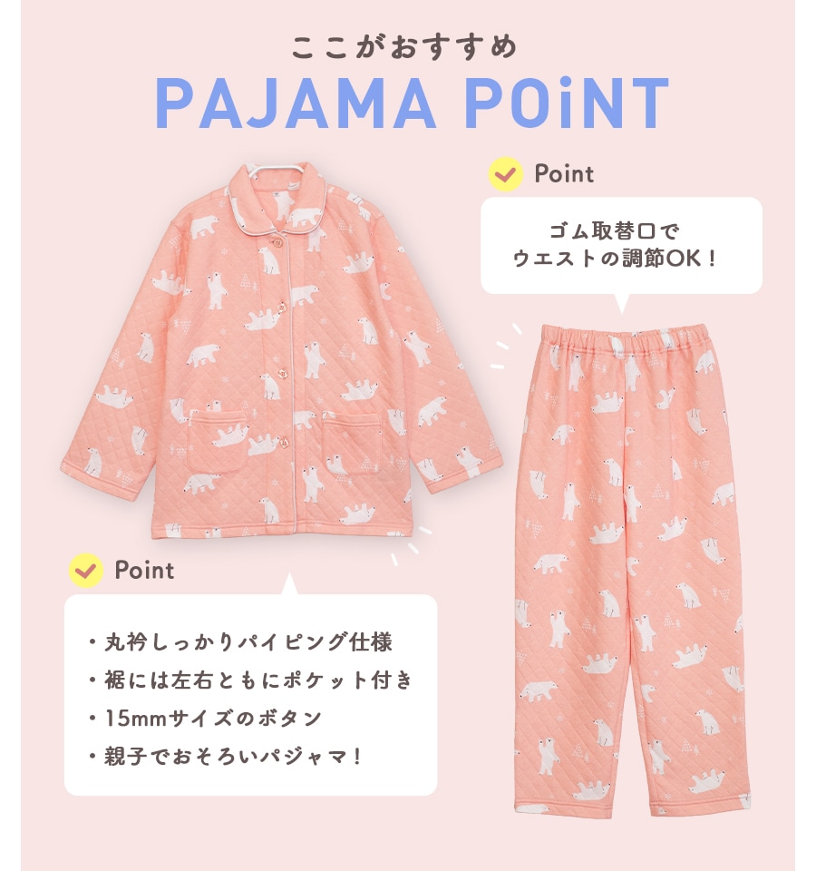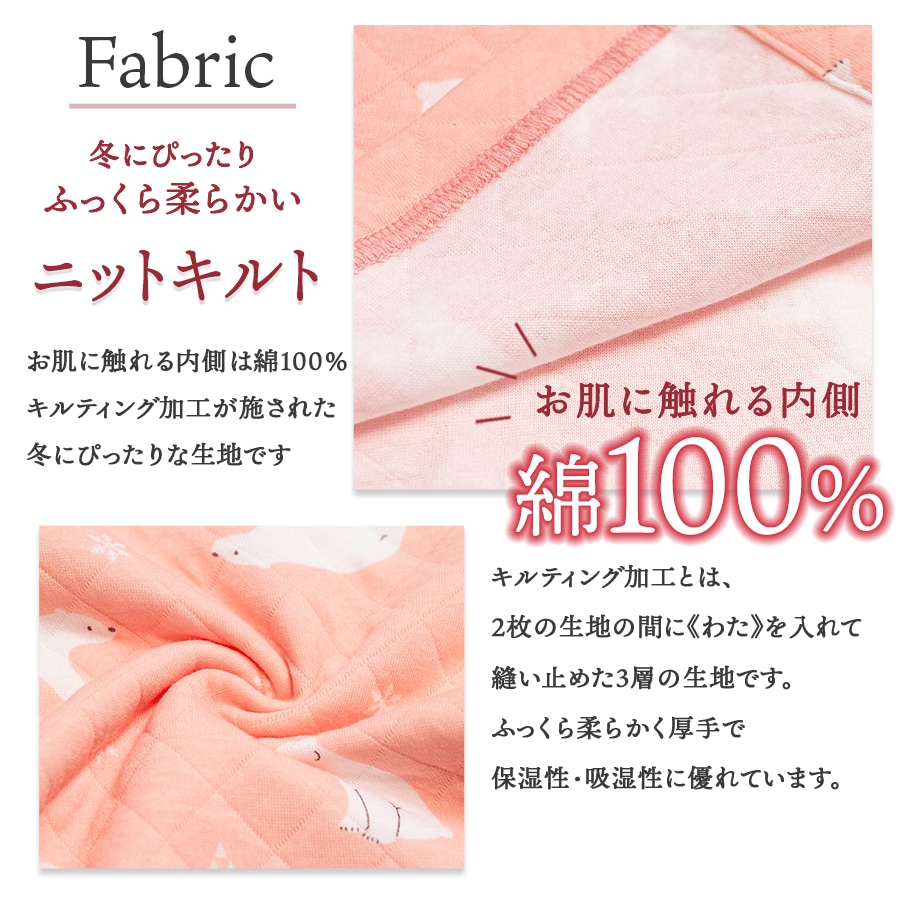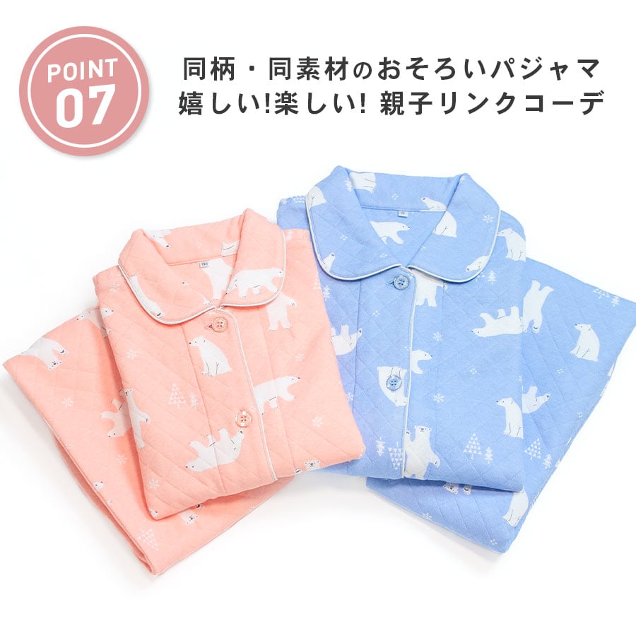 冬にぴったり!ふっくら柔らかいニットキルト 2枚の生地の間に《わた》を入れて縫い止めた3層の生地で、 ふっくら柔らかく厚手で保湿性・吸湿性に優れています。 お肌に触れる内側は綿100%なので、優しい肌触りです。 かわいいパジャマでいい夢を。ふわふわかわいい柄のキルトパジャマ 同柄のレディースパジャマがあるので、親子おそろいリンクコーデが楽しめます。 |