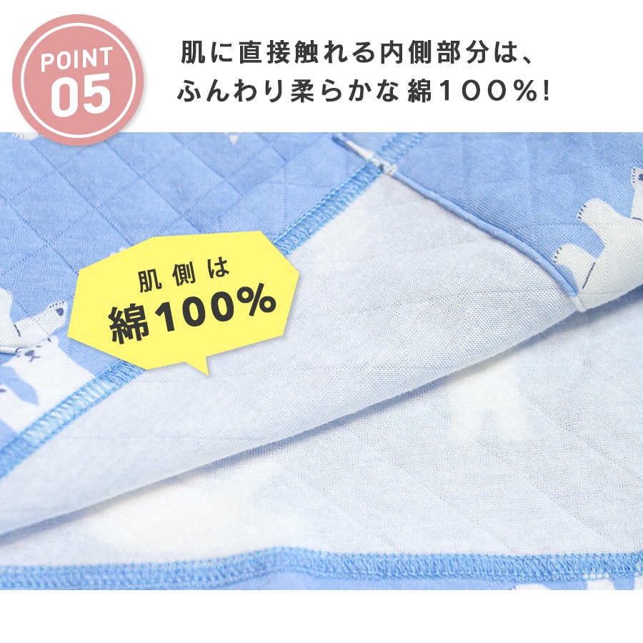 ニットキルト 表側:ポリエステル65%、綿 35% 中綿:ポリエステル100% 裏側:綿100% |