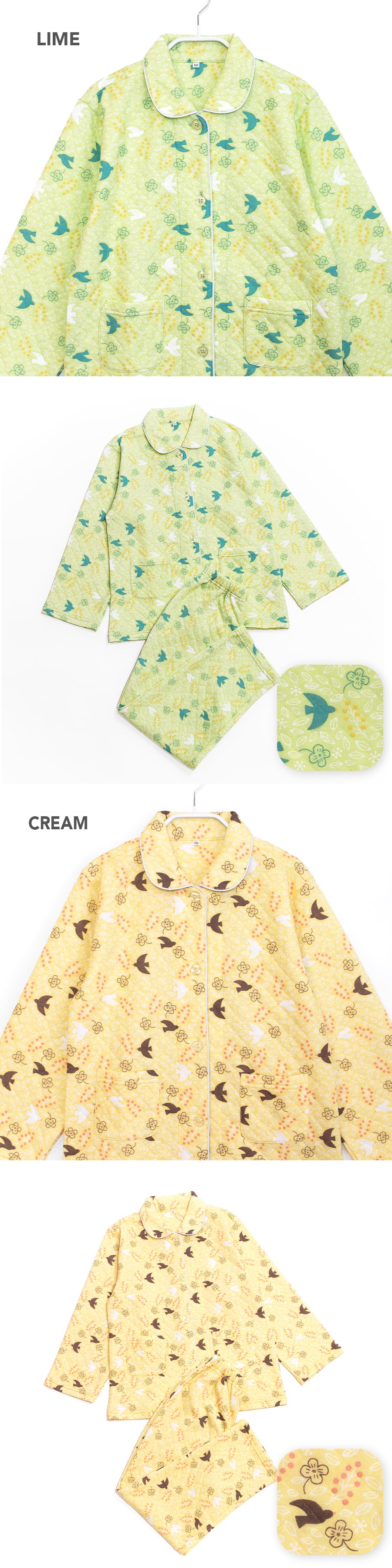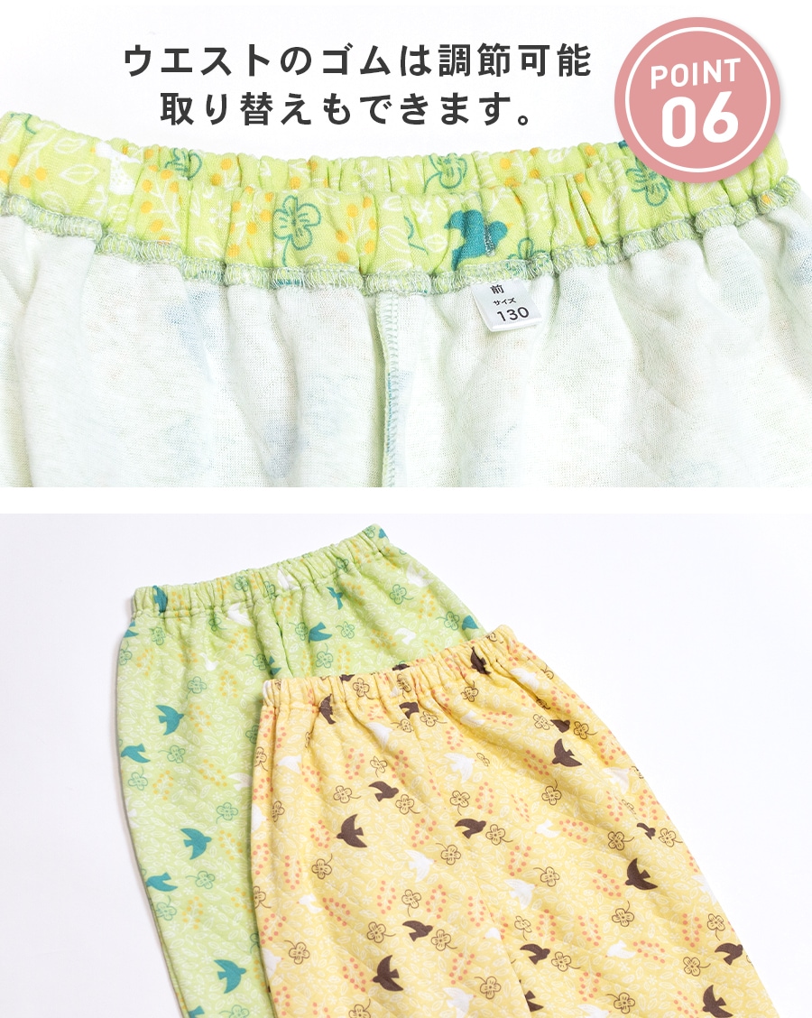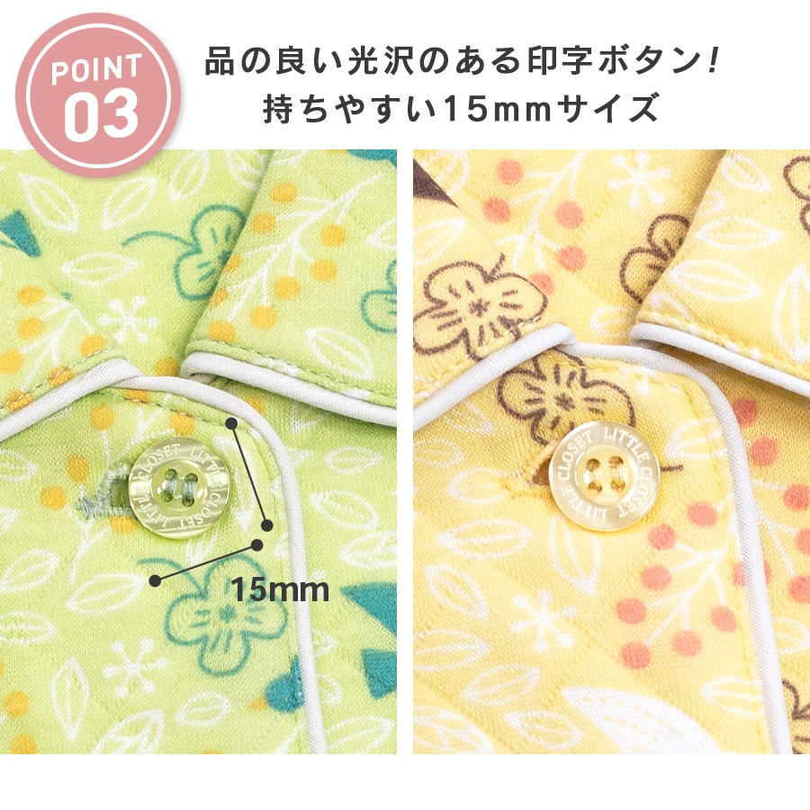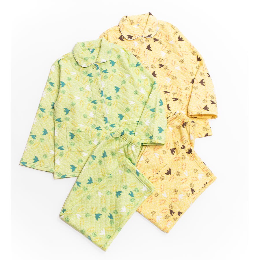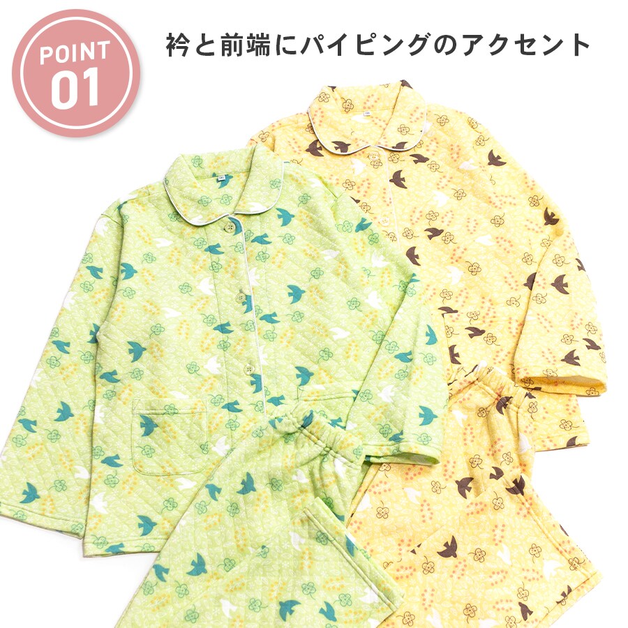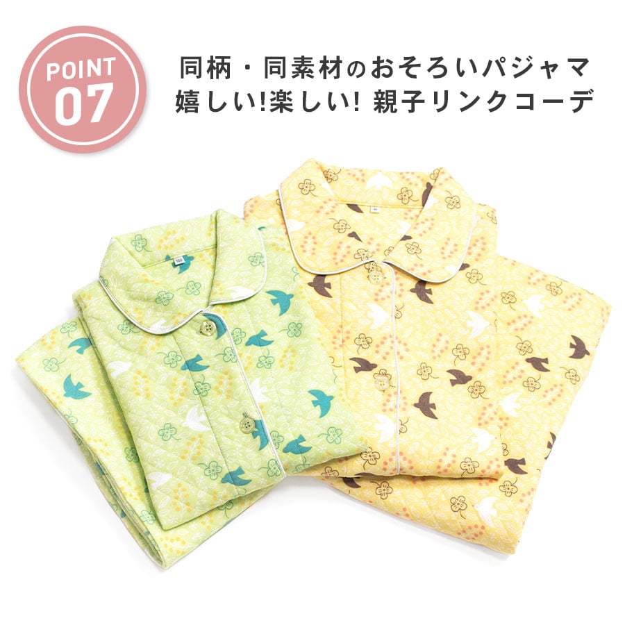 パジャマ キッズ 女の子 内側が綿100% 長袖 冬 ふんわり柔らかなニットキルト 前開き ボタン シャツ 小鳥柄 ライム クリーム 120 130 140 150 160 子供 ガールズ ジュニア 親子 おそろい リンクコーデ 81249