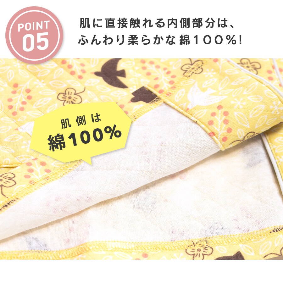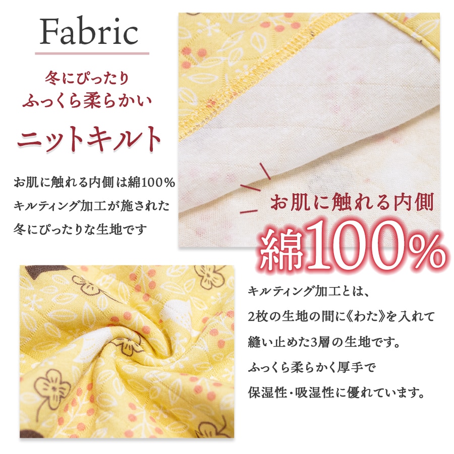 ニットキルト 表側:ポリエステル65%、綿 35% 中綿:ポリエステル100% 裏側:綿100% |
