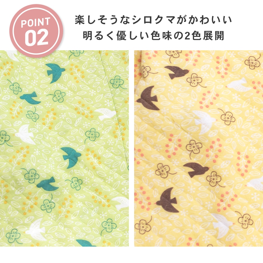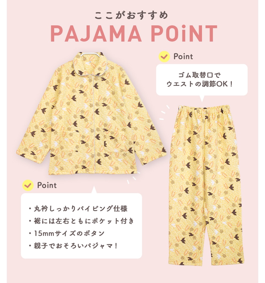 冬にぴったり!ふっくら柔らかいニットキルト 2枚の生地の間に《わた》を入れて縫い止めた3層の生地で、 ふっくら柔らかく厚手で保湿性・吸湿性に優れています。 お肌に触れる内側は綿100%なので、優しい肌触りです。 かわいいパジャマでいい夢を。ふわふわかわいい柄のキルトパジャマ 同柄のレディースパジャマがあるので、親子おそろいリンクコーデが楽しめます。 |