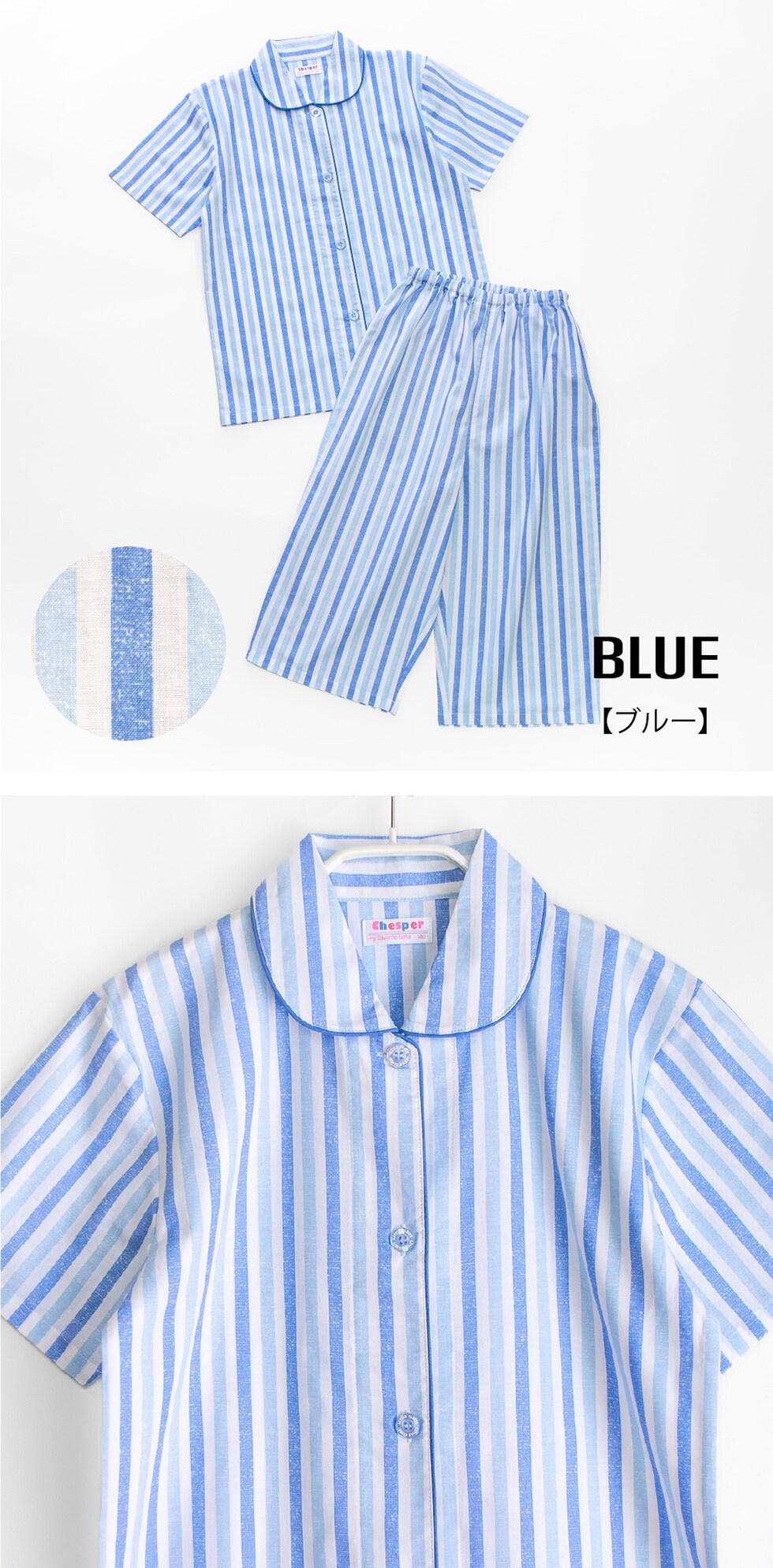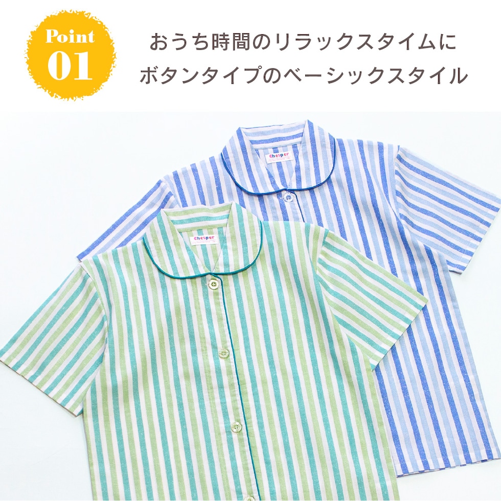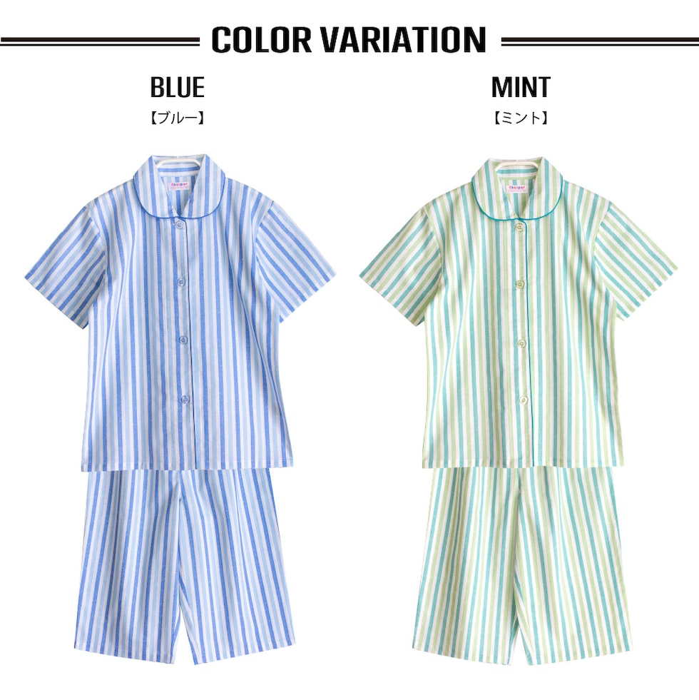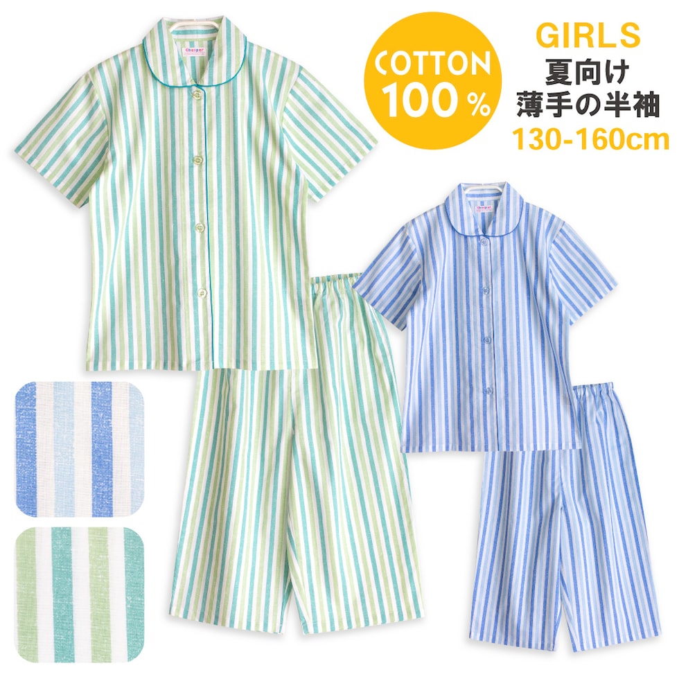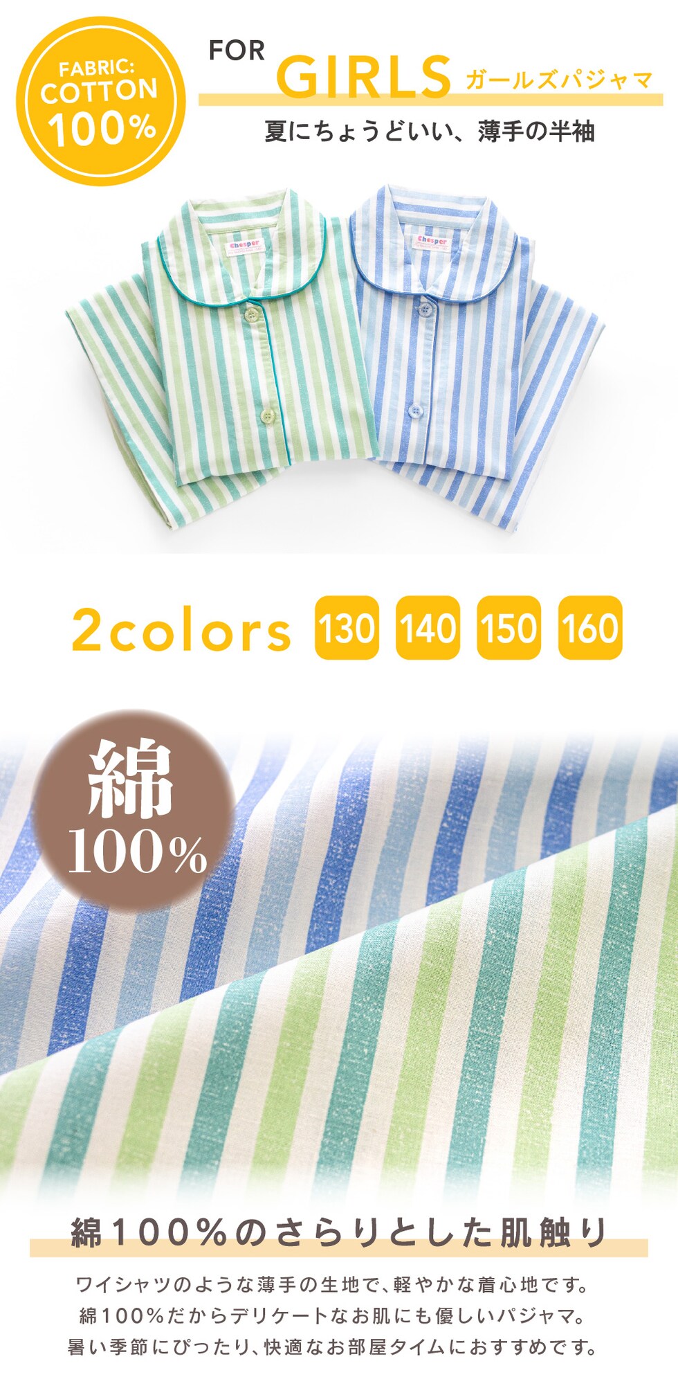 パジャマ キッズ 女の子 綿100% 半袖 夏向け 前開き ストライプ柄 薄手のシャツ ブルー ミント 130 140 150 160 子供 ジュニア ガールズ かわいい おそろい メール便なら 送料無料