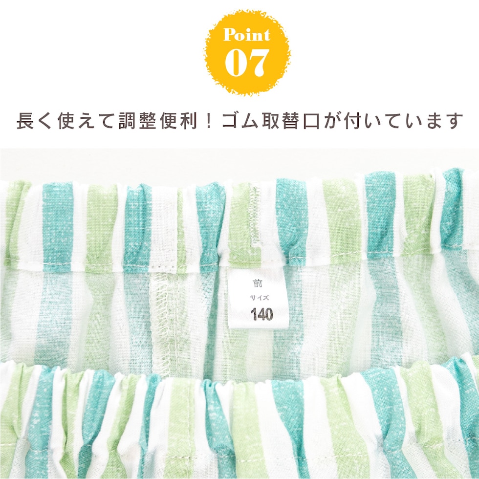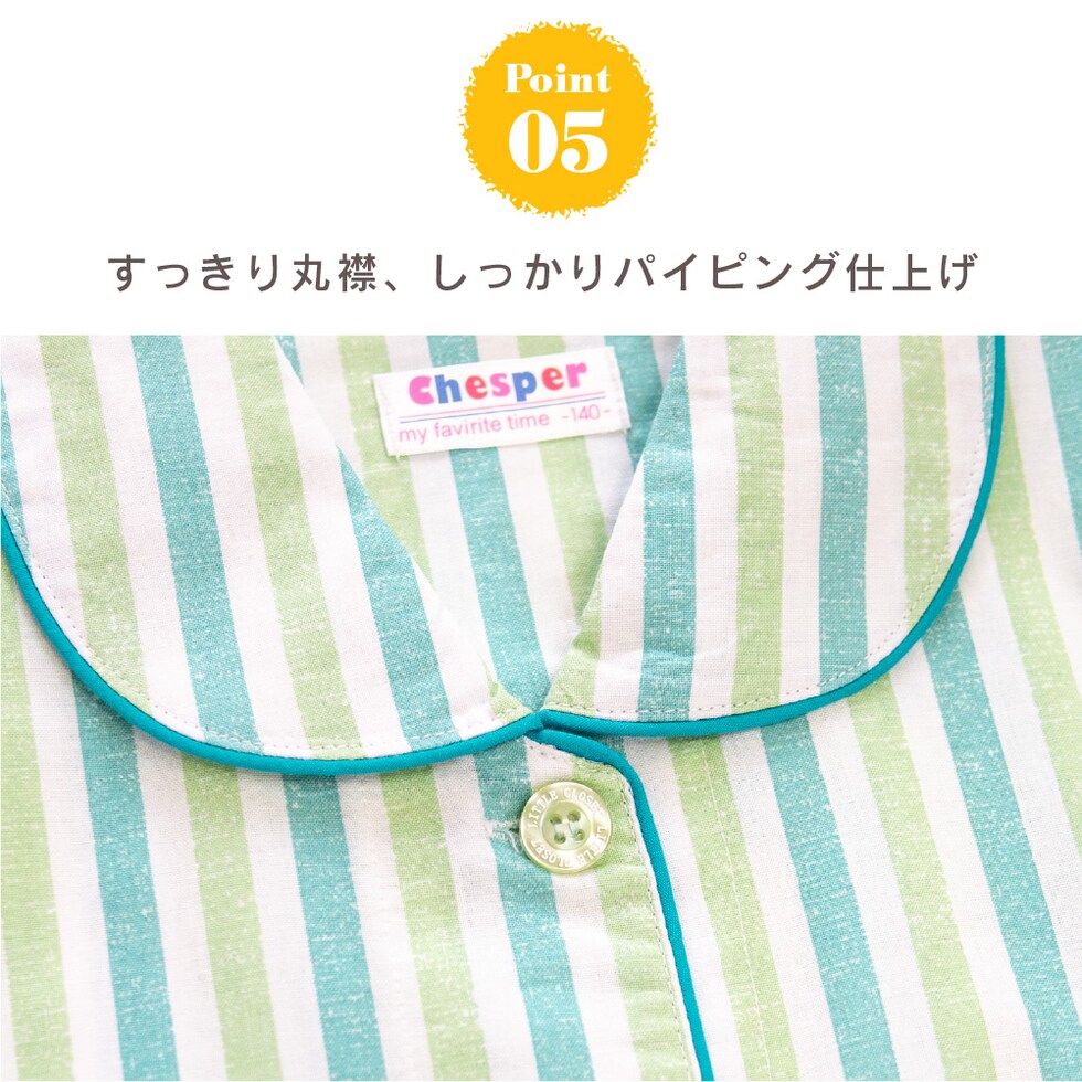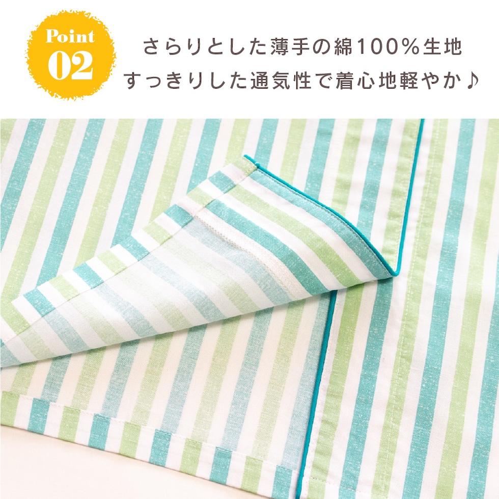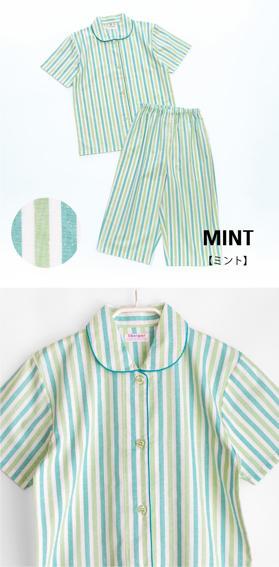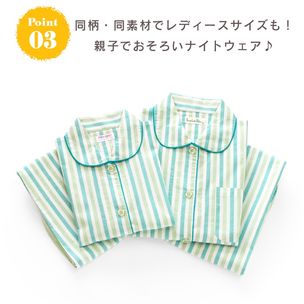 肌にやさしい綿100%がいいね ♪ 肌に直接触れるものだから、安心の天然素材でつくりました。 すっきりとした薄手の生地は軽く風通しもよく、 サラリとした肌触りが気持ちのいいパジャマです。 爽やかなプリントストライプ柄。 明るい気分になる涼しげなブルーとミントの2色です。 このパジャマは大人サイズや半袖も販売中、おそろいリンクコーデが楽しめます。 ▼ 同柄半袖パジャマ ▼ |