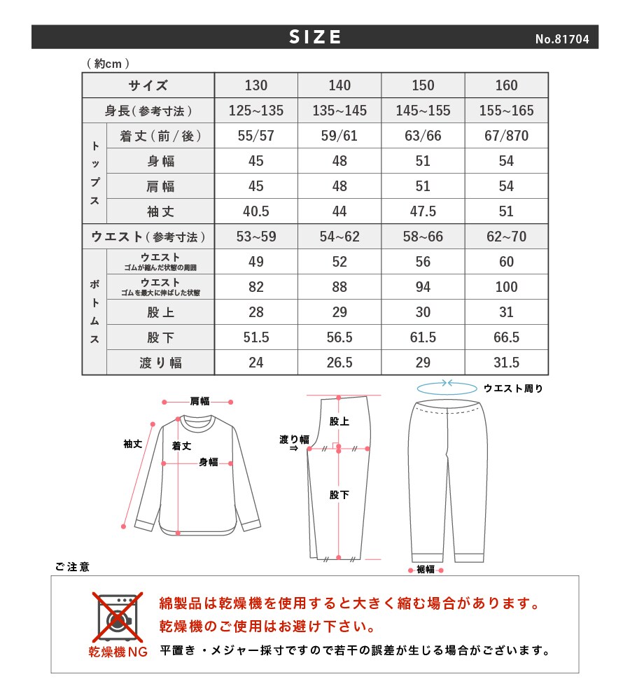 トップス仕様:長袖/ラウンドヘム/衿ぐりリブ/袖口リブ/プリント パンツ仕様 :長パンツ/裾口リブ/ウエスト総ゴム/ゴム取替口 |