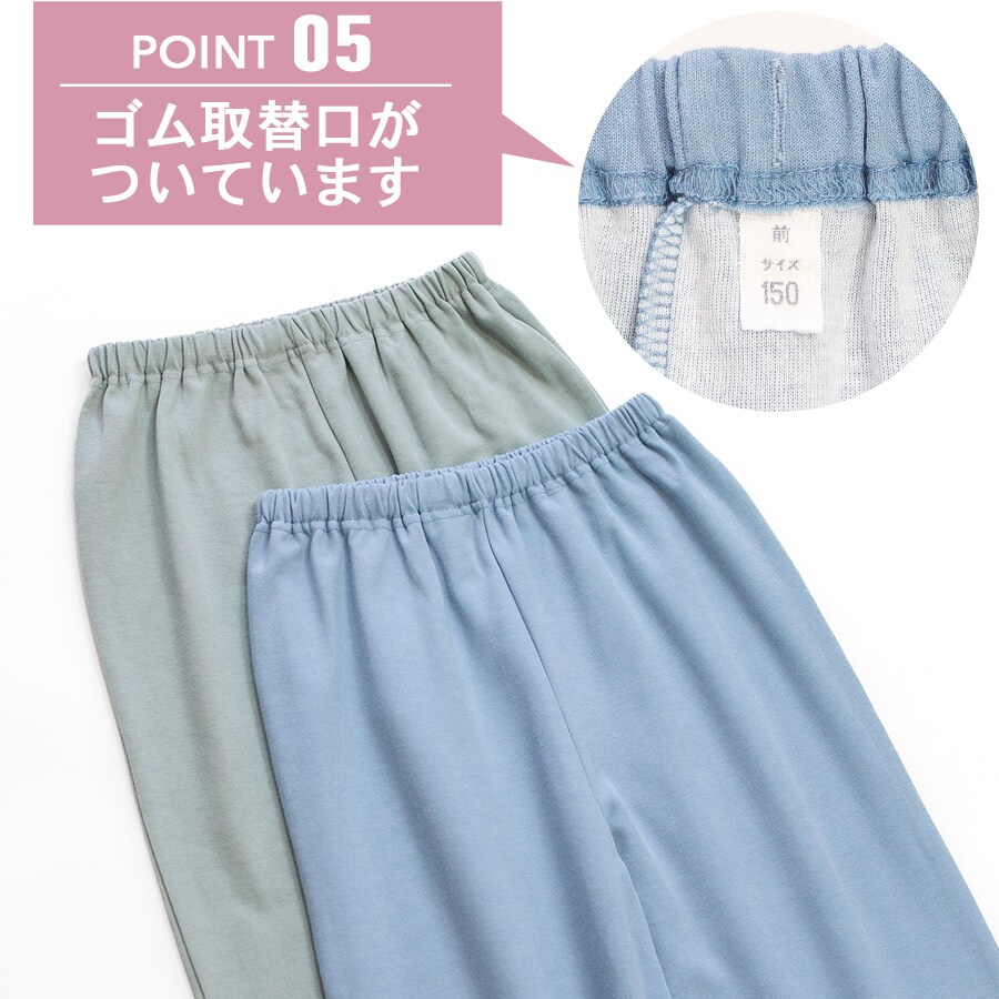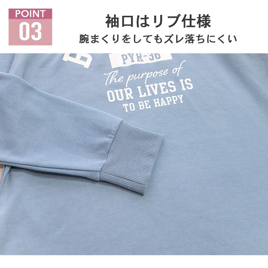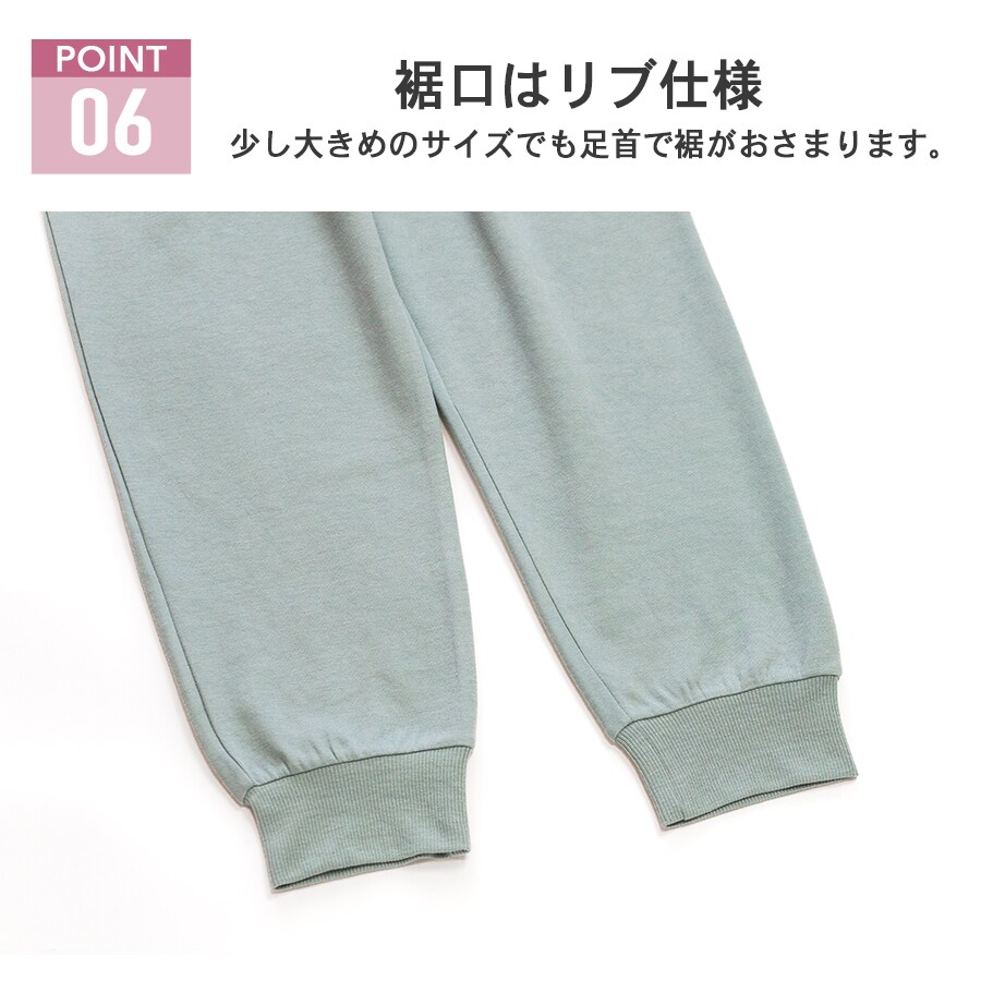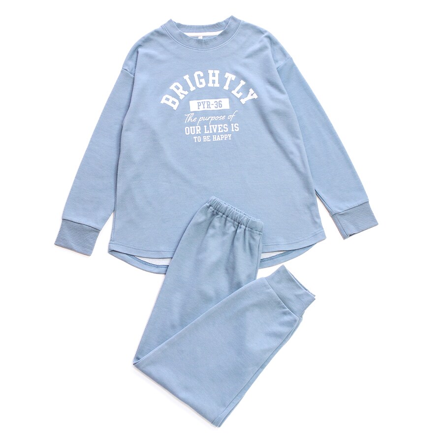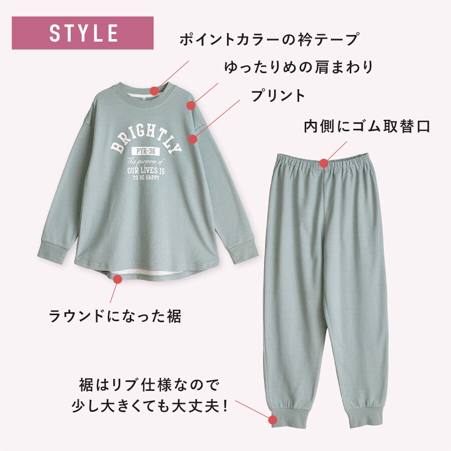 やわらかくて軽く、適度な伸縮性と保温性があります。 おすすめ着用時期は、春・秋です。 少しゆったりめ(※当社製品比)でお尻が少し隠れる長さのラウンドヘム仕様で体のラインを拾いにくく、気になるヒップラインを自然にカバーしてくれます。 かわいいニュアンスカラーのロゴプリントパジャマです。 パンツの裾口はリブなので上にずりあがらず少しサイズが大きめだったとしても足首で裾がおさまります。 |