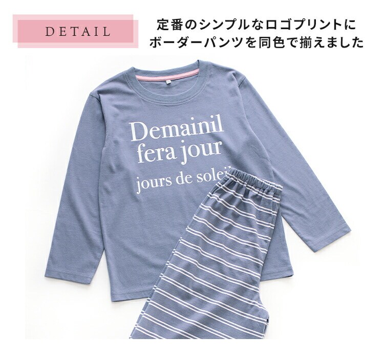 パジャマ キッズ 女の子 綿100% 長袖 春 夏 柔らかく軽い薄手の快適Tシャツ ロゴプリント 7分丈ボーダーガウチョパンツ アッシュピンク ダスティブルー サックス 130 140 150 160 子供 ガールズ ジュニア かわいい 部屋着 ルームウェア メール便 送料無料