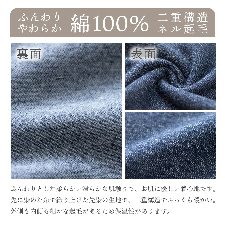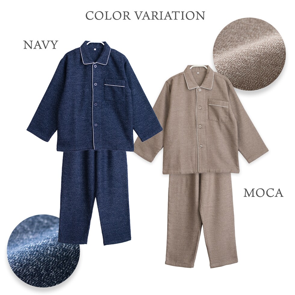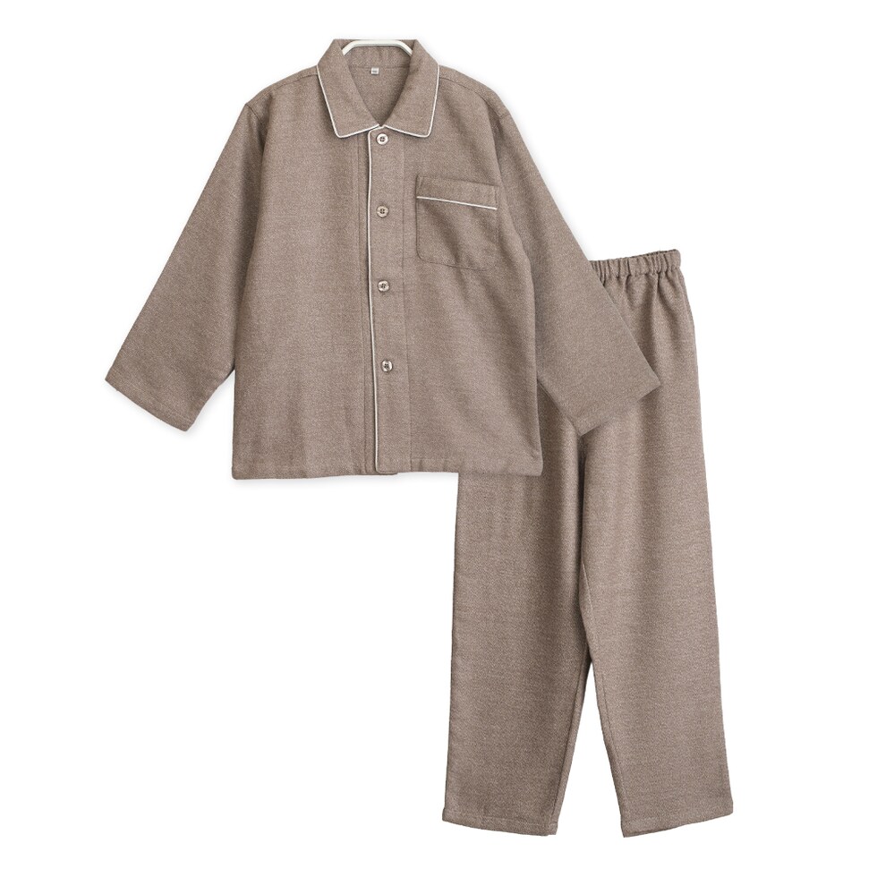 冬に丁度良い綿100% 厚手のネル起毛パジャマ 二重構造でふっくら暖かく、ふんわりとした柔らかい滑らかな肌触りで、お肌に優しい着心地です。 先に染めた糸で織り上げた先染の生地で、外側も内側も細かな起毛があるため保温性があります。 暖かみのある落ち着いた色味の杢調無地生地です。 シンプルなデザインなので年齢を選ばず幅広い年代におすすめです。 キッズ・レディース・メンズで同柄のパジャマがあり、家族おそろいで着ることができます。 |