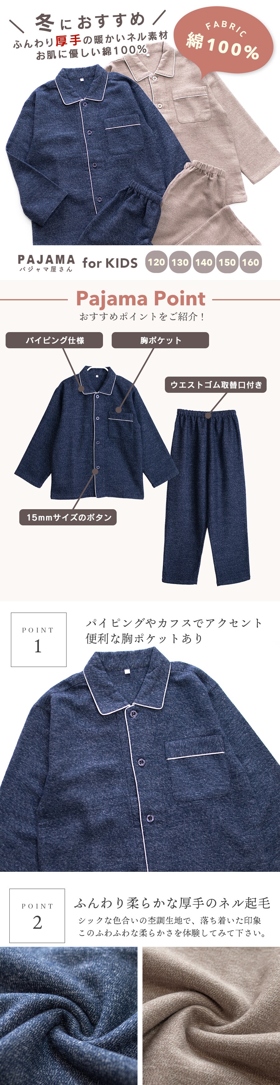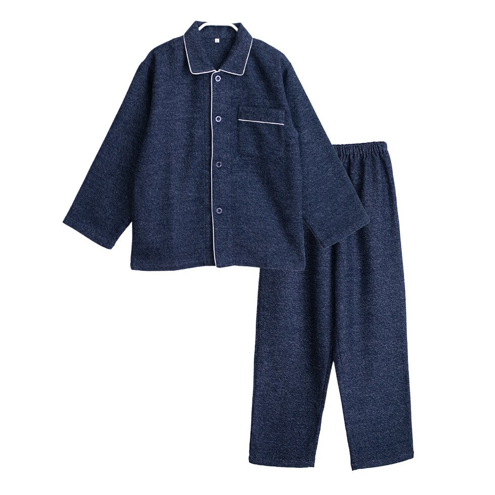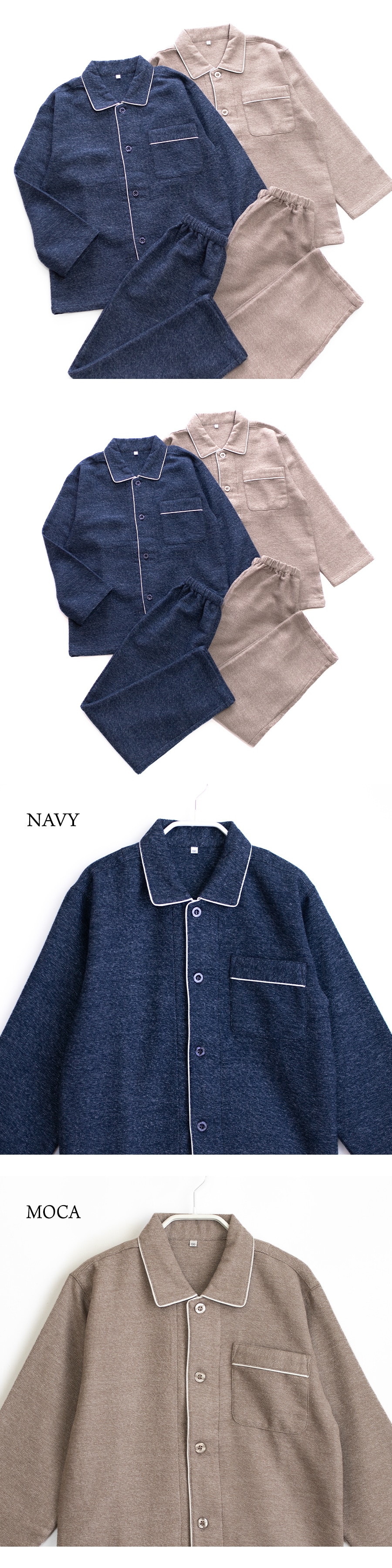 パジャマ キッズ 男の子 女の子 綿100% 長袖 秋 冬 前開き 二重構造 ふっくら暖かい 柔らかい ネル起毛 先染め 杢調 無地 ネイビー モカ 120 130 140 150 160 子供 ジュニア ボーイズ ガールズ 親子 おそろい リンクコーデ 家族 ギフト プレゼント 91985