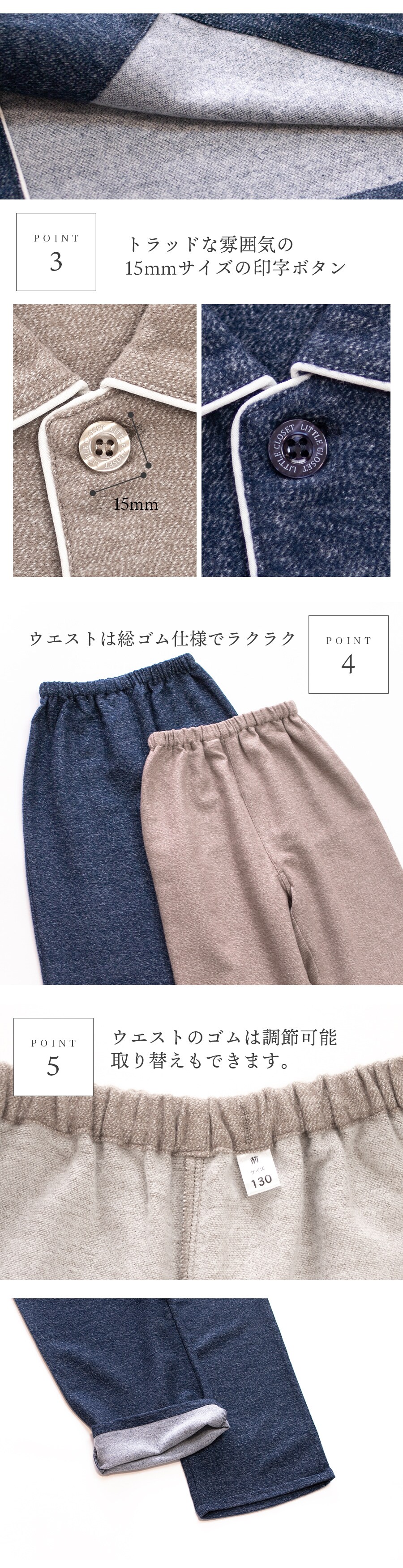 トップス仕様:長袖/角衿/PIPING仕様/胸ポケット パンツ仕様 :長パンツ/ウエスト総ゴム/ゴム取替口 |
