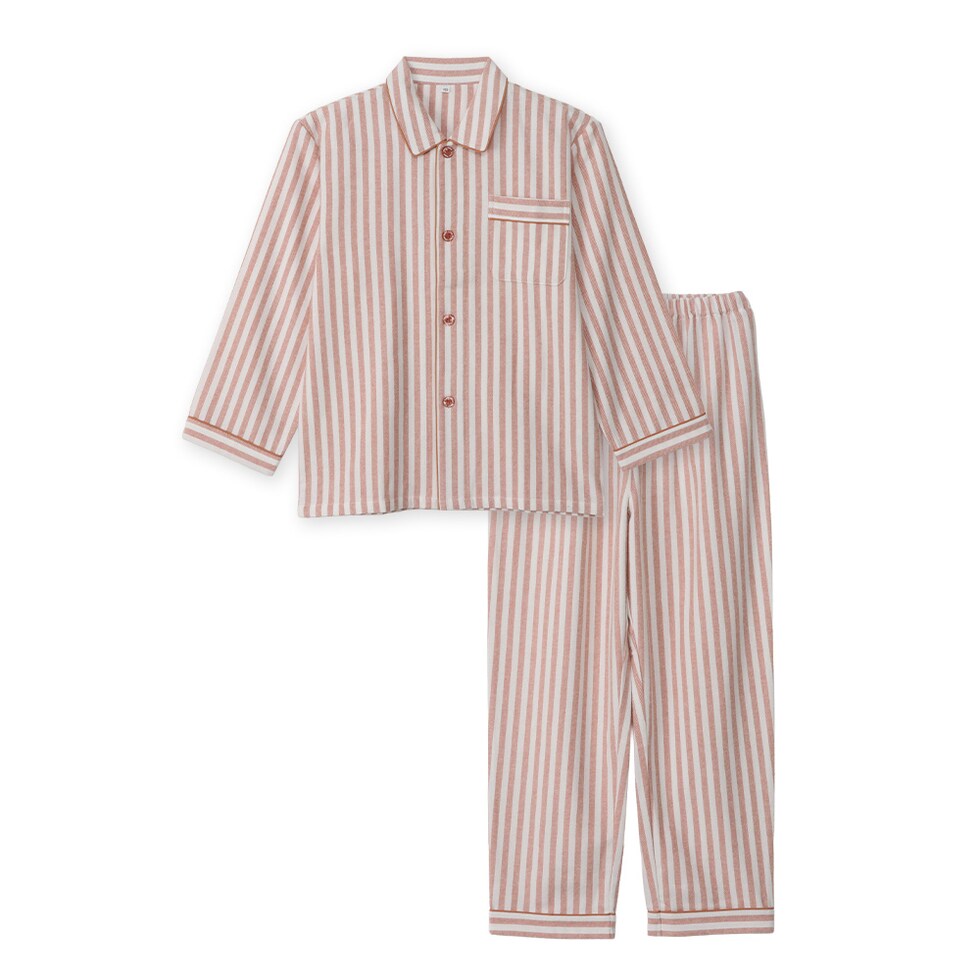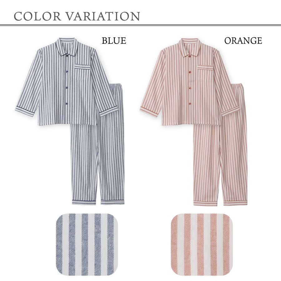 冬に丁度良い綿100% 中厚手のネル起毛 ふんわりとした柔らかい肌触りで、お肌に優しい着心地です。 先に染めた糸で織り上げた先染の生地で、細かな起毛があるため保温性があります。 暖かみのある落ち着いた色味のストライプ柄です。 シンプルなデザインなので年齢を選ばず幅広い年代におすすめです。 キッズ・レディース・メンズで同柄のパジャマがあり、家族おそろいで着ることができます。 |