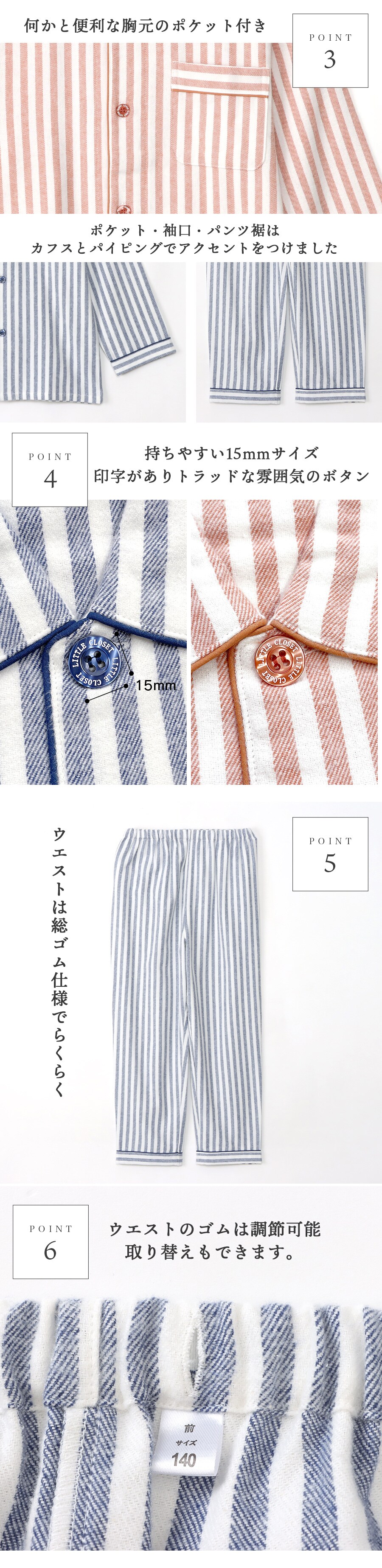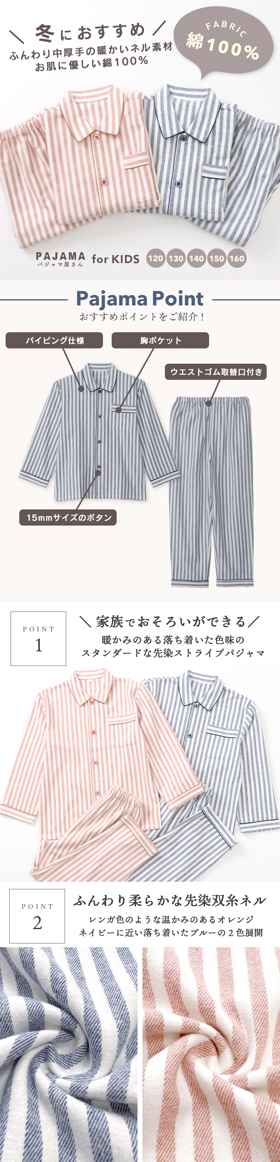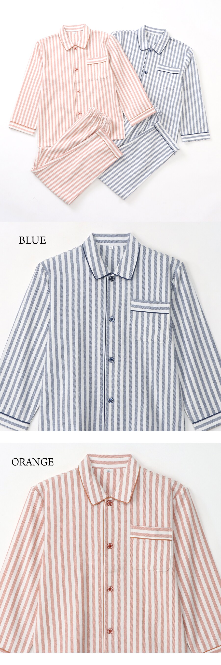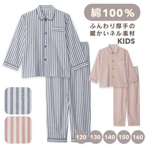 パジャマ キッズ 男の子 女の子 綿100% 長袖 秋 冬 前開き 中厚手のネル起毛 先染め ストライプ柄 ブルー オレンジ 120 130 140 150 160 子供 ジュニア ボーイズ ガールズ 親子 おそろい リンクコーデ 家族 ギフト プレゼント 91988